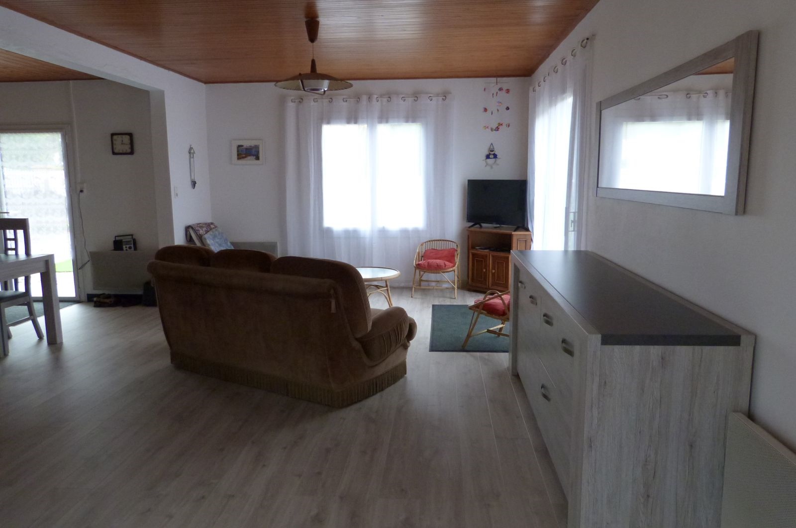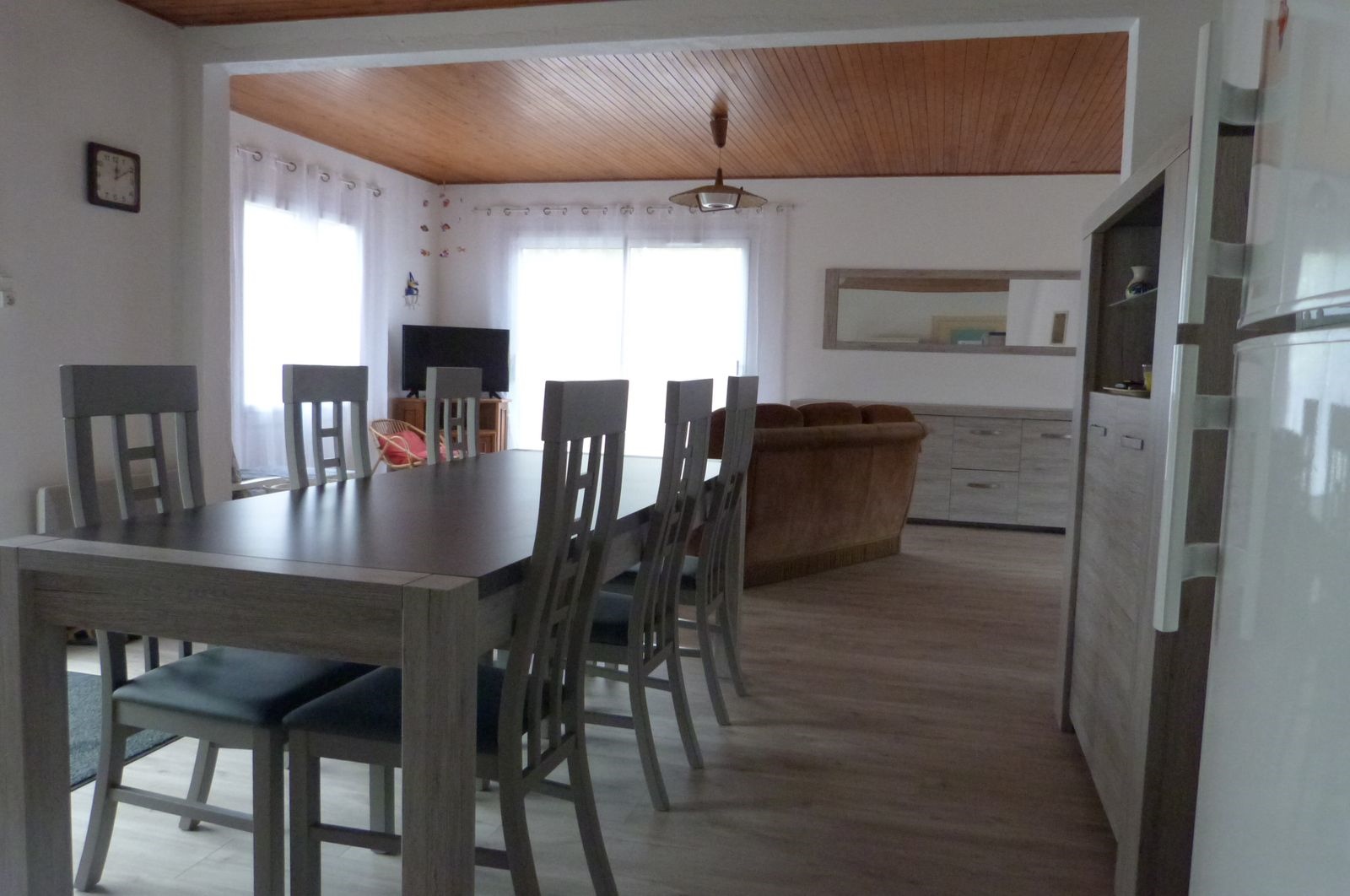 Elle se compose d'une belle pièce de vie lumineuse avec cuisine ouverte sur salon/séjour, possibilité de séparer une partie du séjour pour faire une chambre (1 bz de 140 + 1x90), chambre 1 : 1x140, chambre 2 : 1x140, salle de douche, wc séparé, petit garage pour stocker vélos et matériels de plage, jardin sablonneux clos et belle terrasse avec mobilier de jardin, barbecue et pergola, stationnement sur le terrain. Lave-linge, Lave -vaisselle, réfrigérateur avec partie freezer, plaque 4 feux gaz et un four électrique. TV écran plat. Labellisée 2 clés Clévacances. Les Animaux ne sont pas admis.