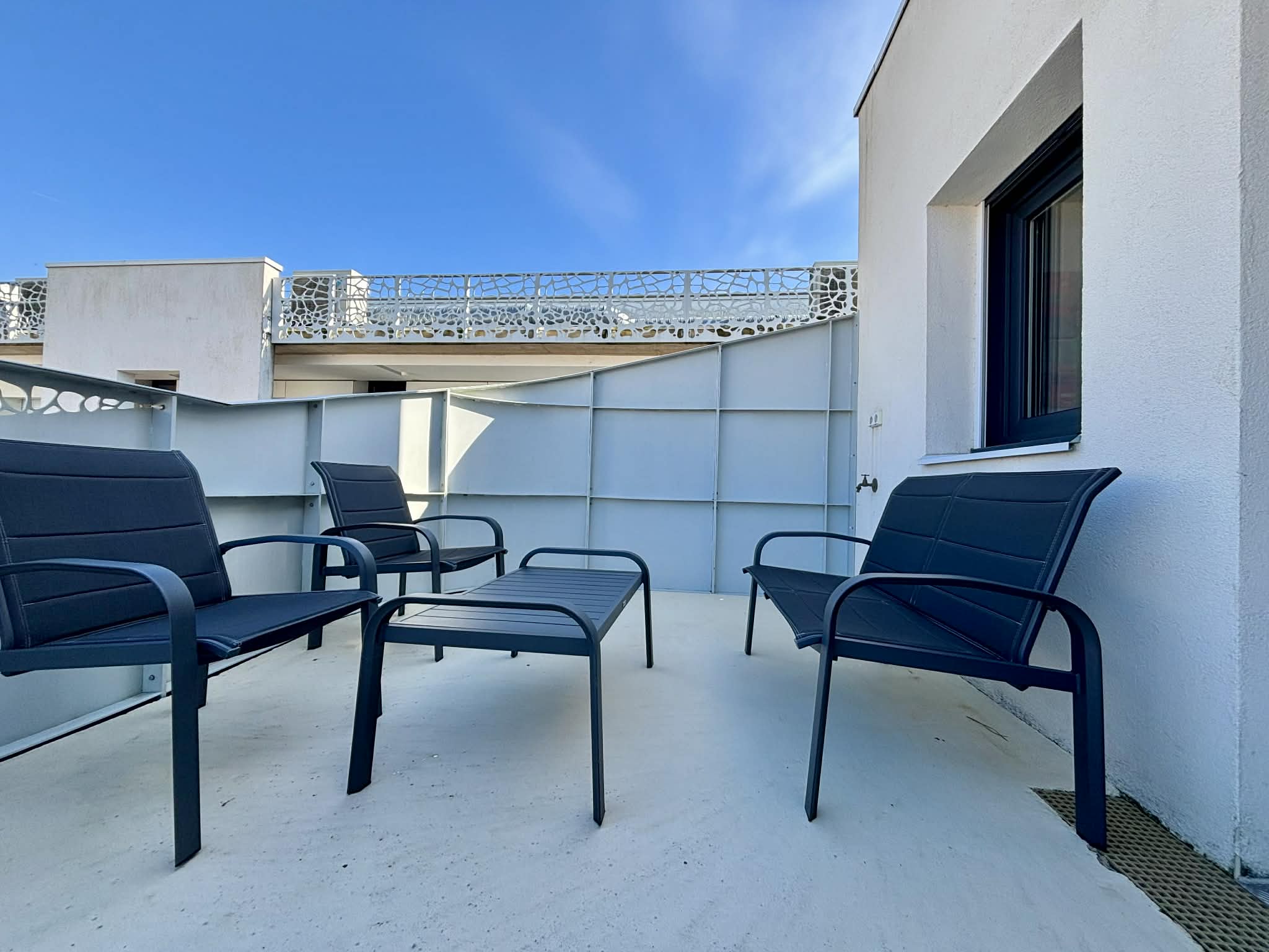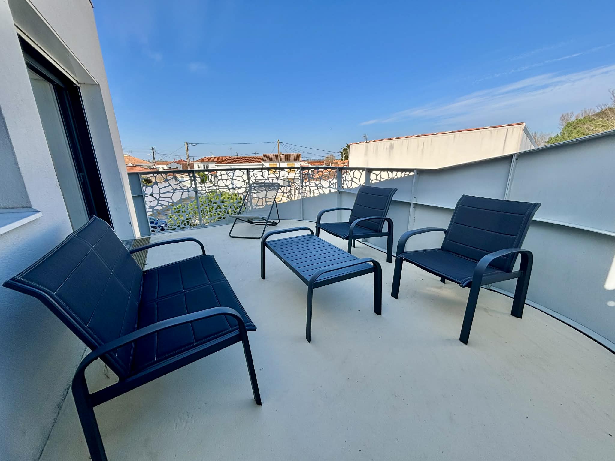 Balcon terrasse avec canapé, chilienne, table et chaises pour les repas.