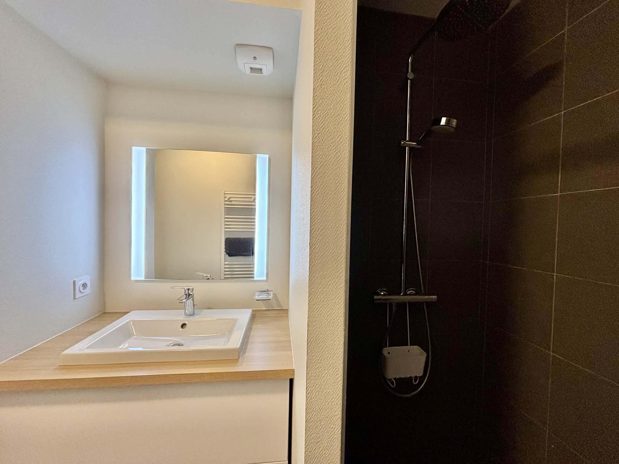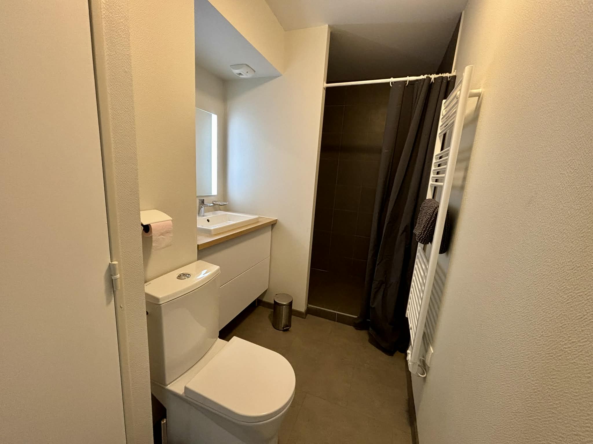 Salle d'eau avec douche à l'italienne, meuble vasque, sèche-serviette et WC,