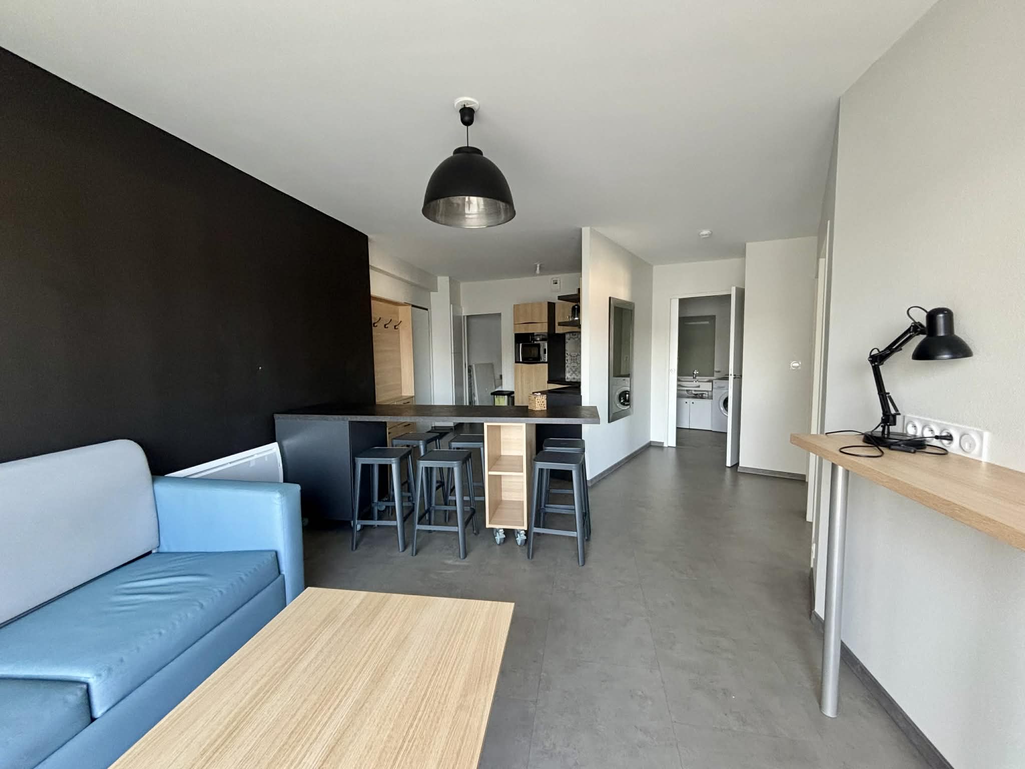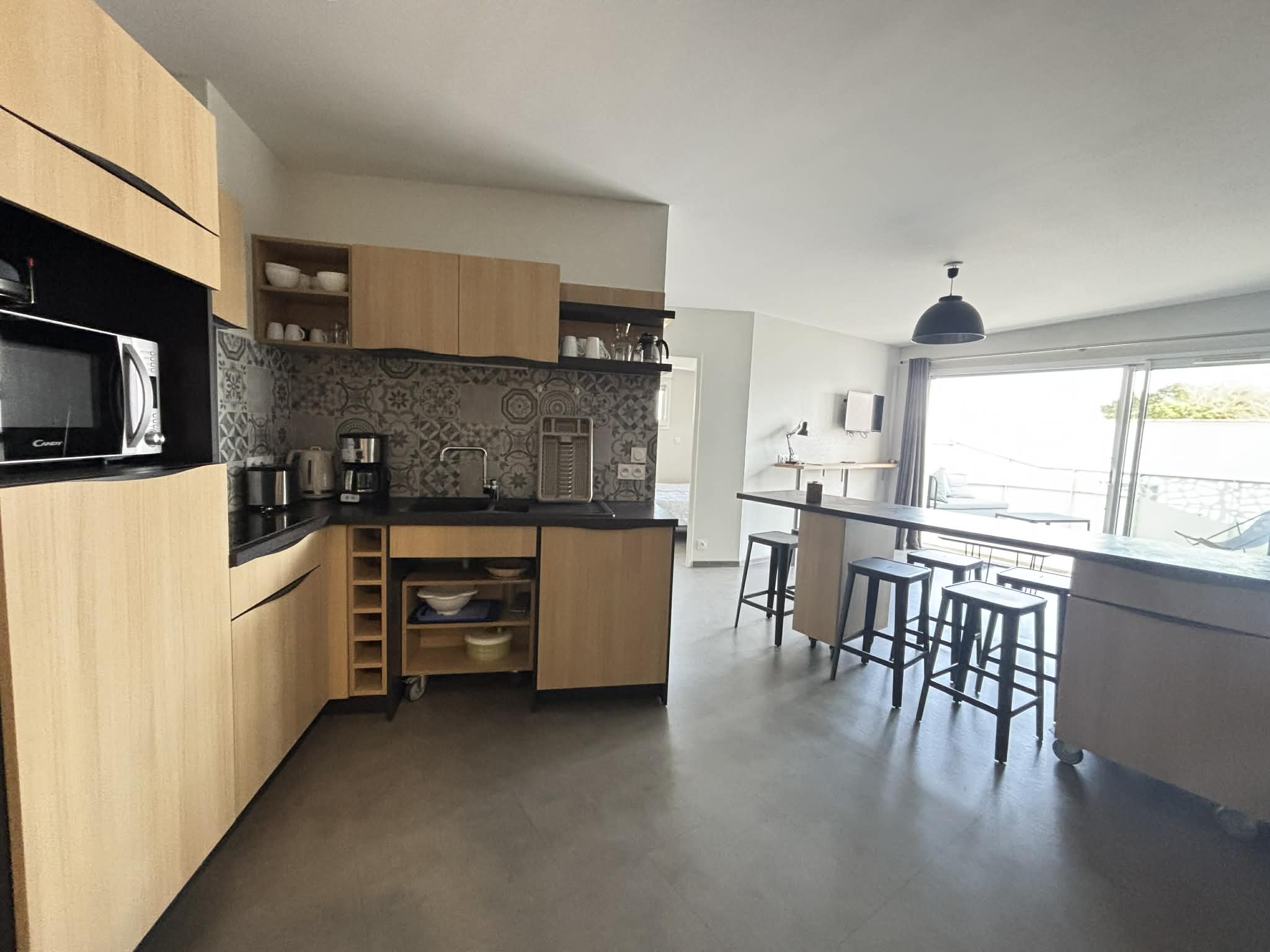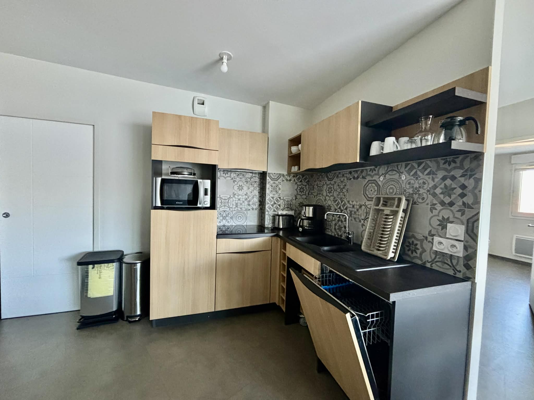 Cuisine équipée et aménagée ouverte (micro-ondes multifonctions, réfrigérateur/freezer, plaque induction, cafetière à filtre, grille-pain, bouilloire, machine à laver),
