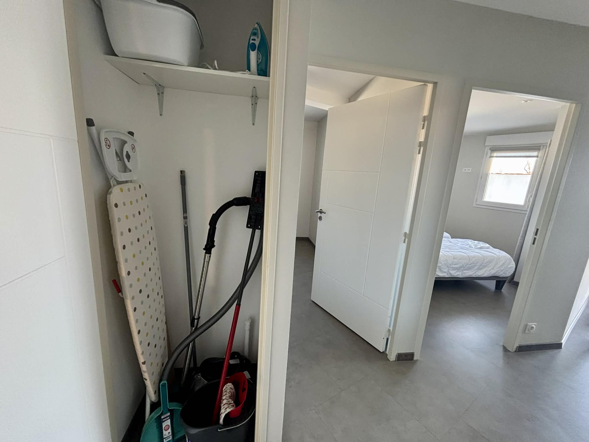Placard de rangement avec nécessaire pour le nettoyage (aspirateur, serpillère, balais),