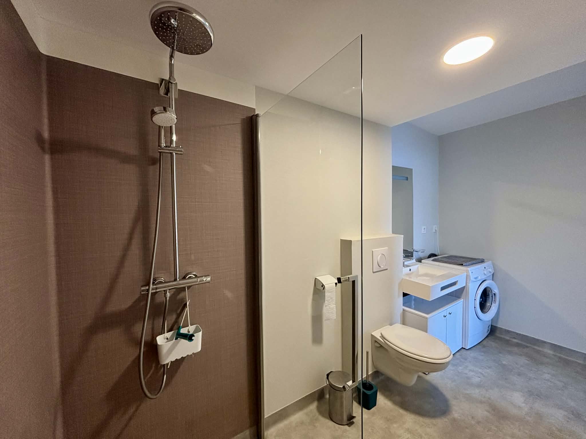 Salle d'eau avec douche à l'italienne, meuble vasque, sèche-serviette et WC,