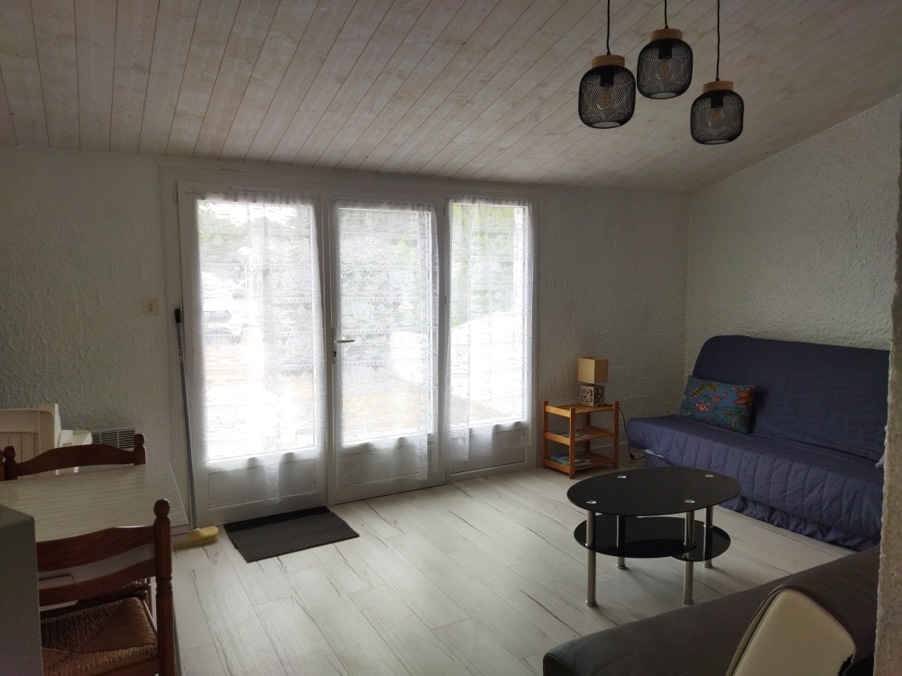 Logement comprenant un coin cuisine équipé (micro-onde réfrigérateur, 4 feux gaz, lave linge) donnant sur le jardin sans vis à vis, un salon/séjour avec 1 clic-clac et un canapé-lit de 140 et TV, 1 grande chambre avec un lit de 140 et une porte fenêtre donnant sur le jardin clos, salle de douche avec lavabo et wc, petit terrain clos devant et derrière avec terrasses, place de parking devant le logement.
