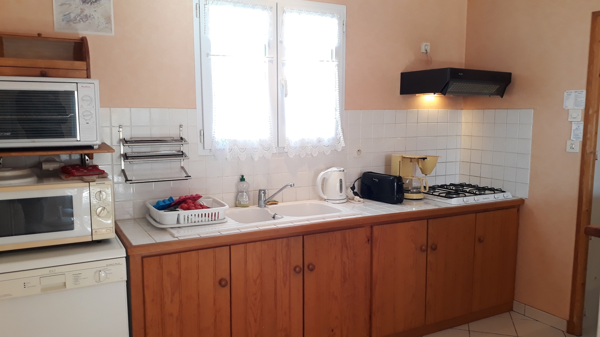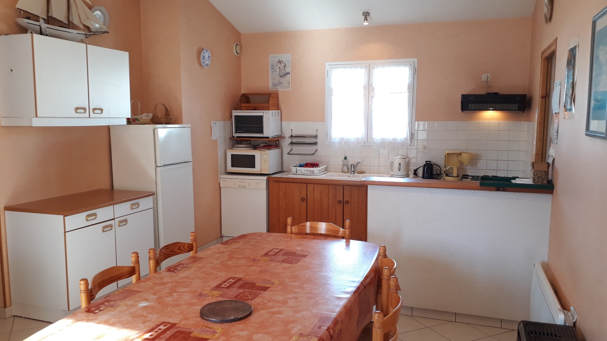 une cuisine ouverte (gazinière-four électrique-réfrigérateur/conservateur) avec lave vaisselle, d'un séjour avec coin salon (télévision), de deux chambres avec chacune 1 lit de 140, d'une troisième chambre avec 2 lits de 90, une salle d'eau, un WC séparé, un cellier avec lave linge donnant accès à la quatrième chambre composée d'un lit de 140 (télévision), d'une salle d'eau avec WC. Le tout sur un jardin clos avec terrasse ensoleillée. Animaux admis