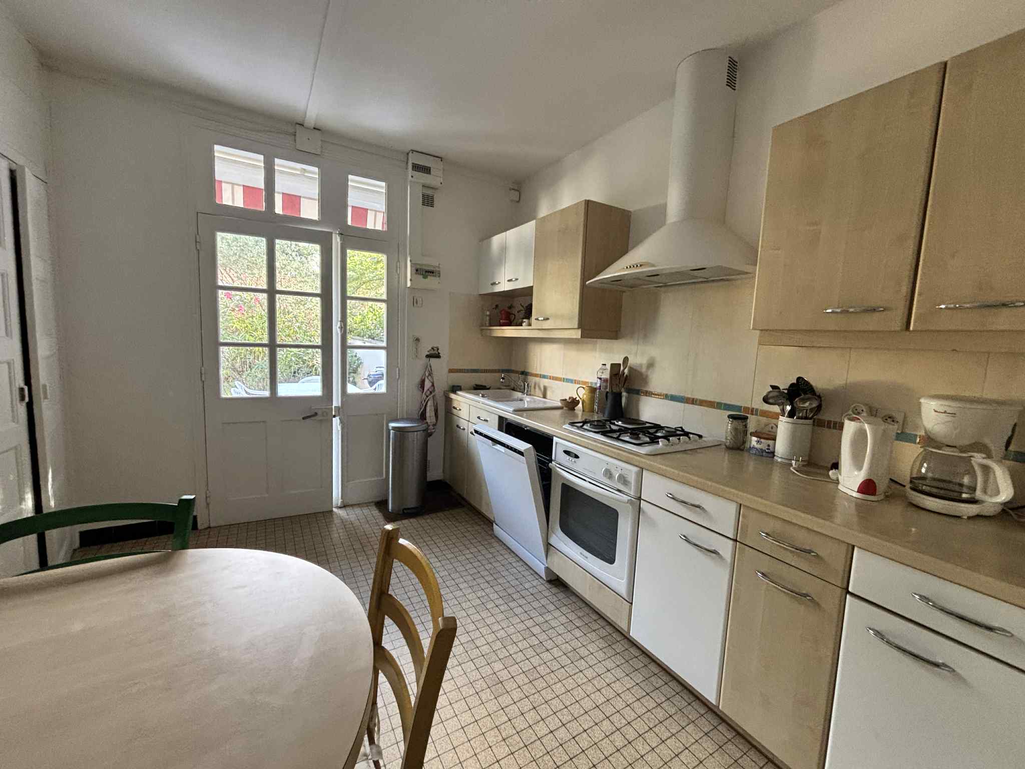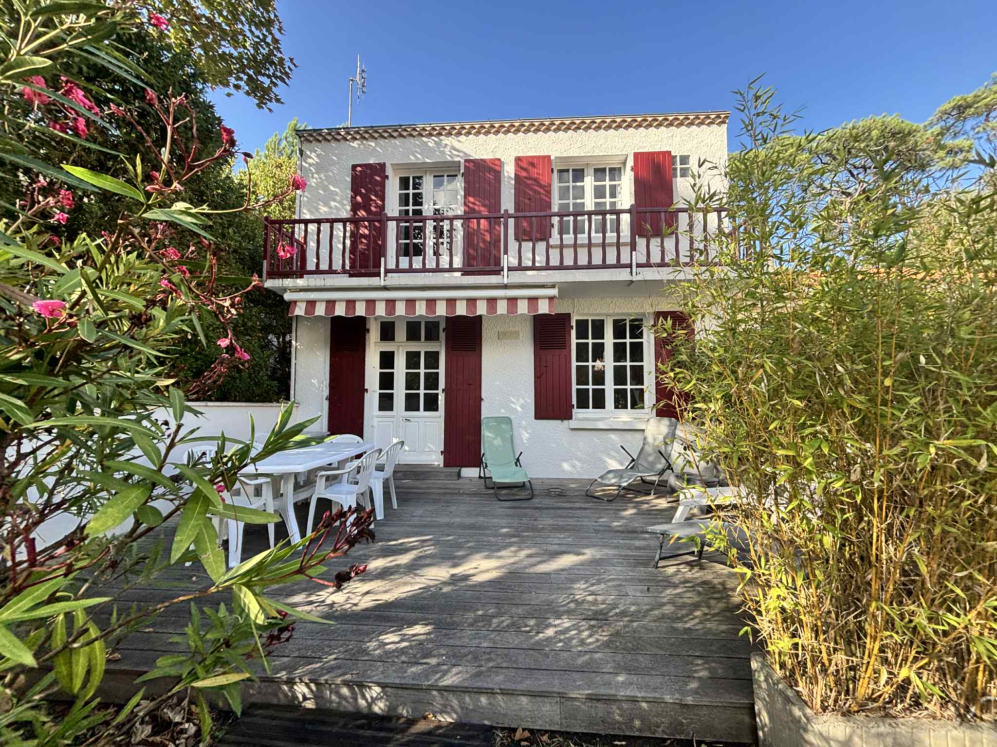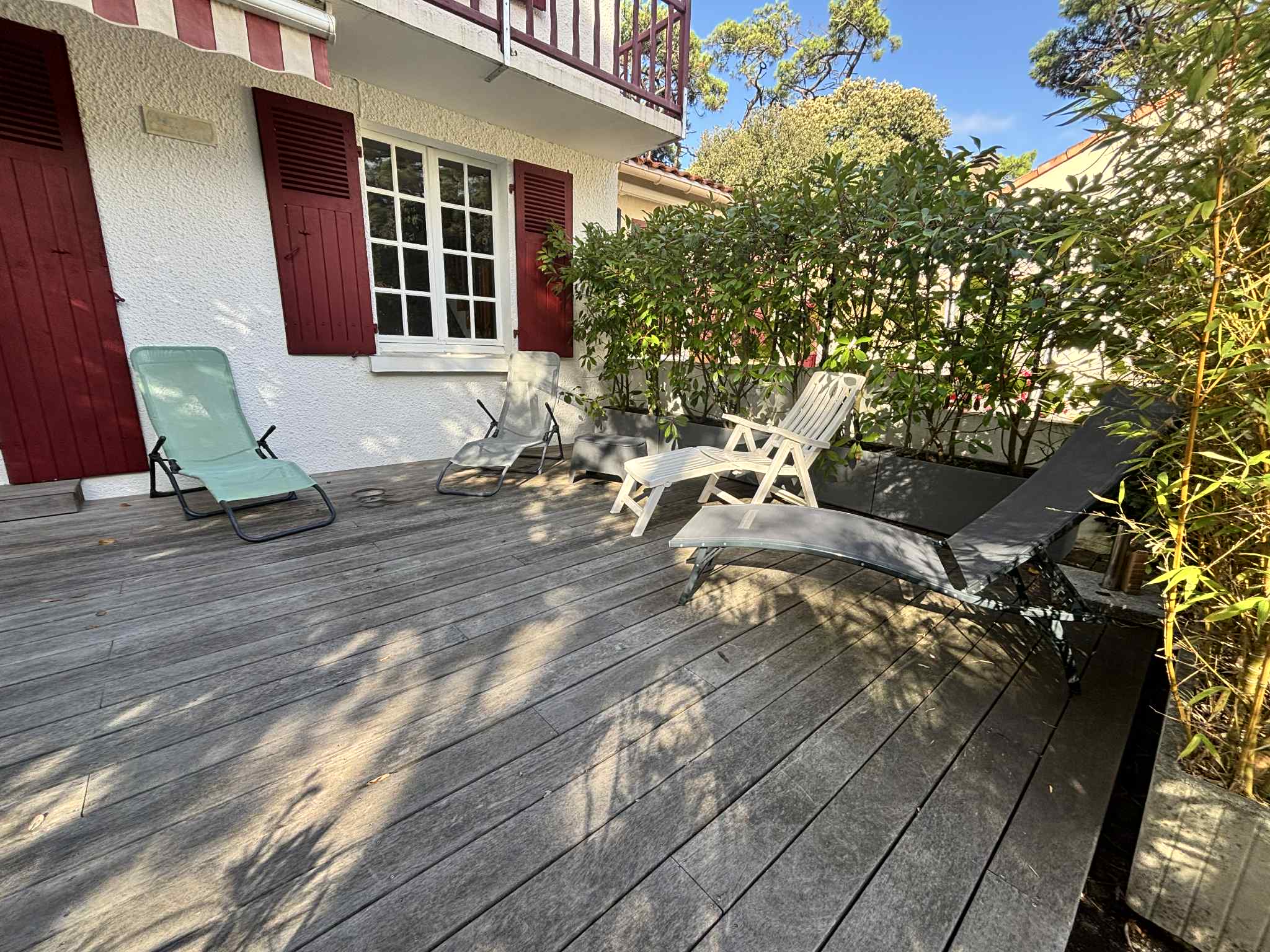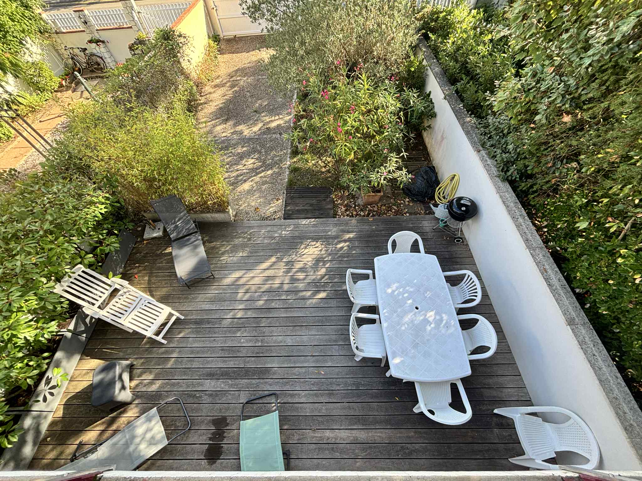 Jolie terrasse en bois avec salon de jardin, barbecue, 1 bain de soleil, 4 transats et store-banne électrique. Jardinet clos avec stationnement,