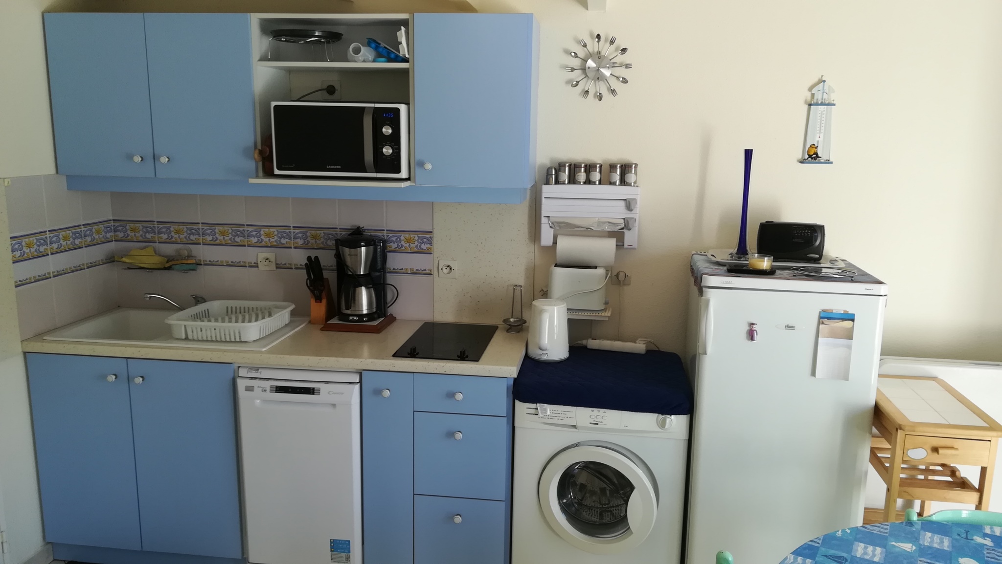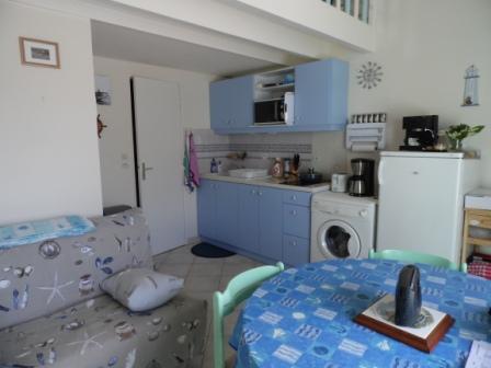 Séjour avec coin cuisine.(2 Pl. vitro. - Réfrigérateur avec partie congélateur - Micro ondes/grill - lave linge - lave-vaisselle) - TV écran plat - canapé clic clac - chambre 1 lit 140 , mezzanine : 2 lits 90 - salle d'eau (Lavabo/douche) , WC indépendants - Terrasse avec store banne, salon de jardin, transats et barbecue électrique (plancha) - jardin clos - Piscine collective (ouverte du 15/06 au 15/09) - parking privatif - Animaux non admis