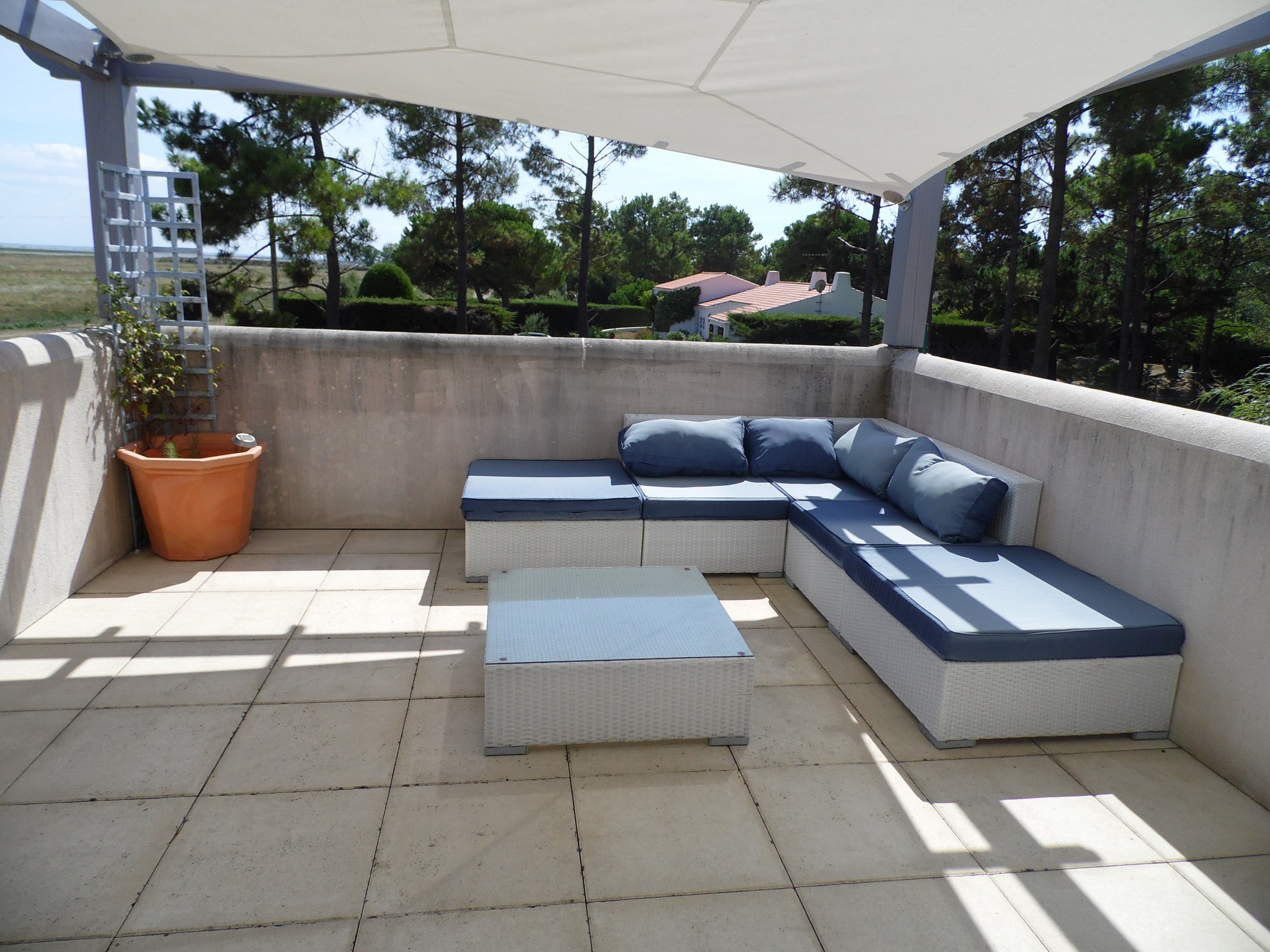 Superbe maison de vacances à La Faute sur Mer avec prestations haut de gamme, composée d'une entrée desservant un salon-séjour avec TV écran plat, et accès terrasse, une cuisine américaine aménagée et équipée, une arrière cuisine-buanderie, une chambre avec 1 lit de 140, 1 chambre avec 2 lits de 90 superposés (le couchage en hauteur ne convient pas aux enfants de moins de 6 ans), 1 wc. A l'étage : un salon TV avec écran plat et chaine hifi, accès au solarium avec vue sur le Lay, une chambre avec 1 lit de 140 avec balcon, une salle de bain-douche, un wc. Garage à vélo, jardin, stationnement sur terrain non clos. Animaux admis. wifi gratuite.