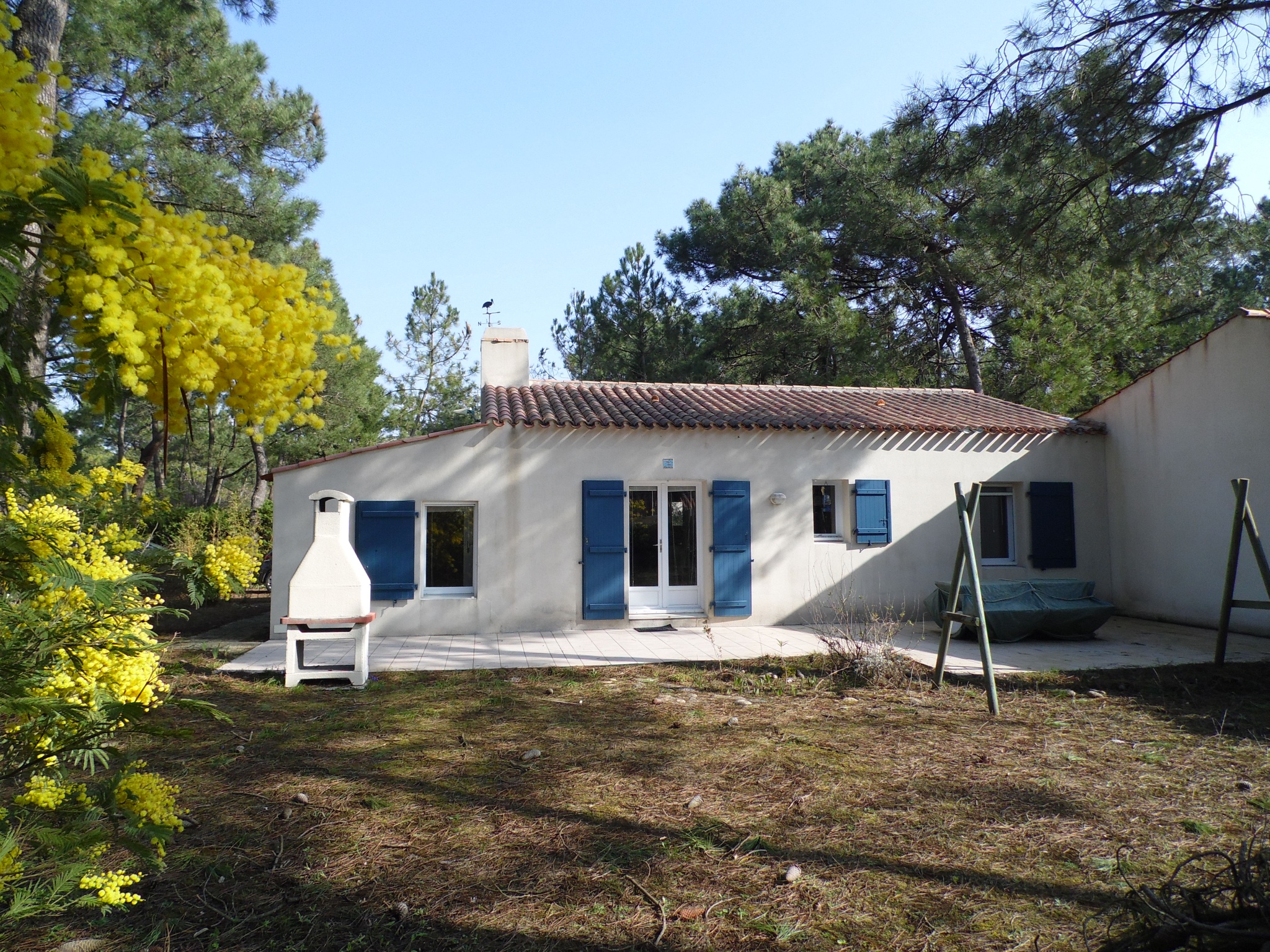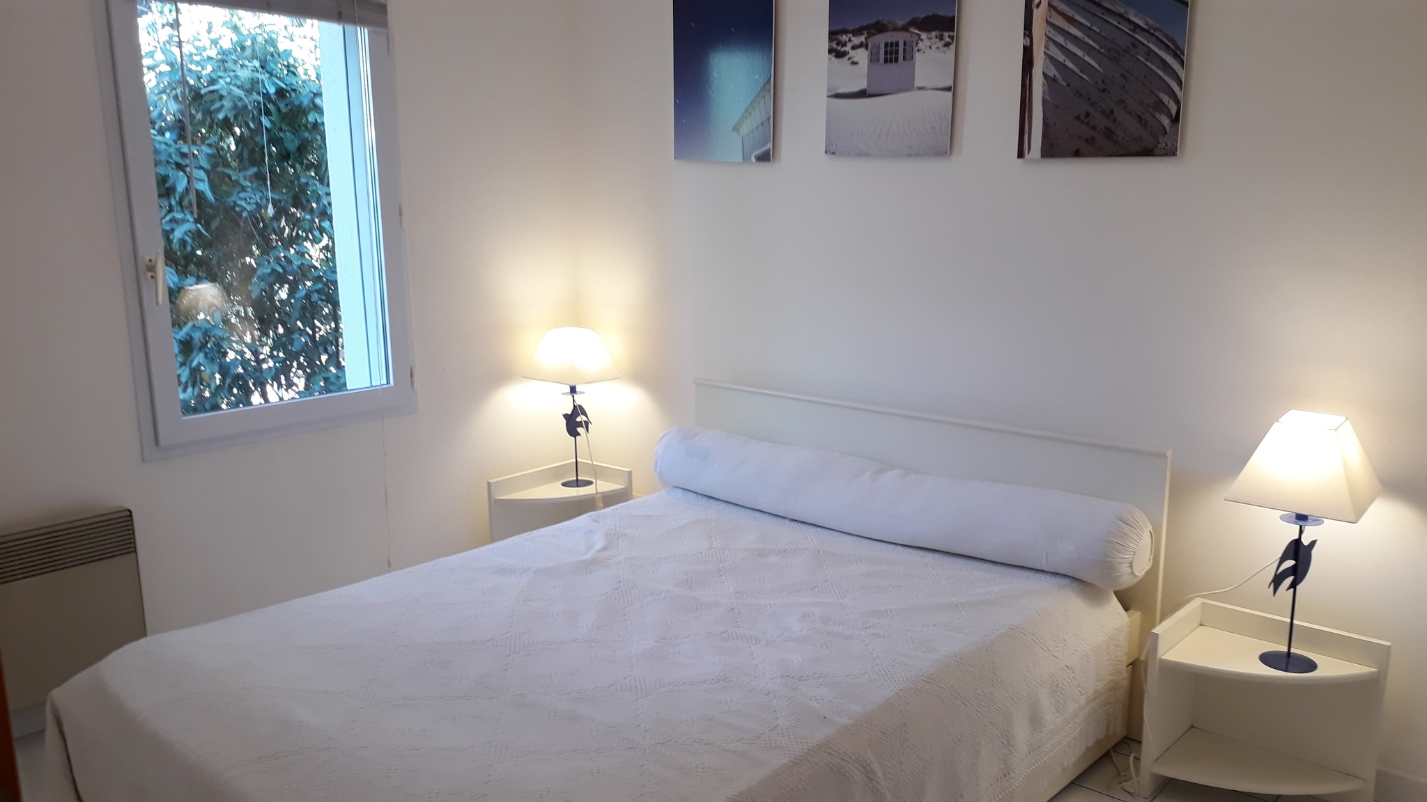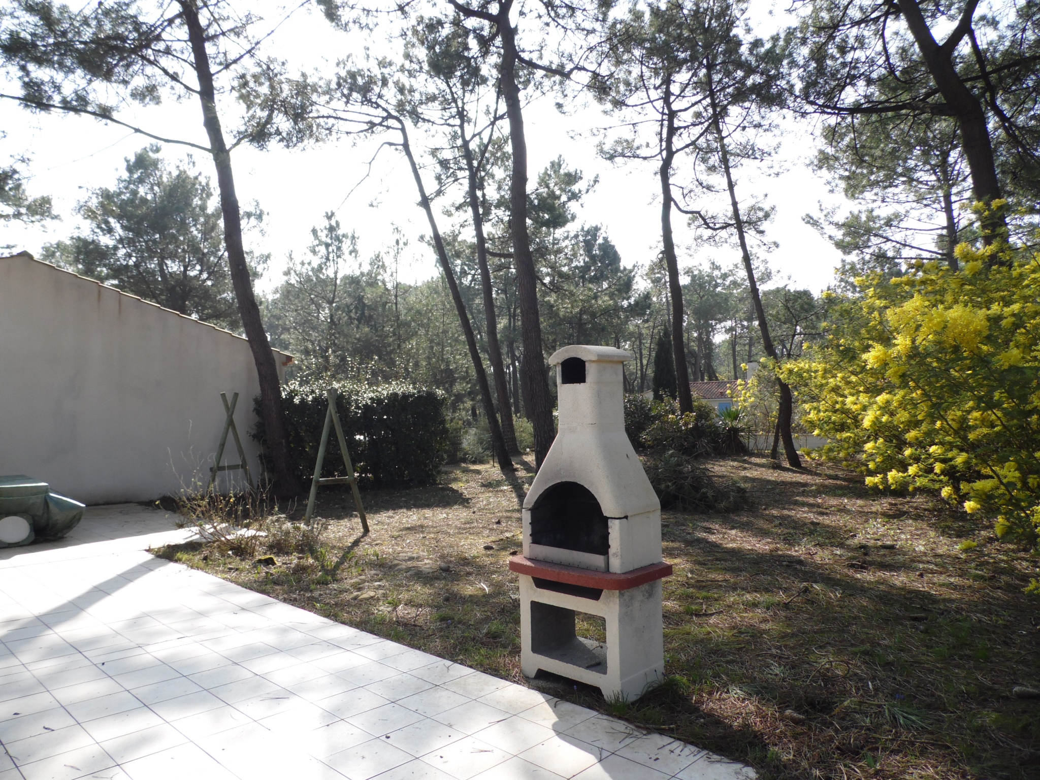 Maison individuelle de plain-pied, composée d'une entrée sur cuisine ouverte, aménagée et équipée (plaques gaz et électriques, four, micro ondes, réfrigérateur, congélateur, lave-vaisselle, lave-linge), d'un séjour/salon avec cheminée, de trois chambres avec chacune un lit de 140 (dont une avec un lavabo), d'une salle d'eau et d'un WC indépendant. A l'extérieur, un jardin avec une belle terrasse sous les pins, salon de jardin et barbecue en dur. Située dans une impasse, à 300 m de la plage et 3000 m du centre ville. Les animaux ne sont pas admis.