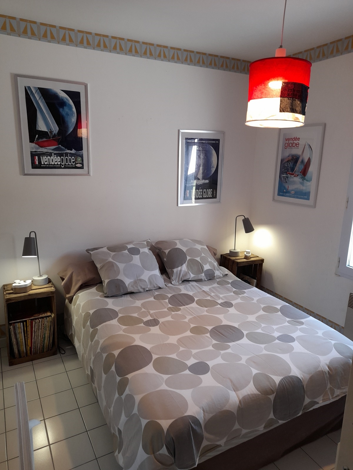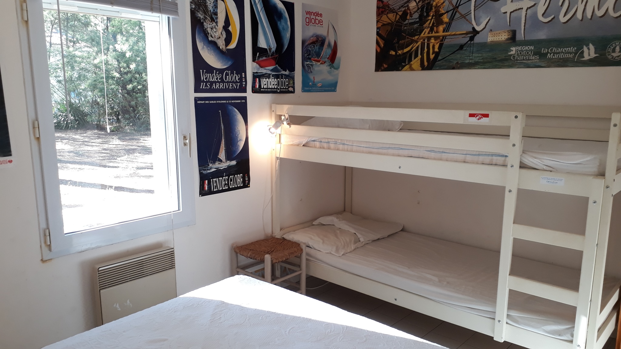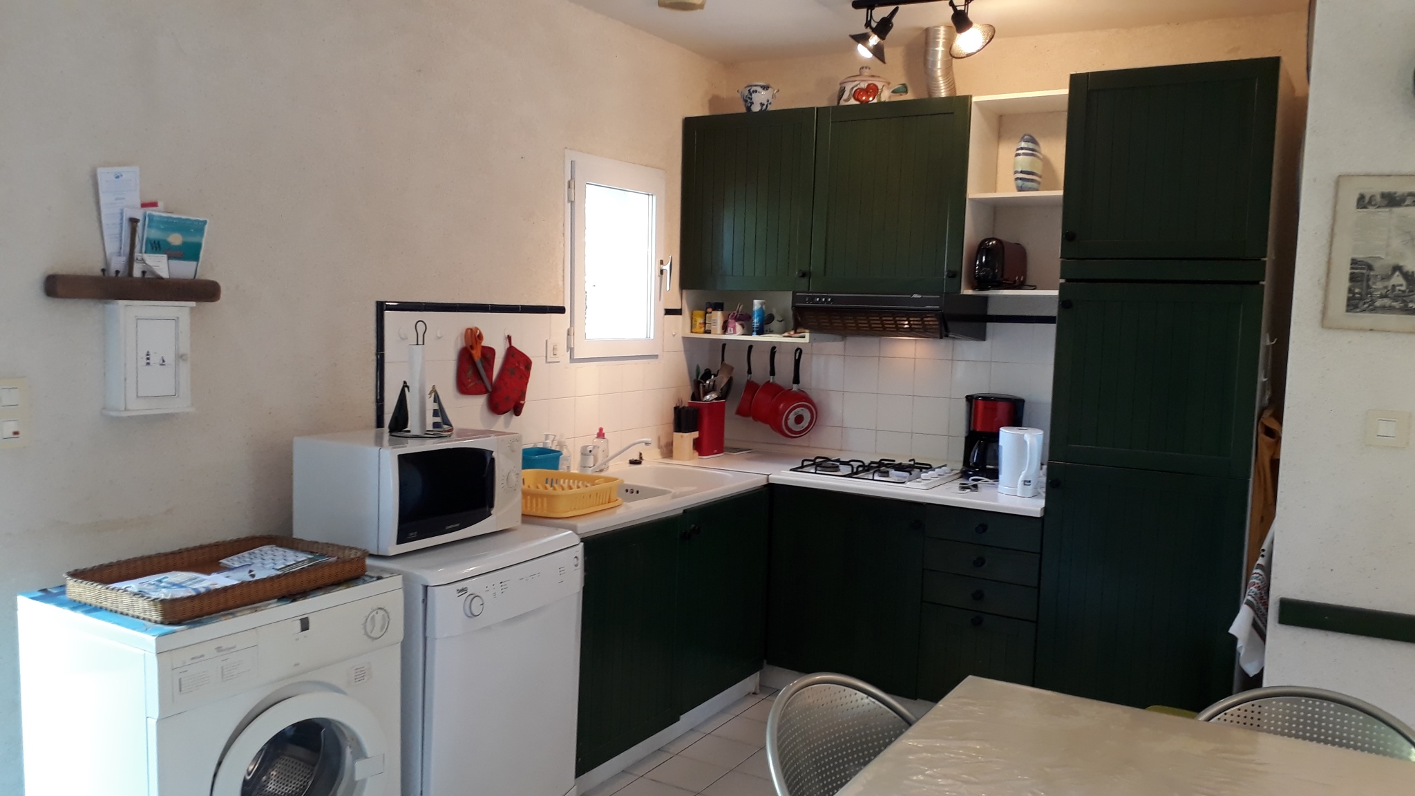 Maison individuelle de plain-pied, composée d'une entrée sur cuisine ouverte, aménagée et équipée (plaques gaz et électriques, four, micro ondes, réfrigérateur, congélateur, lave-vaisselle, lave-linge), d'un séjour/salon avec cheminée, de trois chambres avec chacune un lit de 140 (dont une avec un lavabo), d'une salle d'eau et d'un WC indépendant. A l'extérieur, un jardin avec une belle terrasse sous les pins, salon de jardin et barbecue en dur. Située dans une impasse, à 300 m de la plage et 3000 m du centre ville. Les animaux ne sont pas admis.
