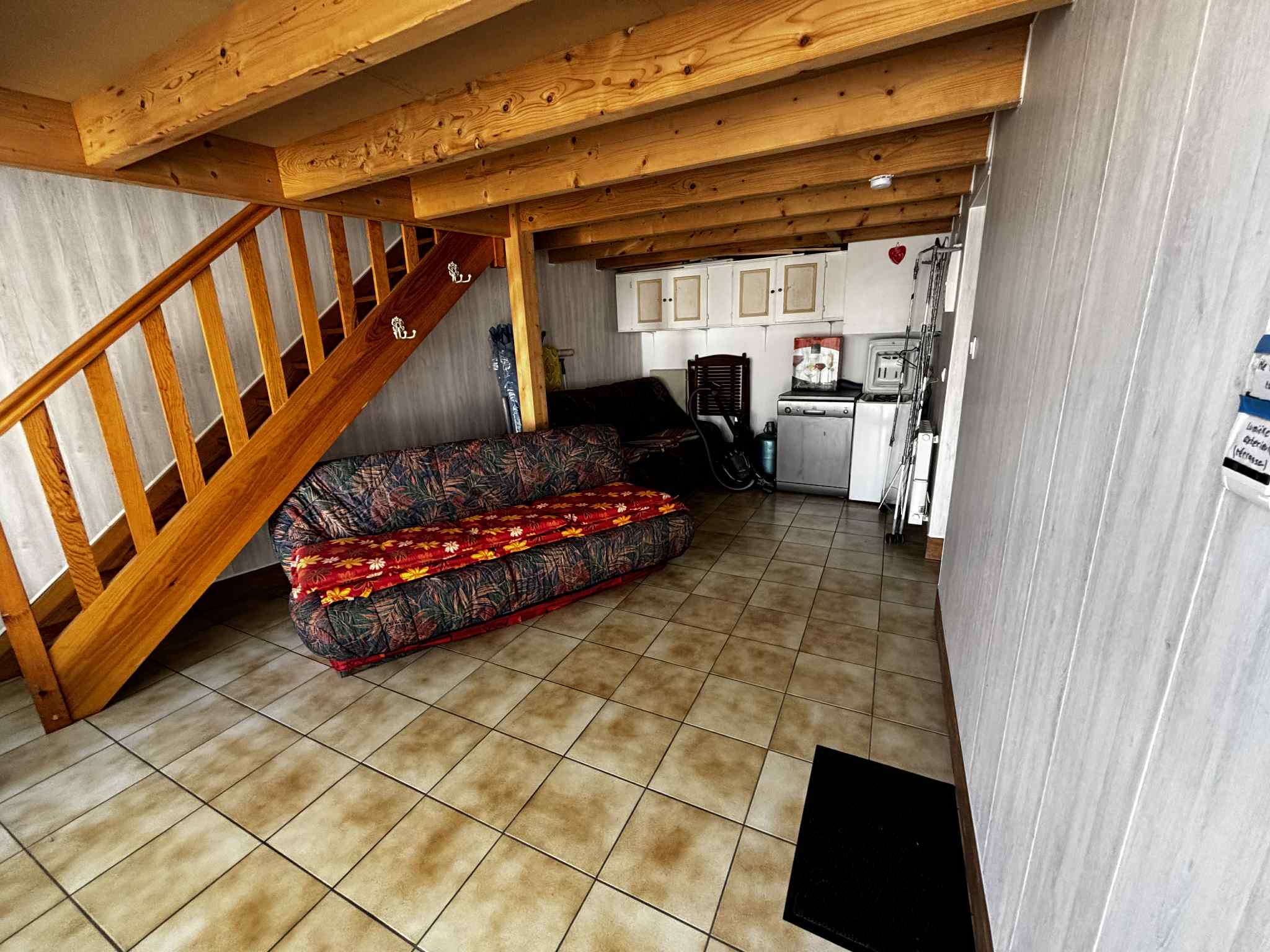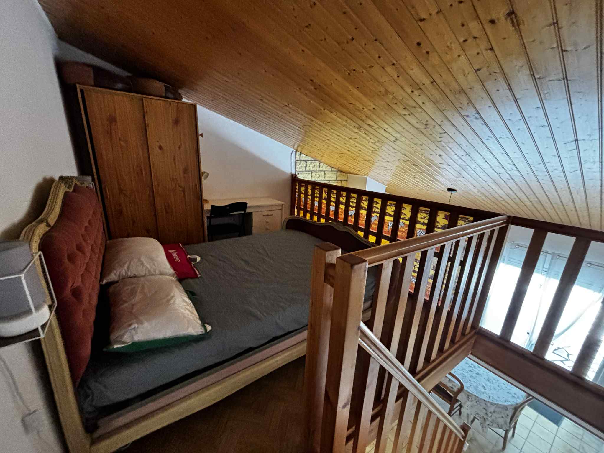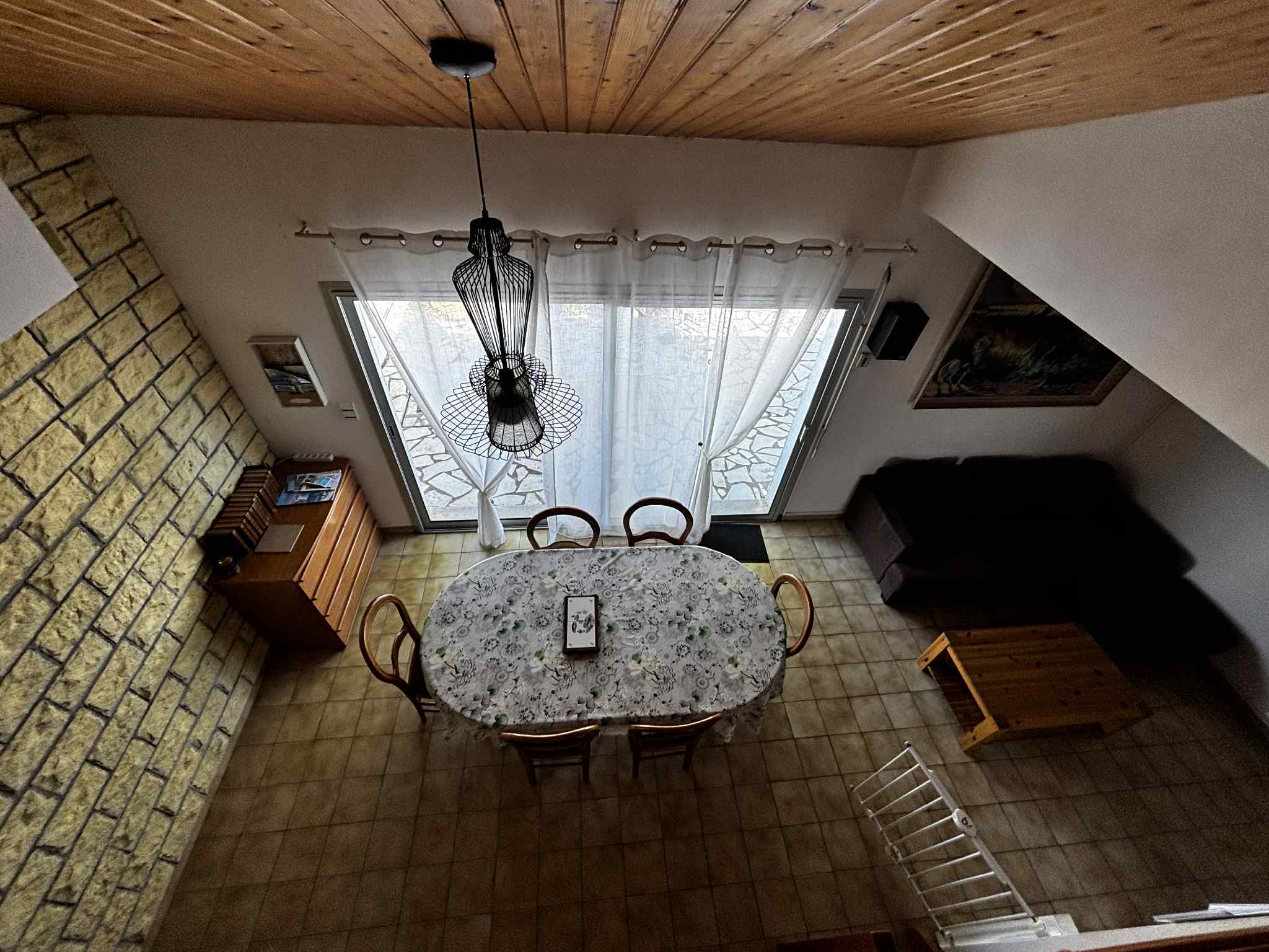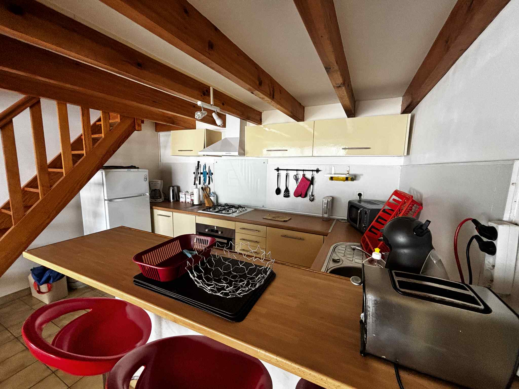 Maison de vacances de 50m2 au calme, pouvant accueillir 5 personnes, composée d'une pièce de vie avec coin salon, canapé et TV, cuisine ouverte équipée (4 feux gaz + four électrique, micro-onde, grille-pain, cafetière), une salle d'eau avec douche et wc. Une mezzanine avec 2 espaces couchage avec un lit de 140 + armoire, et séparé, un autre lit de 90 + armoire . Une autre pièce située en étage au dessus de la buanderie offre un autre couchage 2 personnes de 140. La buanderie dispose d'un lave-linge et d'un lave-vaisselle.