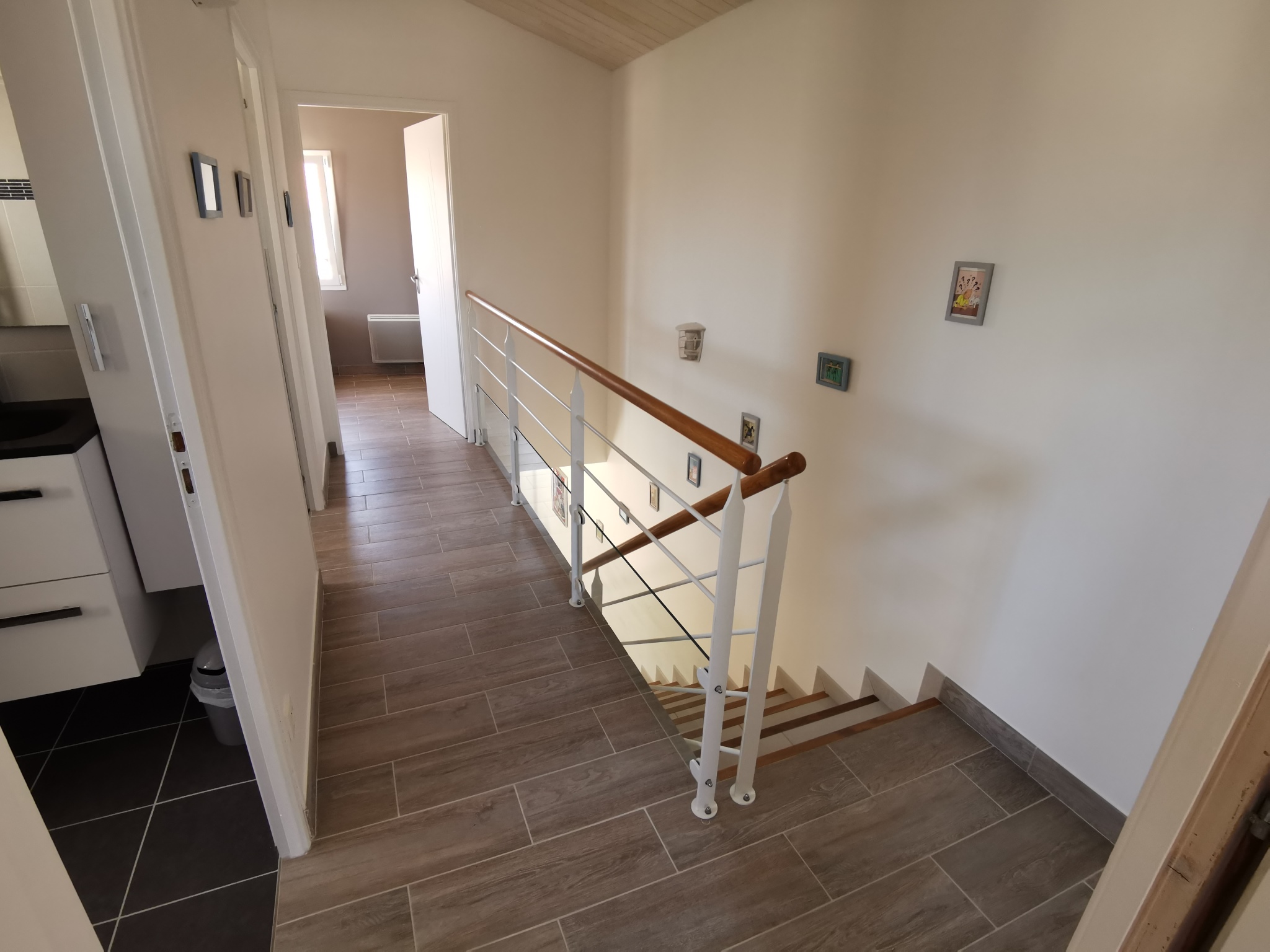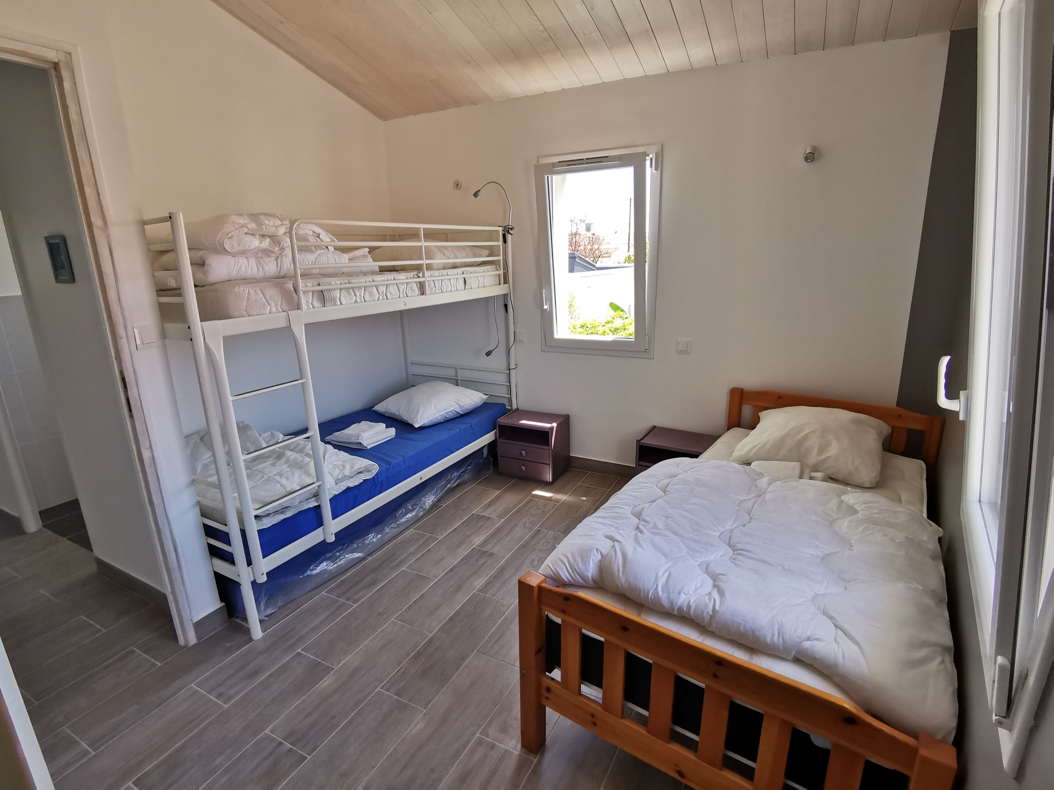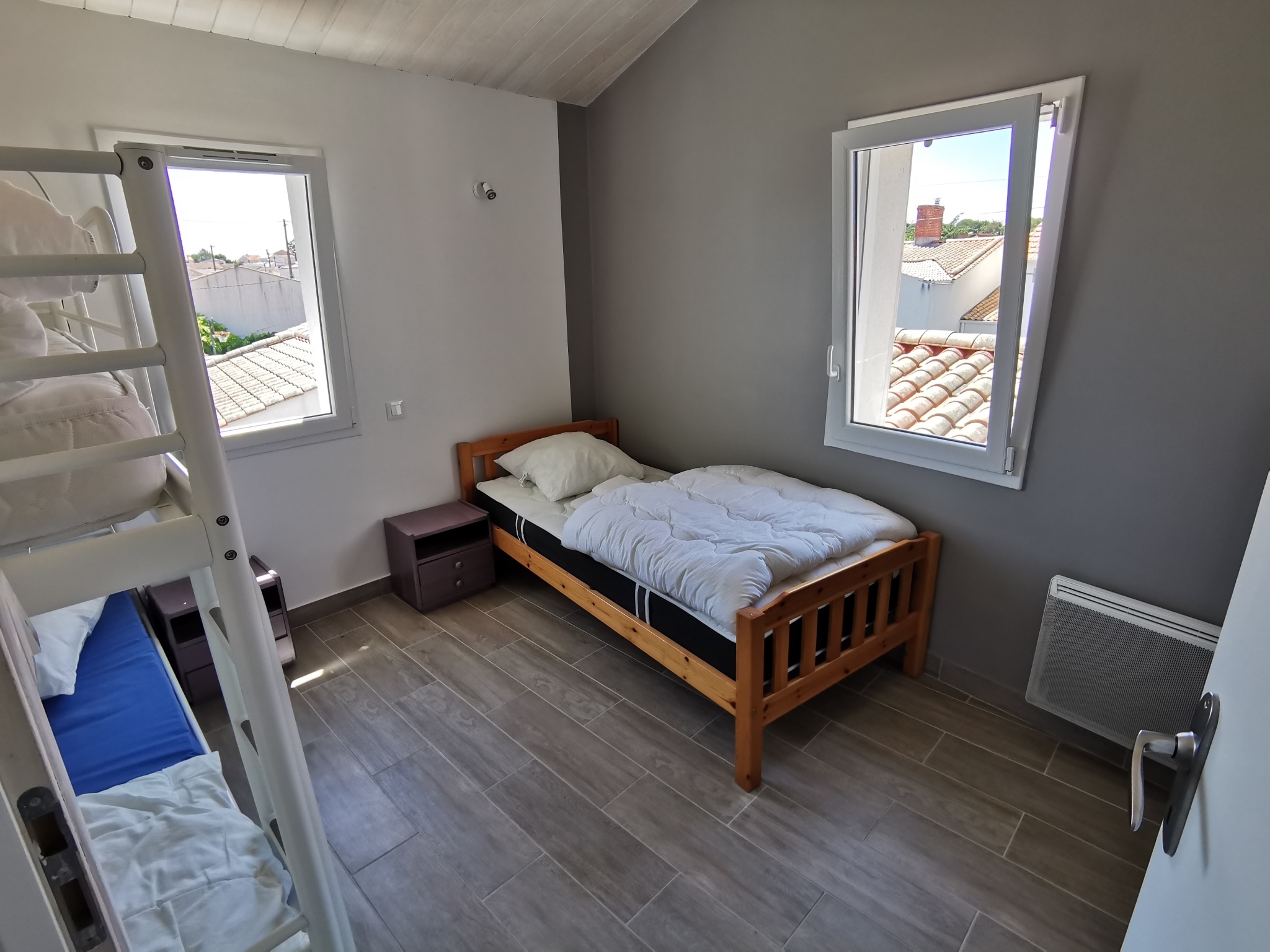 A l'étage : 2 chambres, une salle d'eau et un WC séparé. La 2ème chambre dispose de 2 lits de 90 et la troisième de 3 lits de 90 dont deux sont superposés.