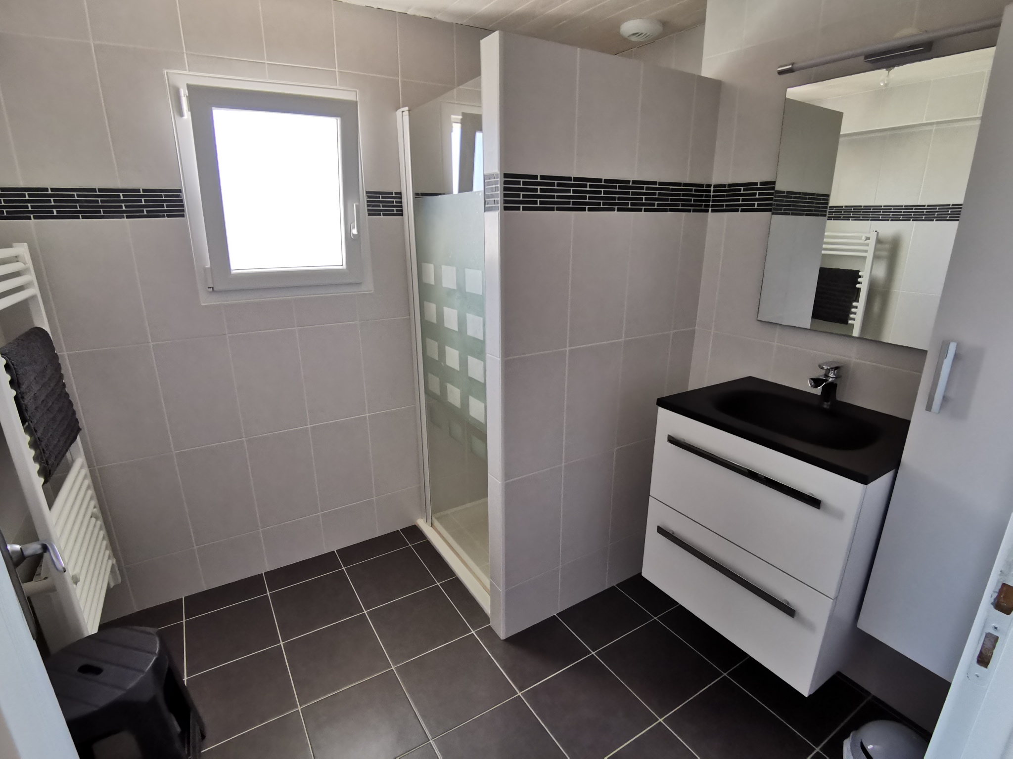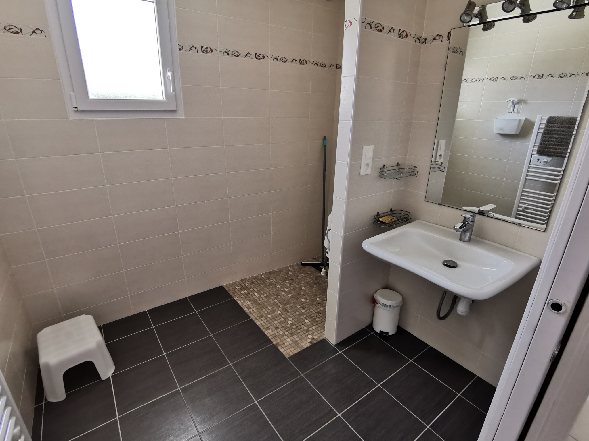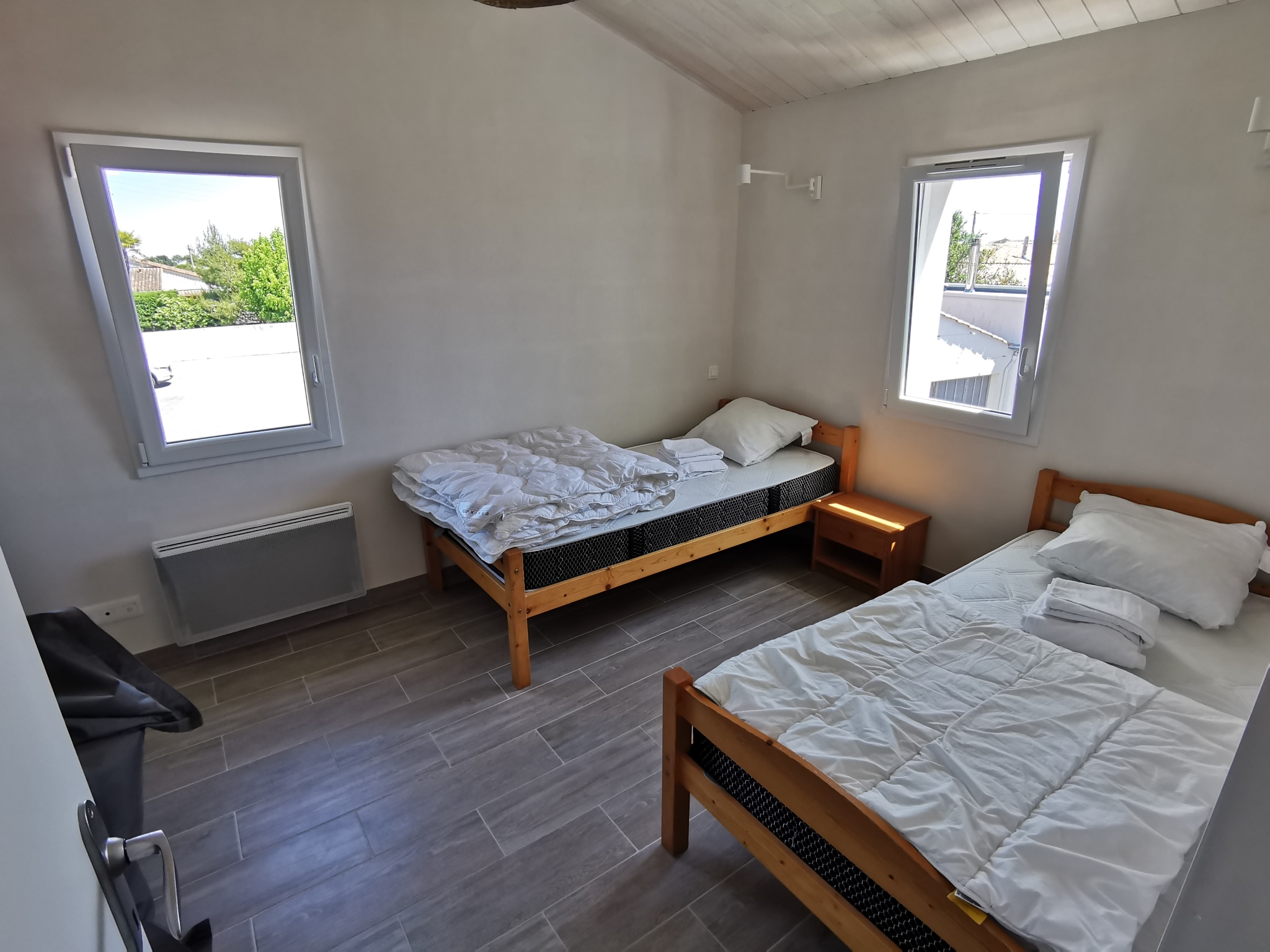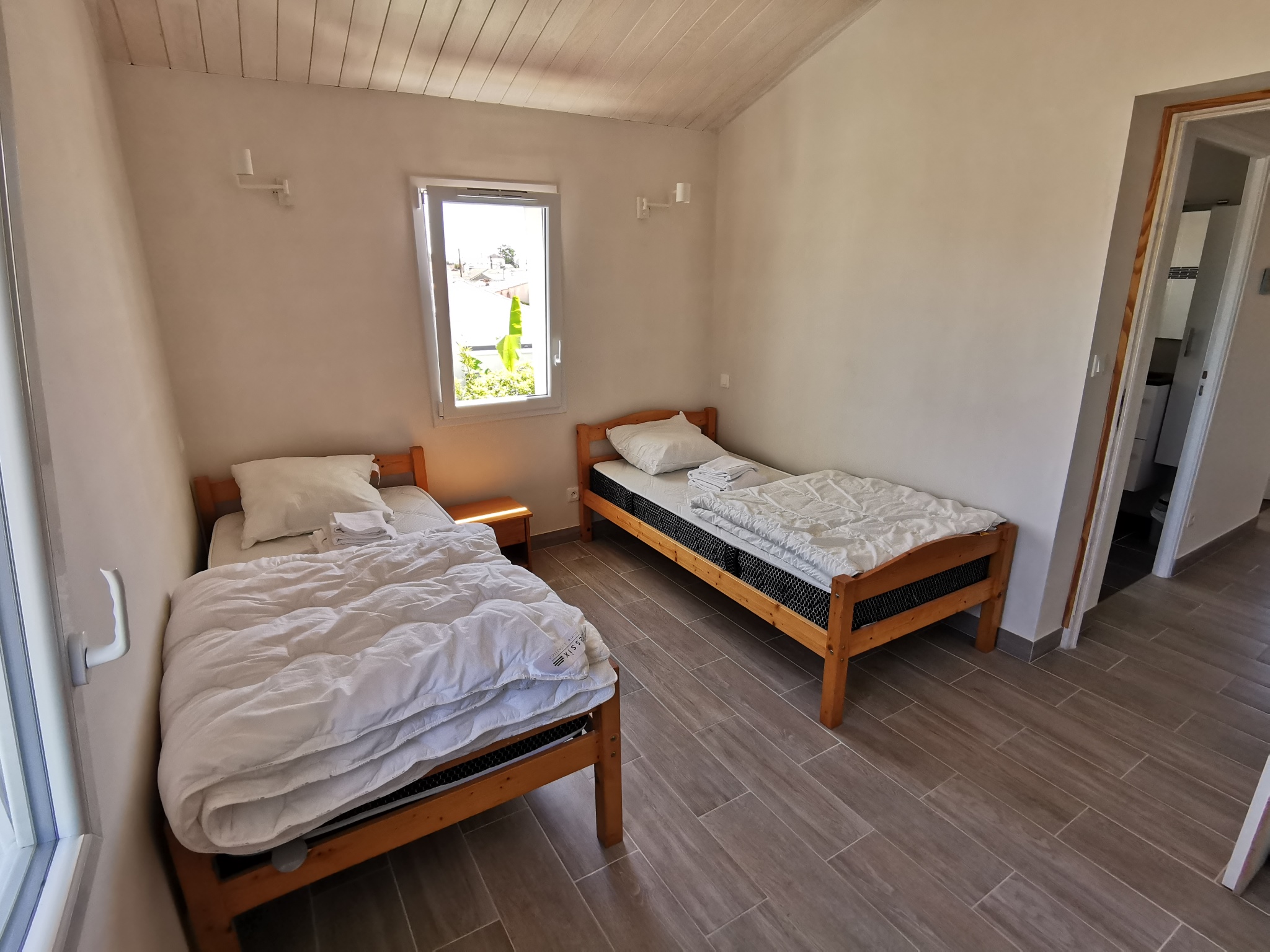 A l'étage : 2 chambres, une salle d'eau et un WC séparé. La 2ème chambre dispose de 2 lits de 90 et la troisième de 3 lits de 90 dont deux sont superposés.