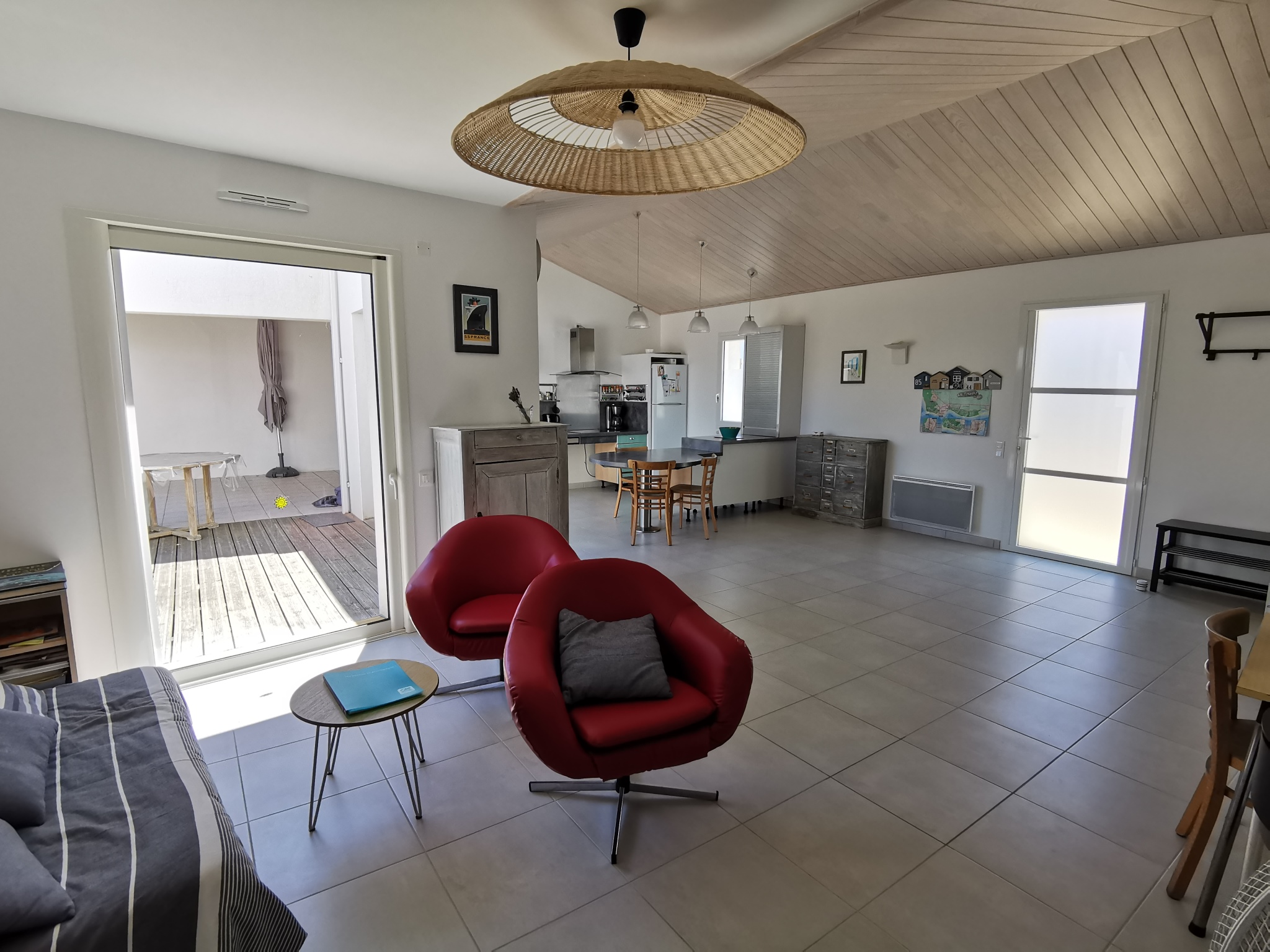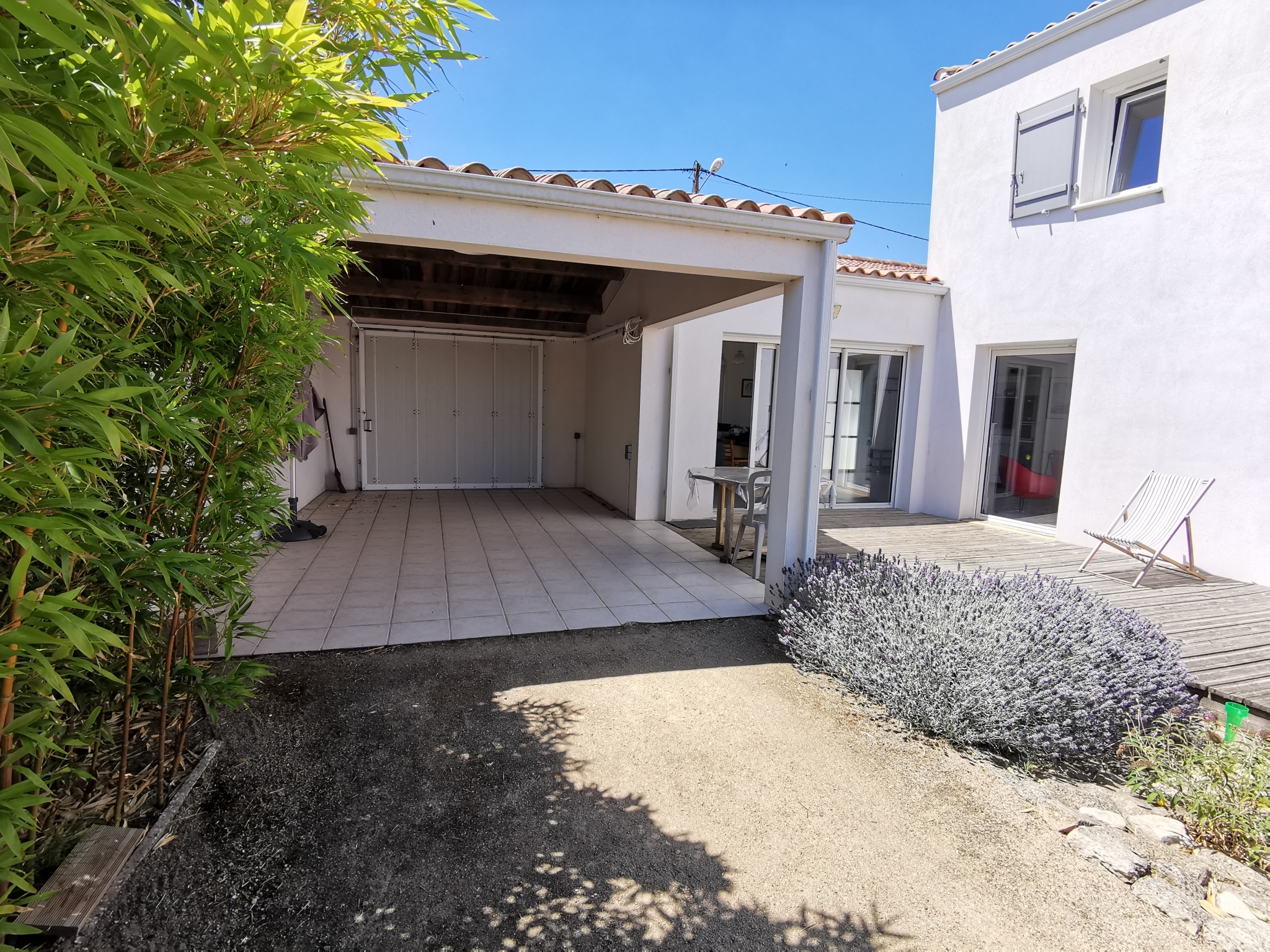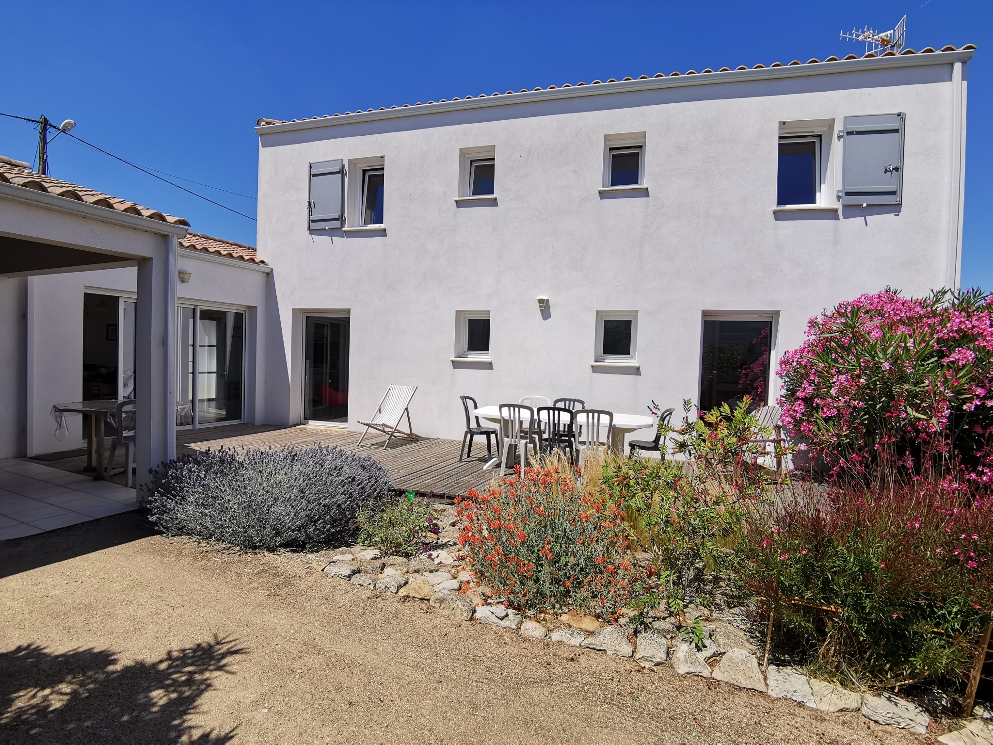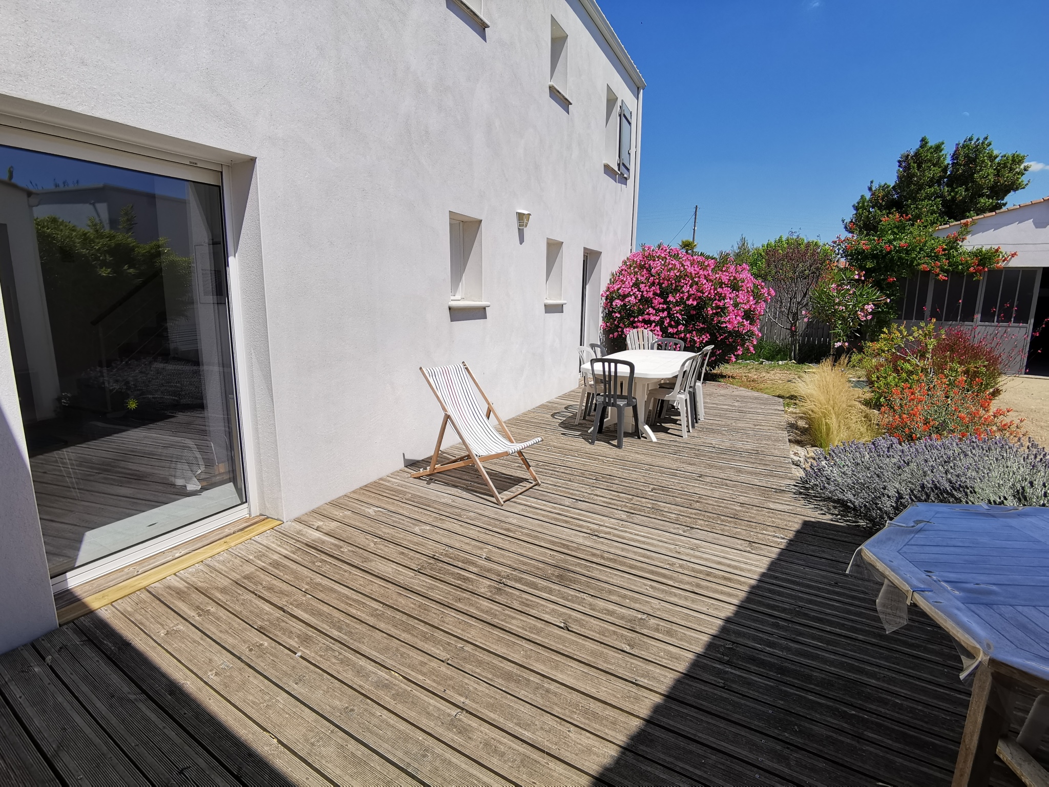 La maison dispose également d'une belle terrasse en bois de 32m2 exposée plein sud avec salon de jardin,transats, bain de soleil, barbecue et un préau.