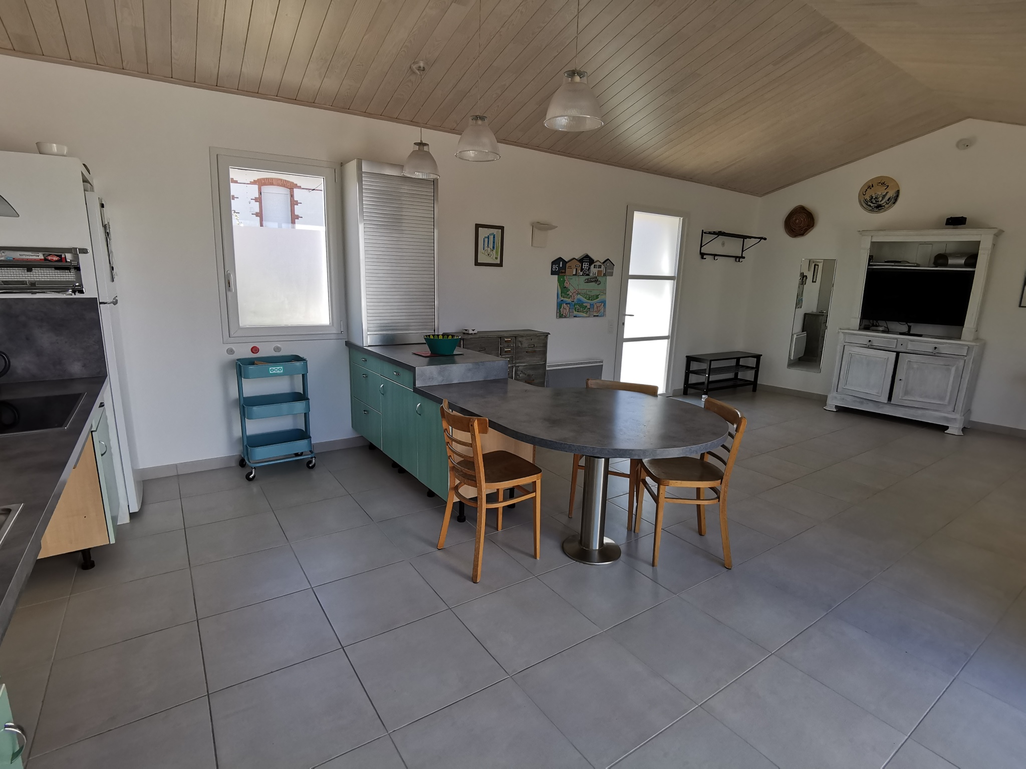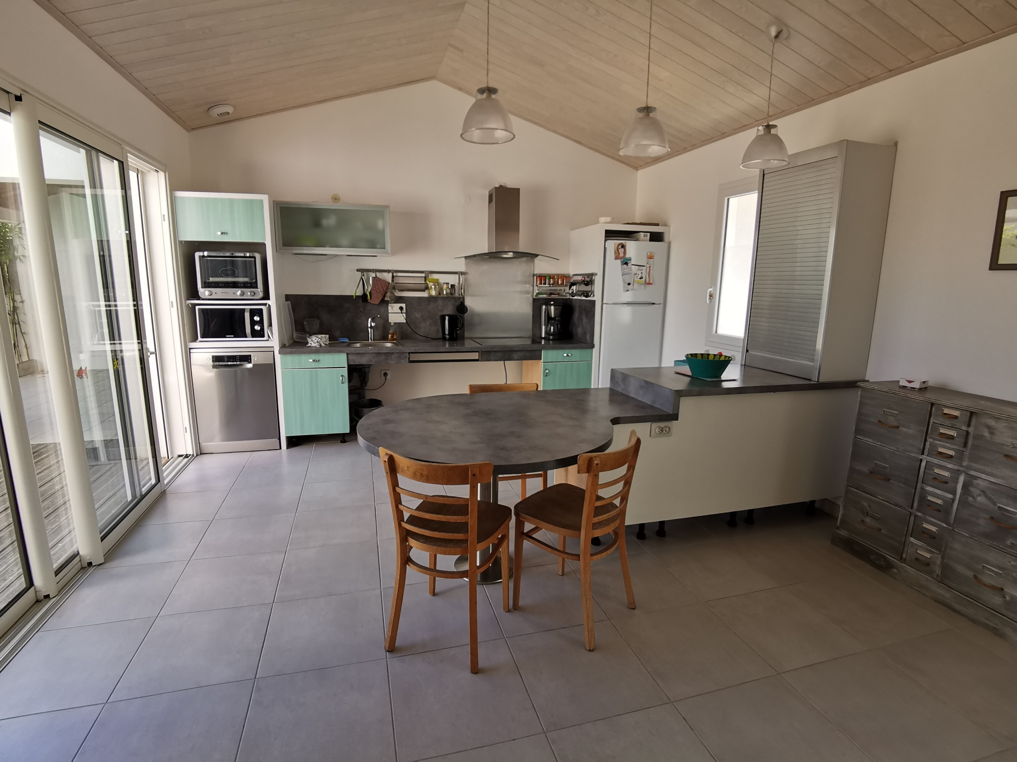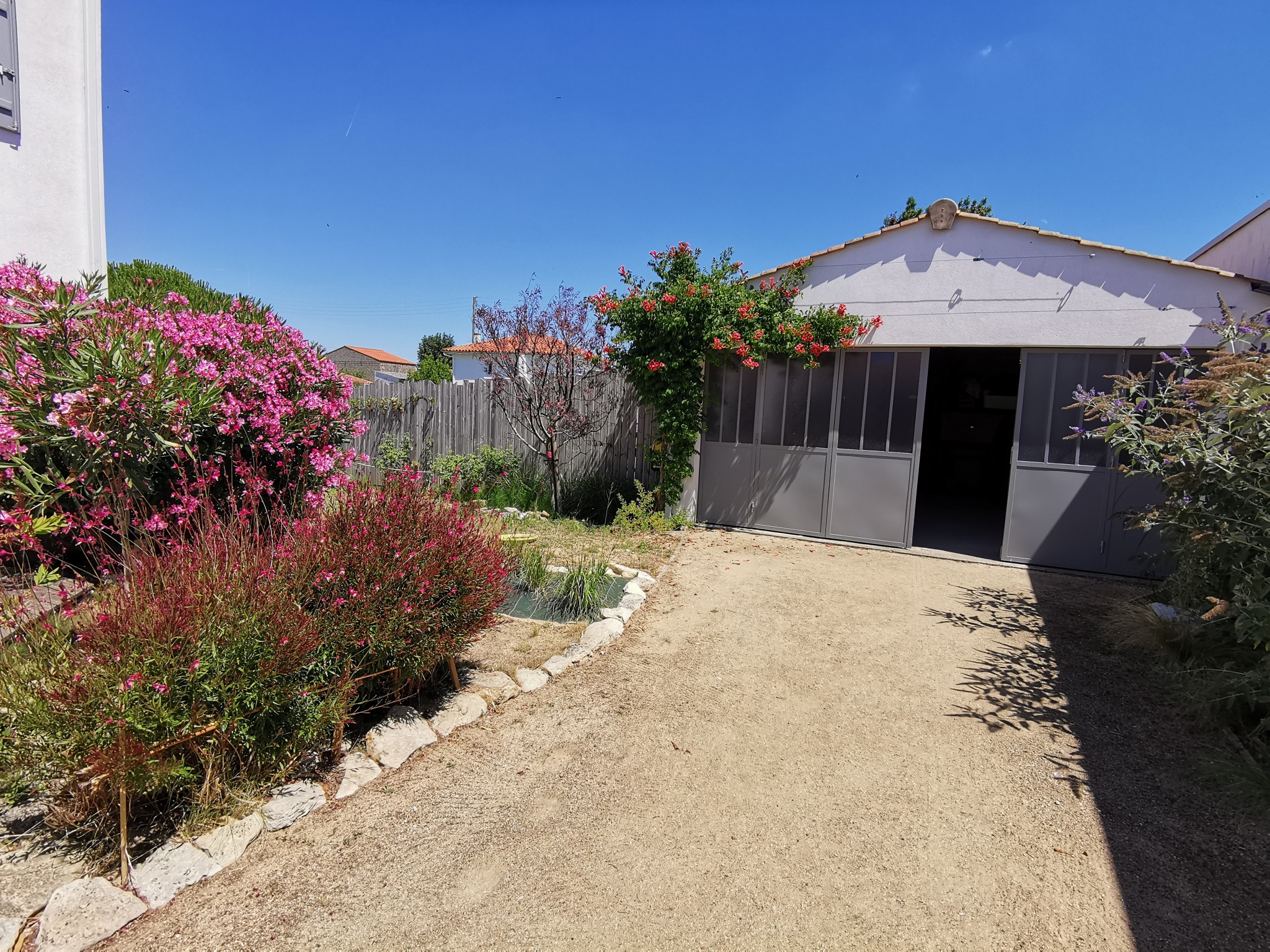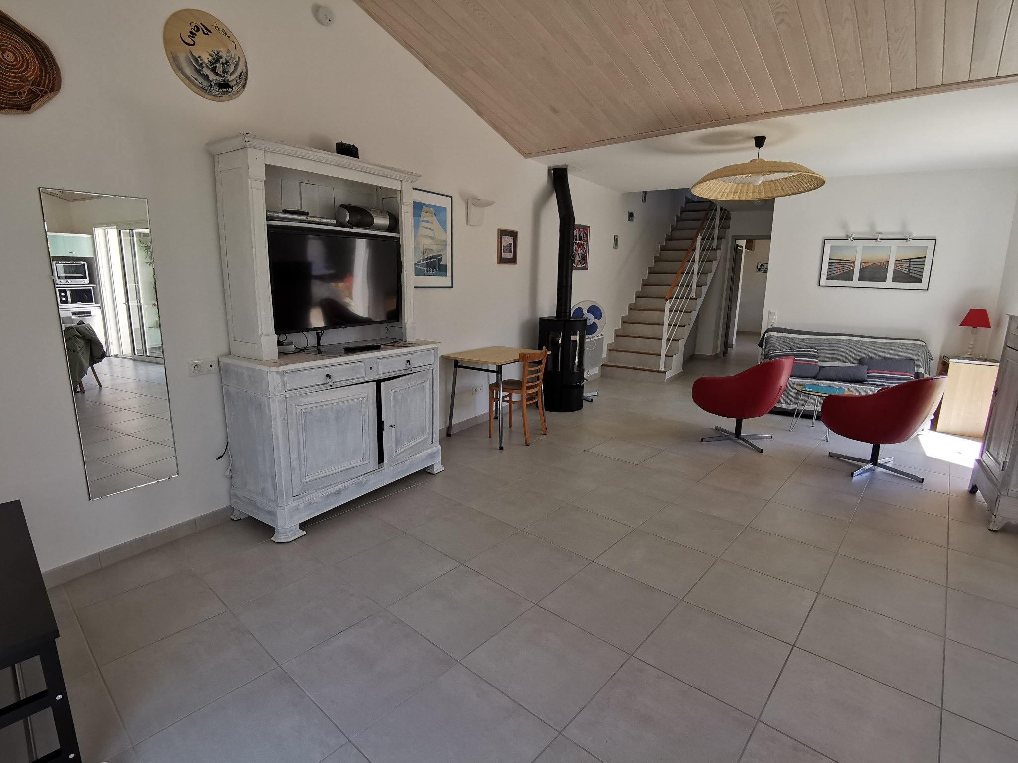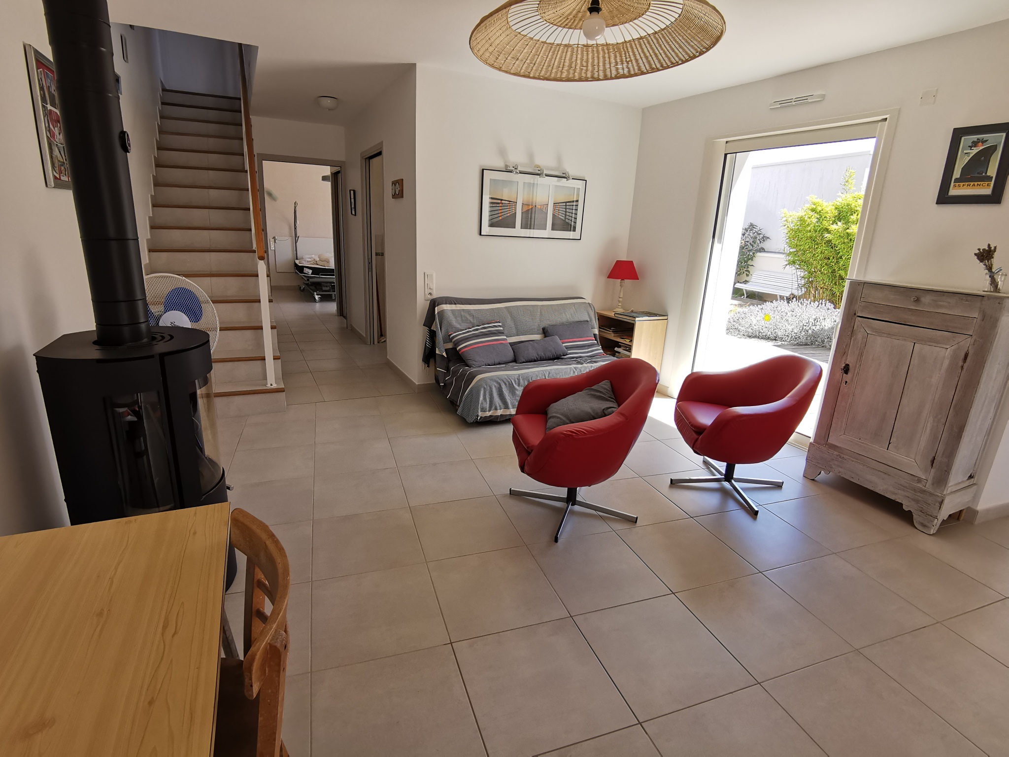 La maison dispose également d'une belle terrasse en bois de 32m2 exposée plein sud avec salon de jardin,transats, bain de soleil, barbecue et un préau.