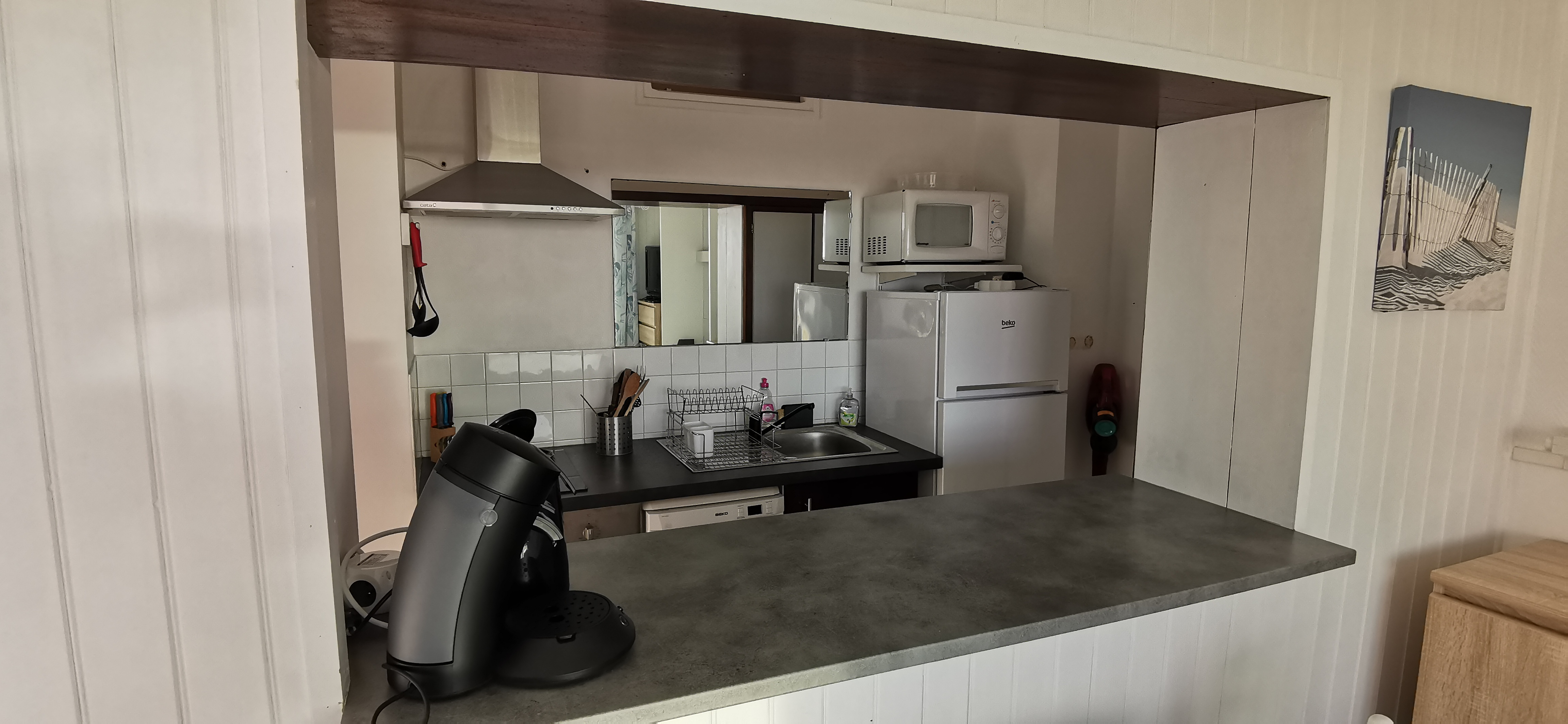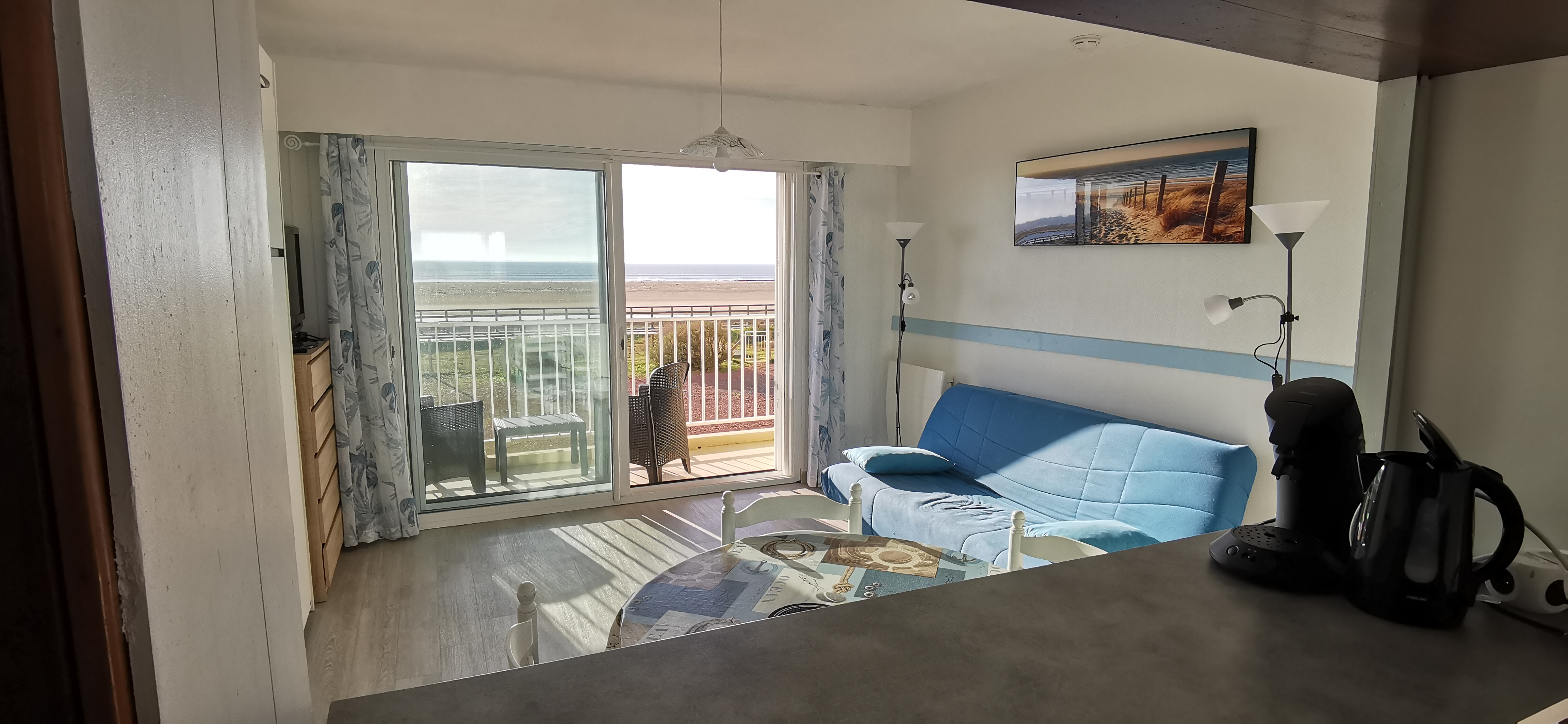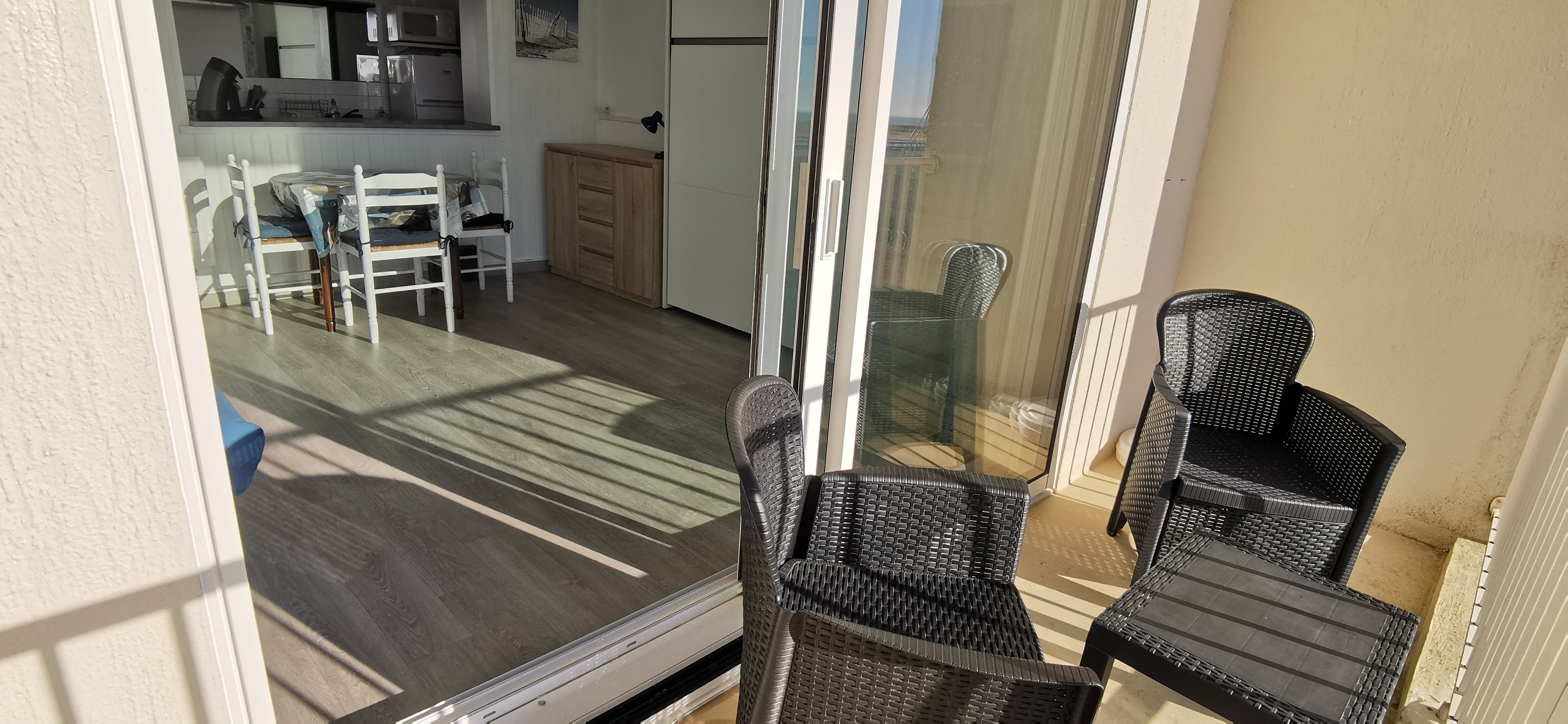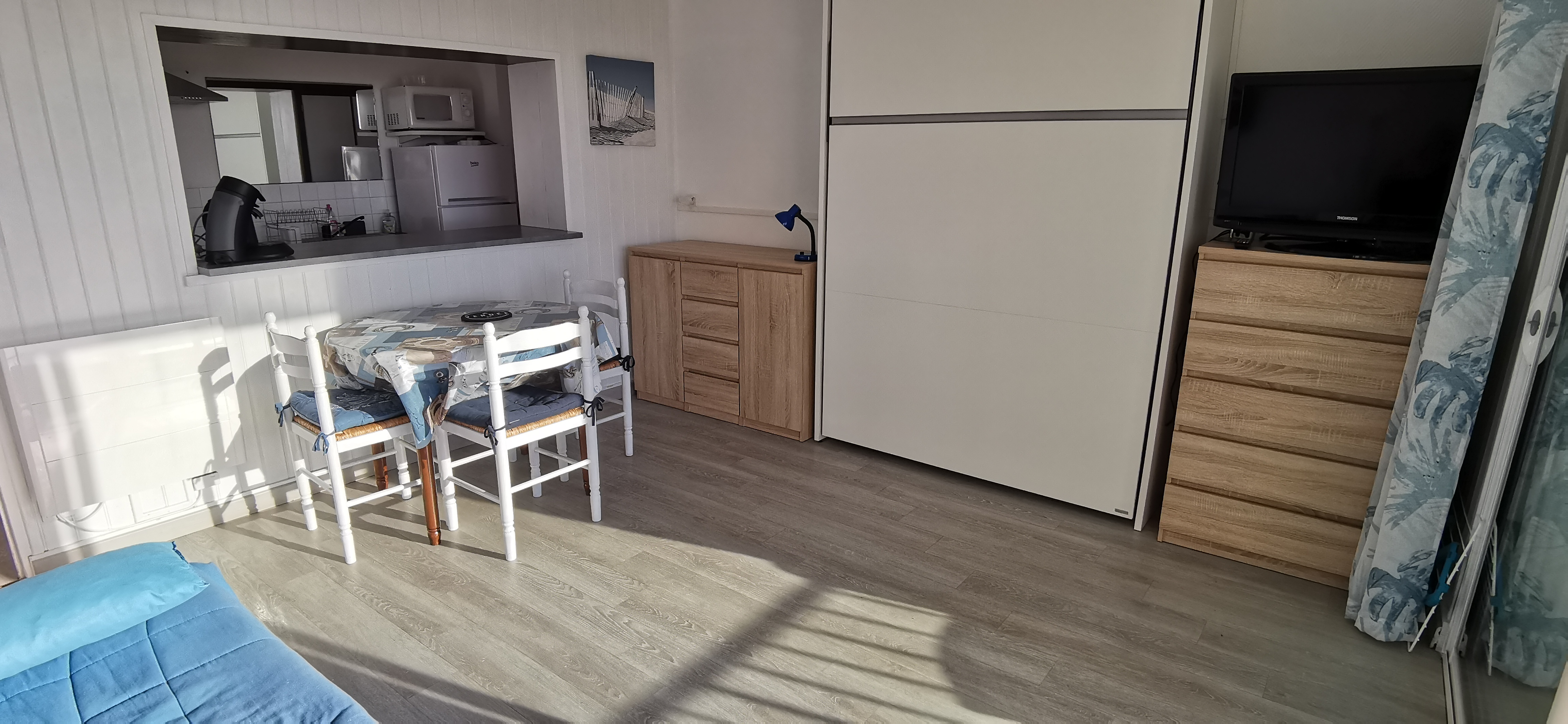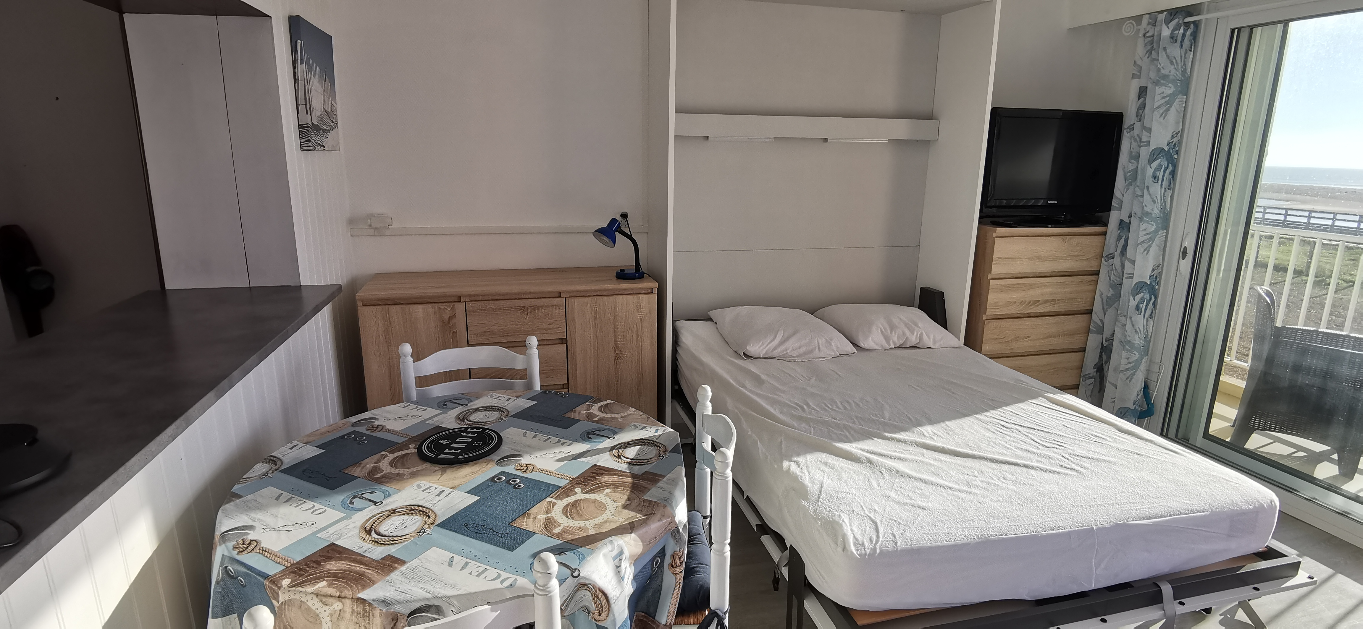 Il est composé d'une entrée (avec placard) desservant la salle d'eau avec wc, lavabo et douche, le coin cuisine aménagée (2 plaques vitrocéramiques avec hotte . réfrigérateur/congélateur . four) avec lave-vaisselle, une pièce de vie comprenant un canapé convertible et un lit escamotable en 140 x 200, table pour 4 personnes, TV écran plat, accès Wifi. Balcon exposé sud/ouest avec mobilier de terrasse.