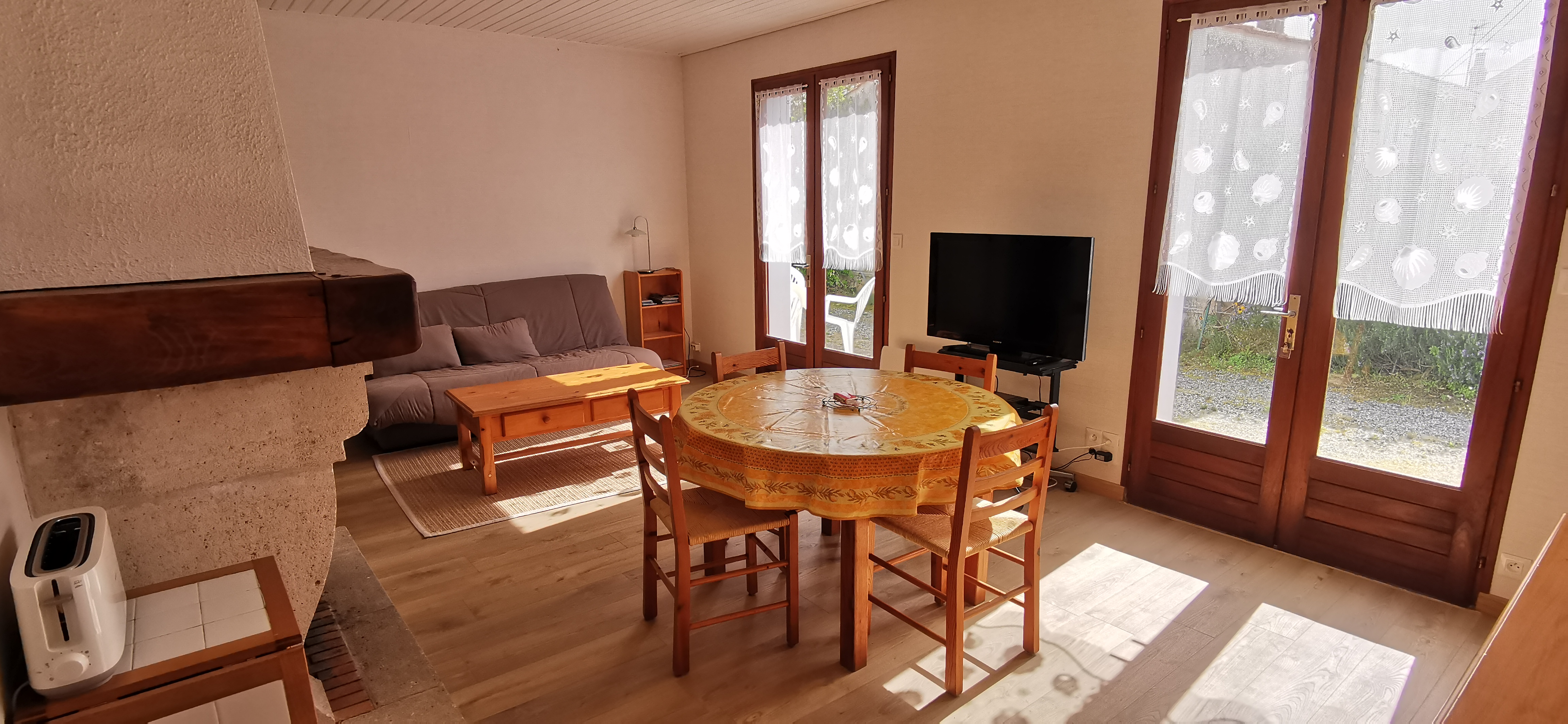 Un séjour-salon avec table, canapé clic-clac en 140, télévision écran plat.