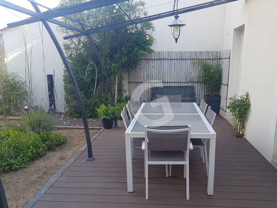 Terrasse avec auvent exposée sud (mobilier de jardin 6 personnes, 2 transats, barbecue).