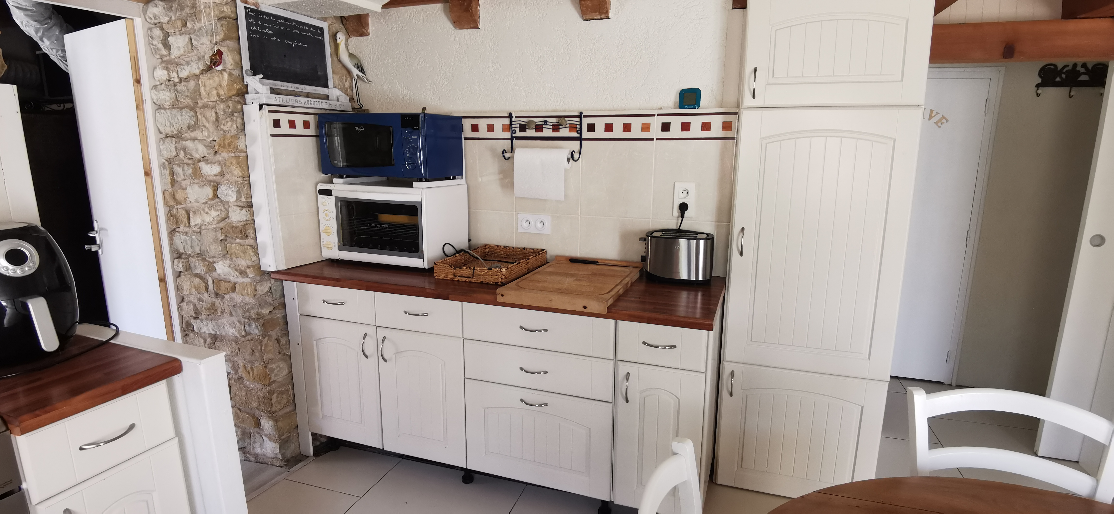 Une cuisine aménagée-équipée (réfrigérateur-congélateur, MO, LV),