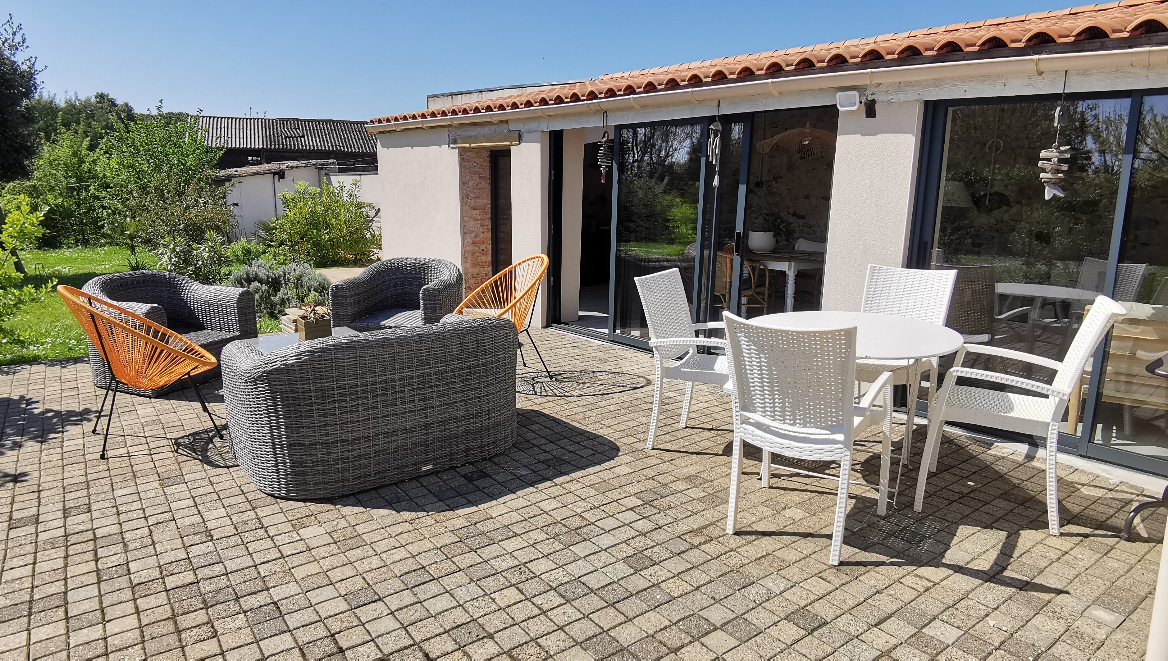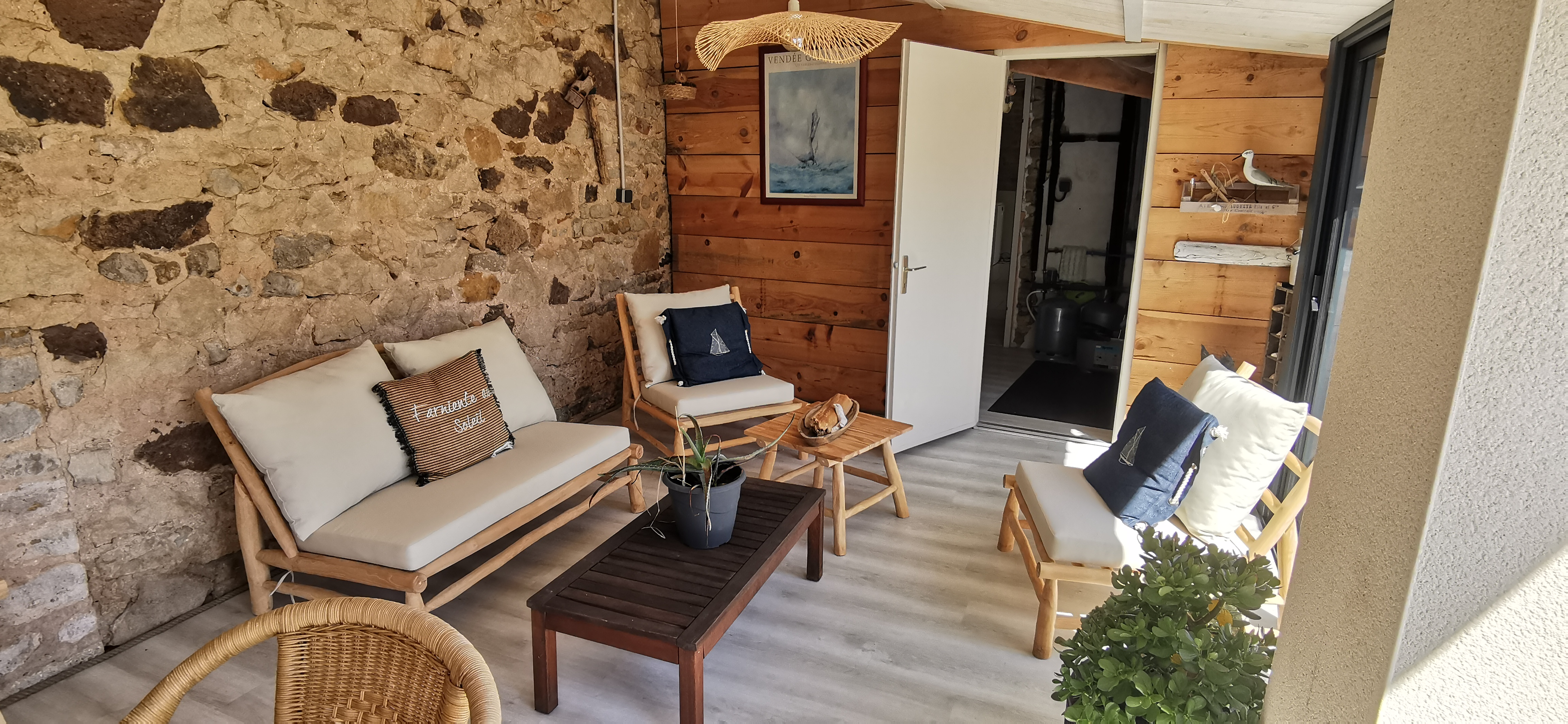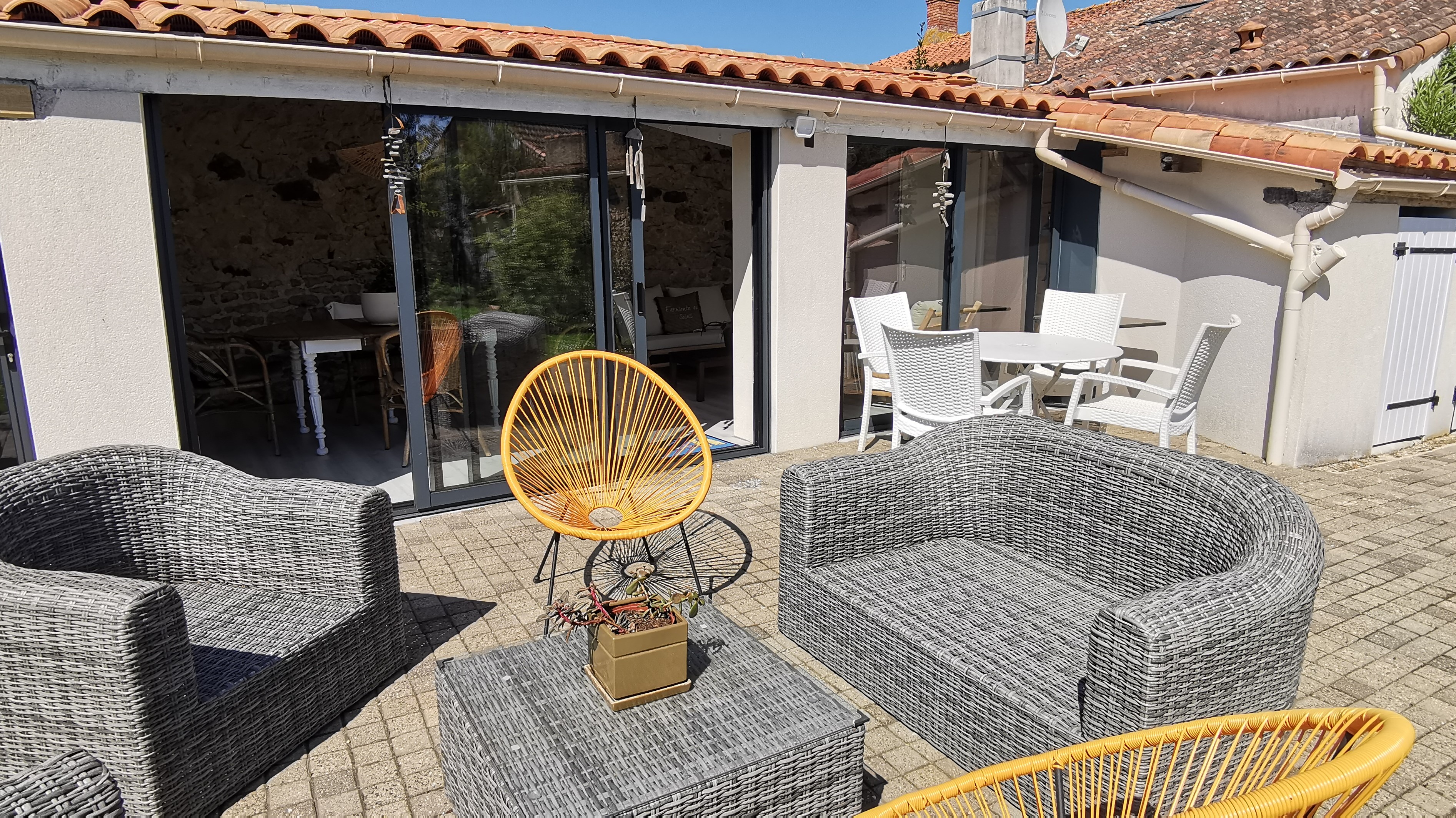 Un salon d'été avec son salon, transats, grill-plancha gaz (fermé par des baies vitrées).