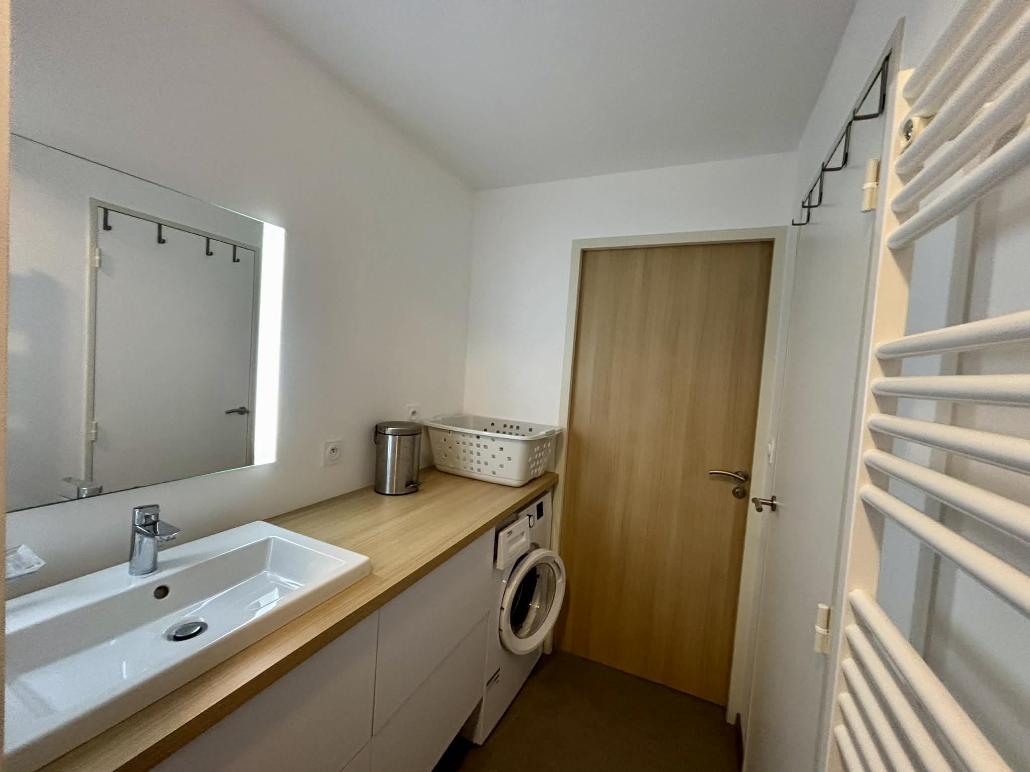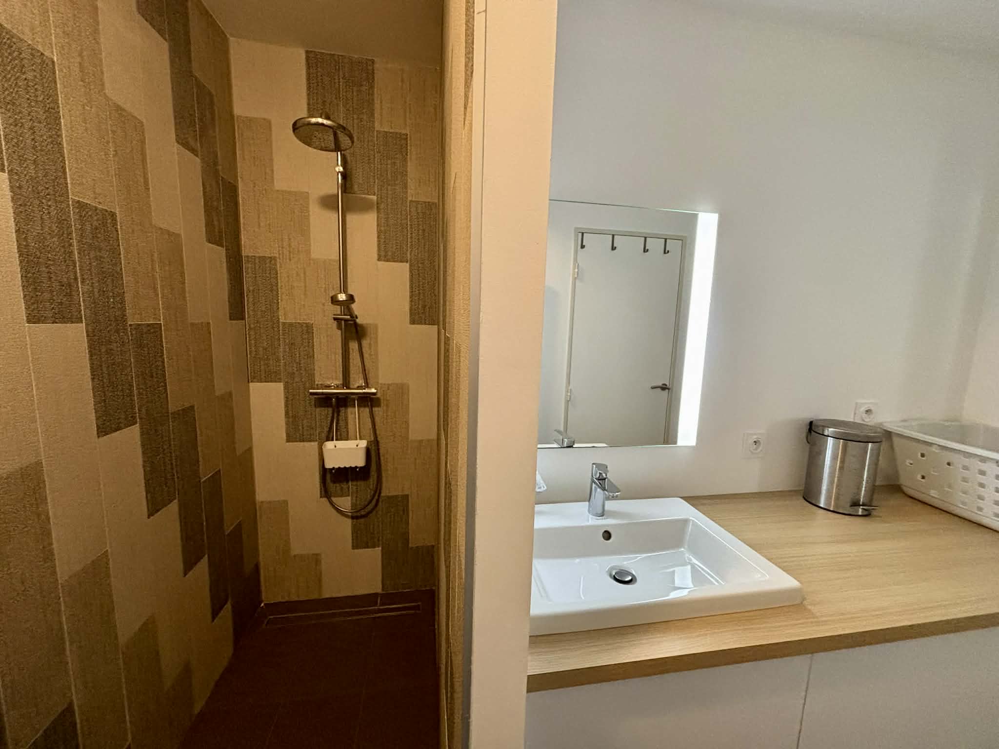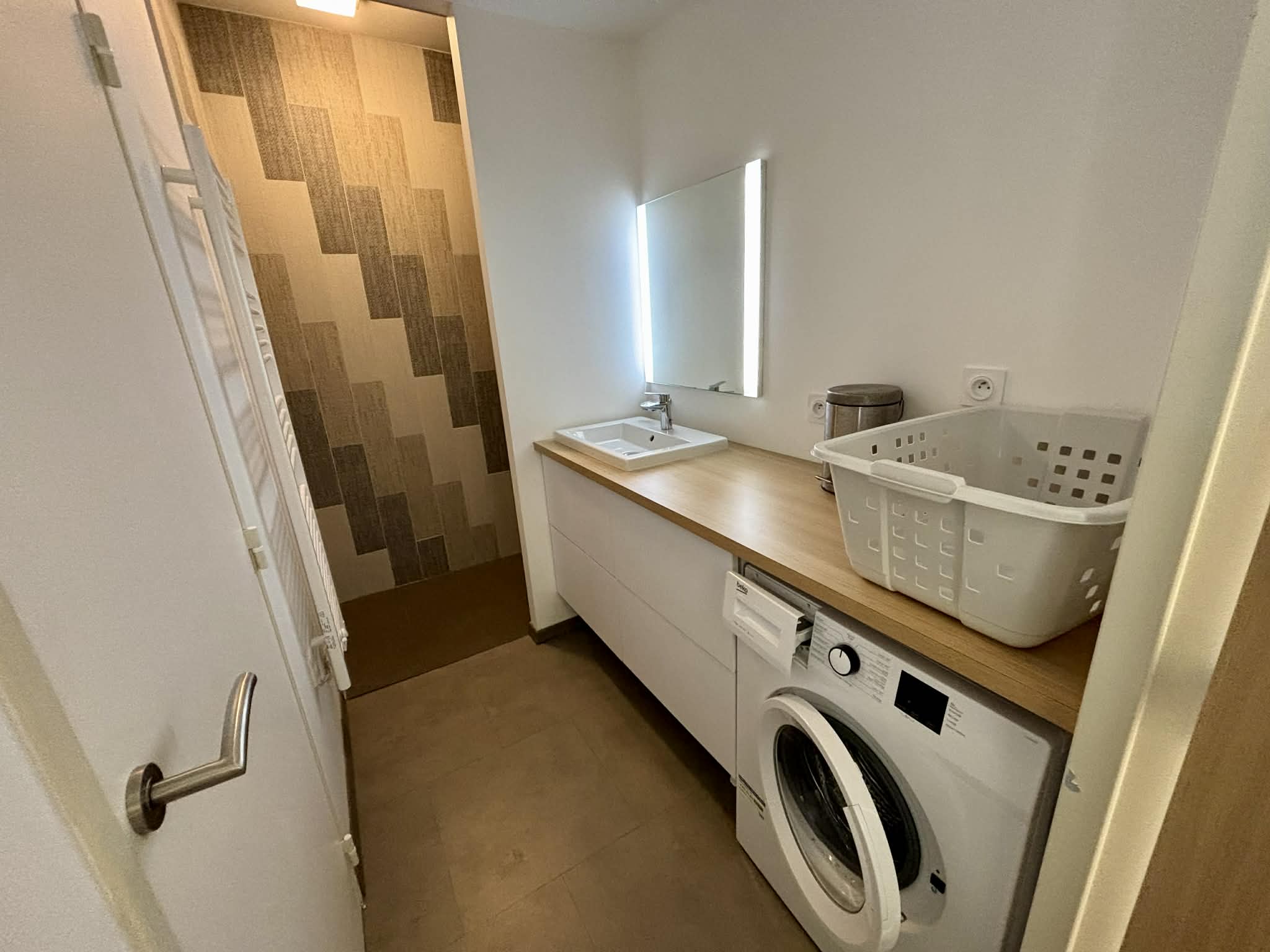 Salle d'eau avec douche à l'italienne, meuble vasque, sèche-serviette,