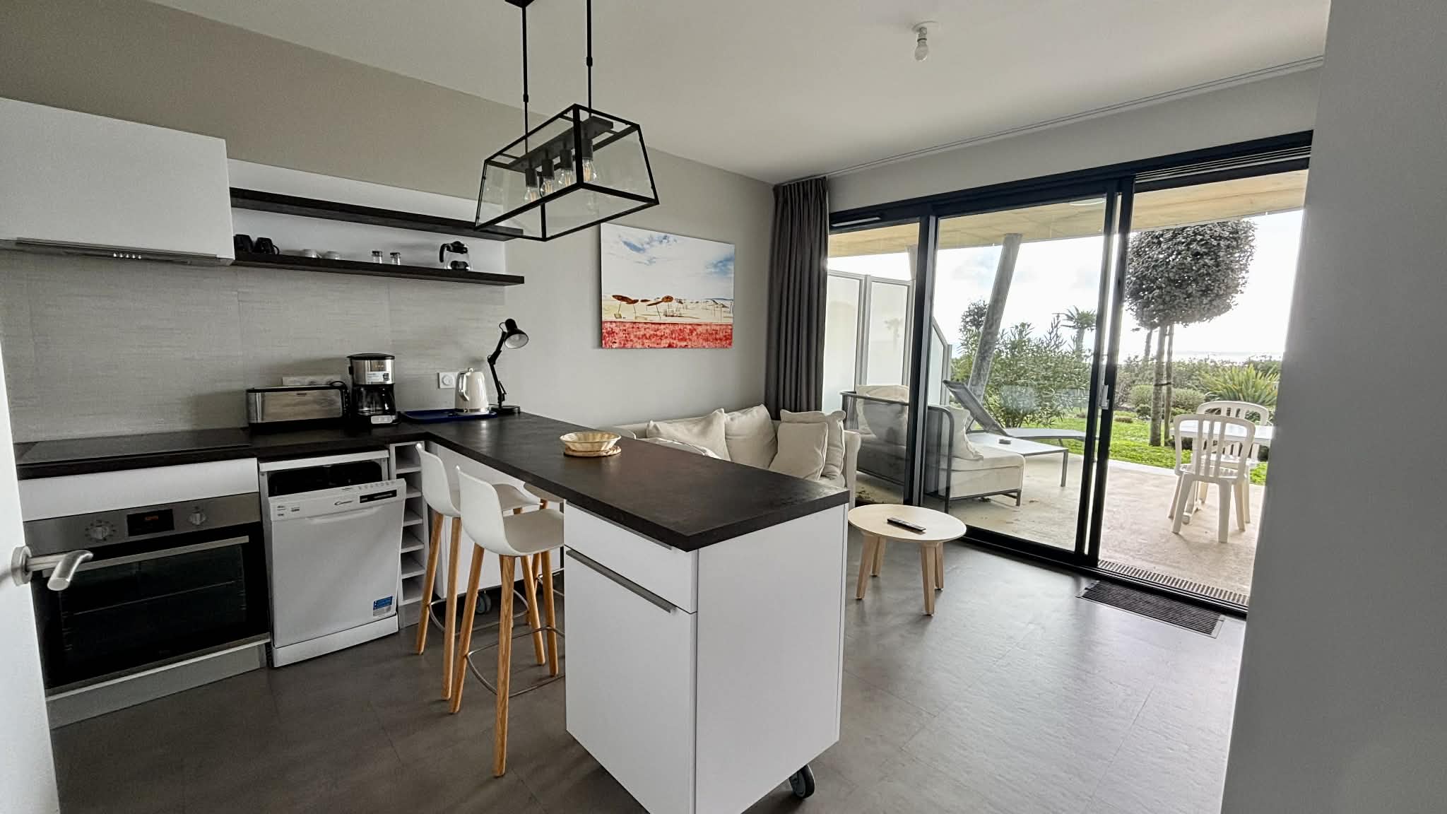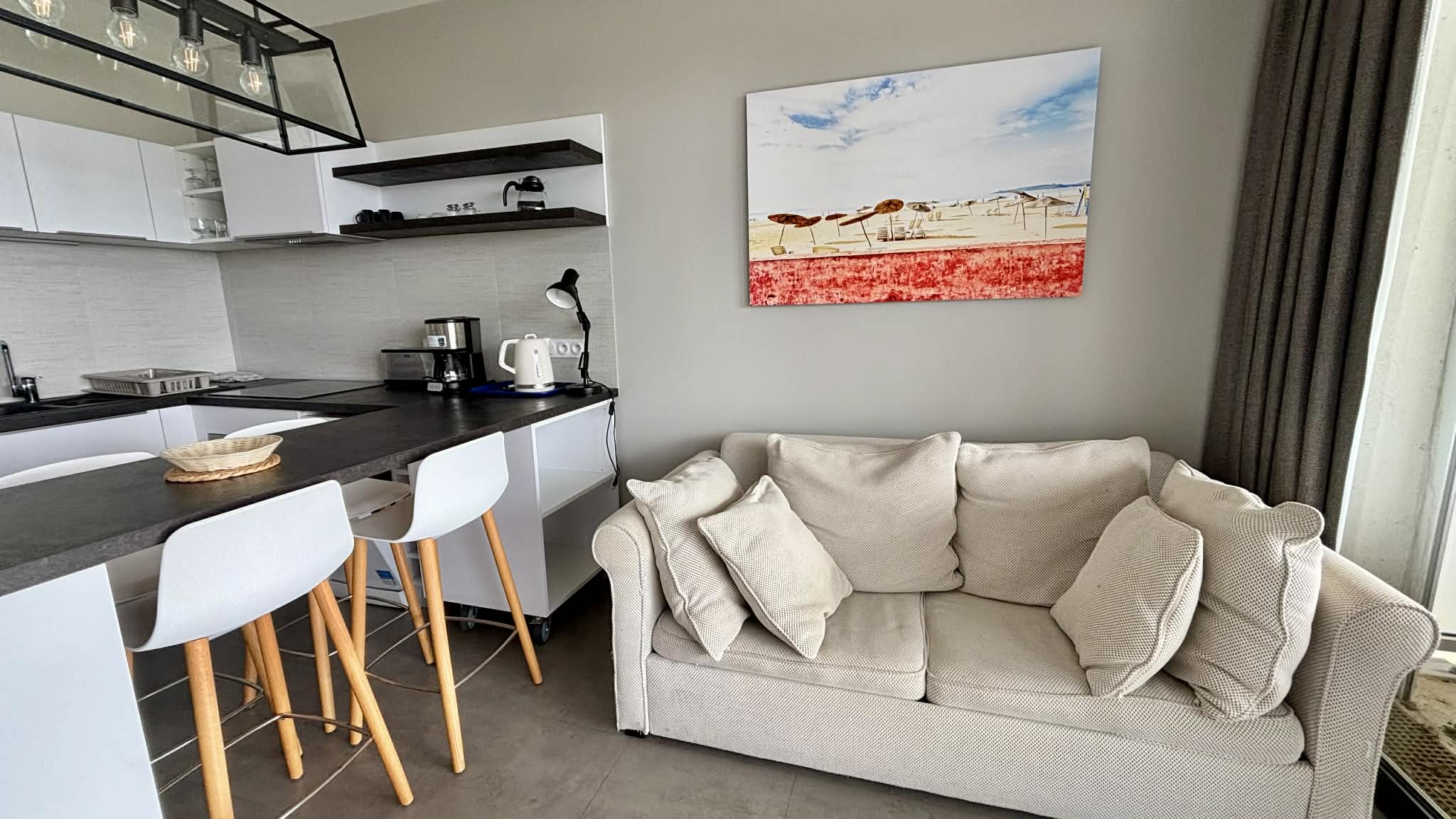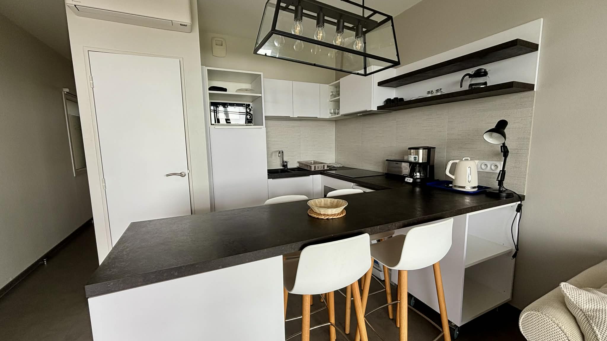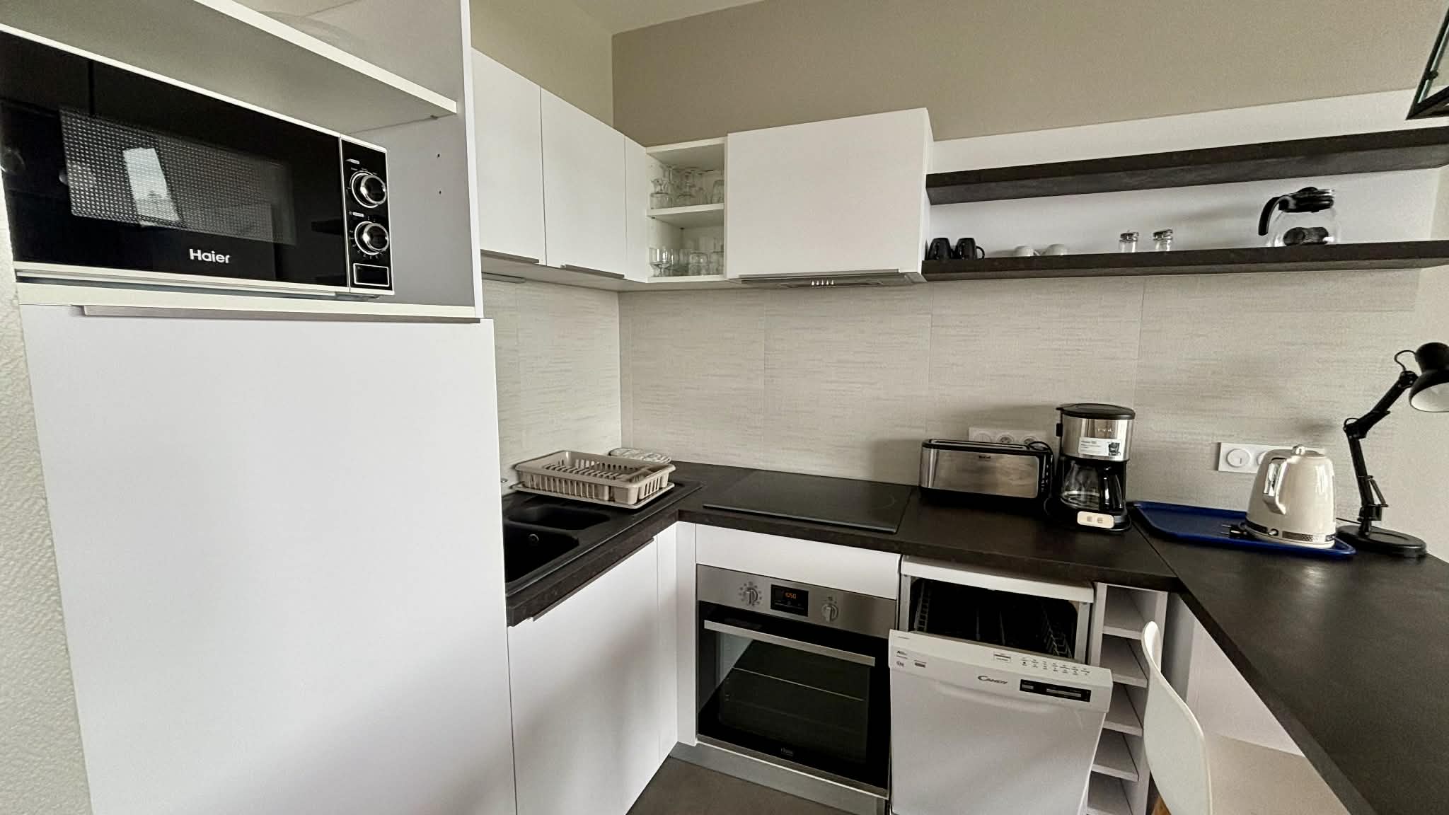 Cuisine équipée et aménagée ouverte (micro-ondes multifonctions, réfrigérateur/freezer, plaque induction, cafetière à filtre, grille-pain, bouilloire),