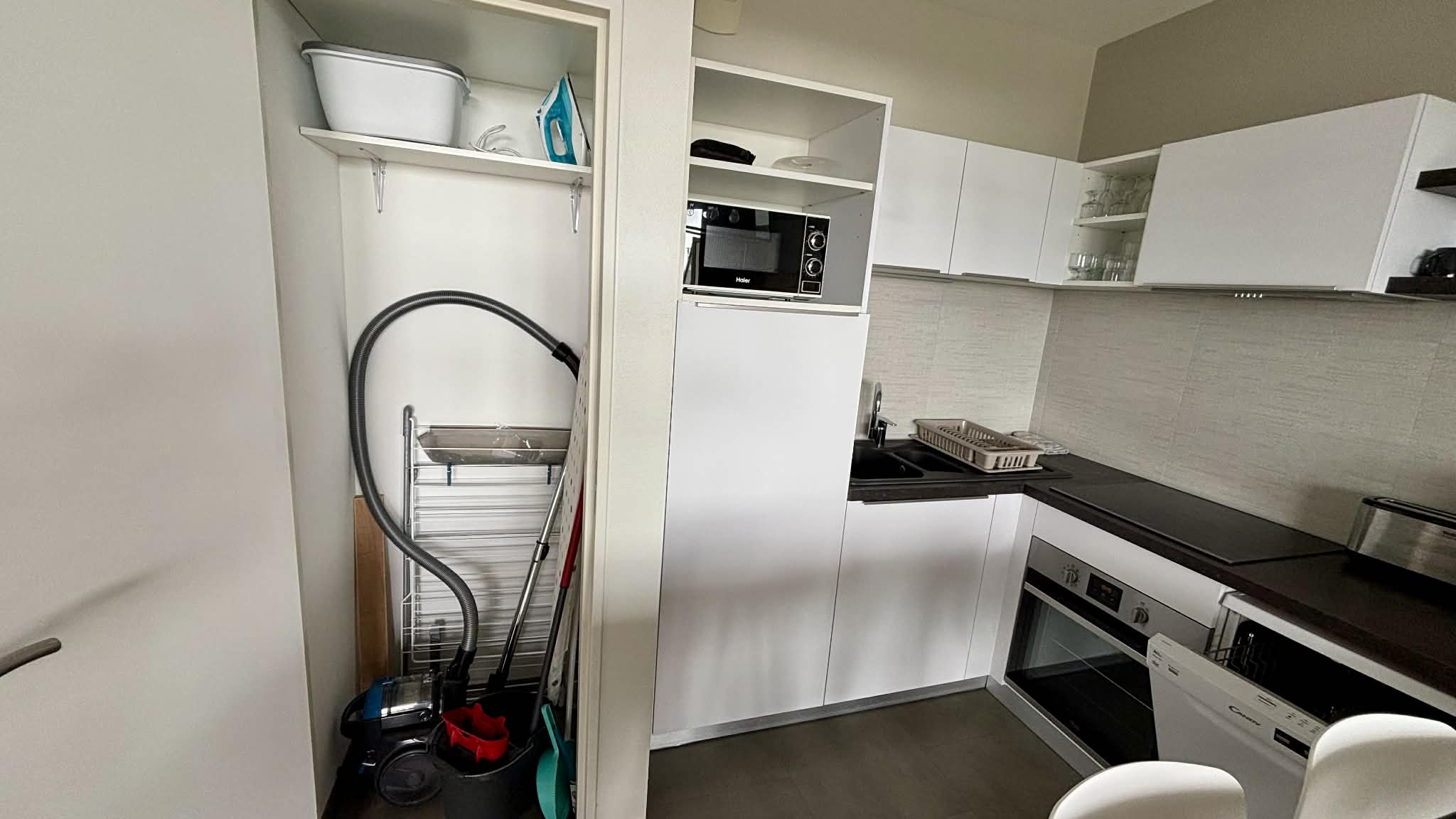 Placard de rangement avec nécessaire pour le nettoyage (aspirateur, serpillère, balais),