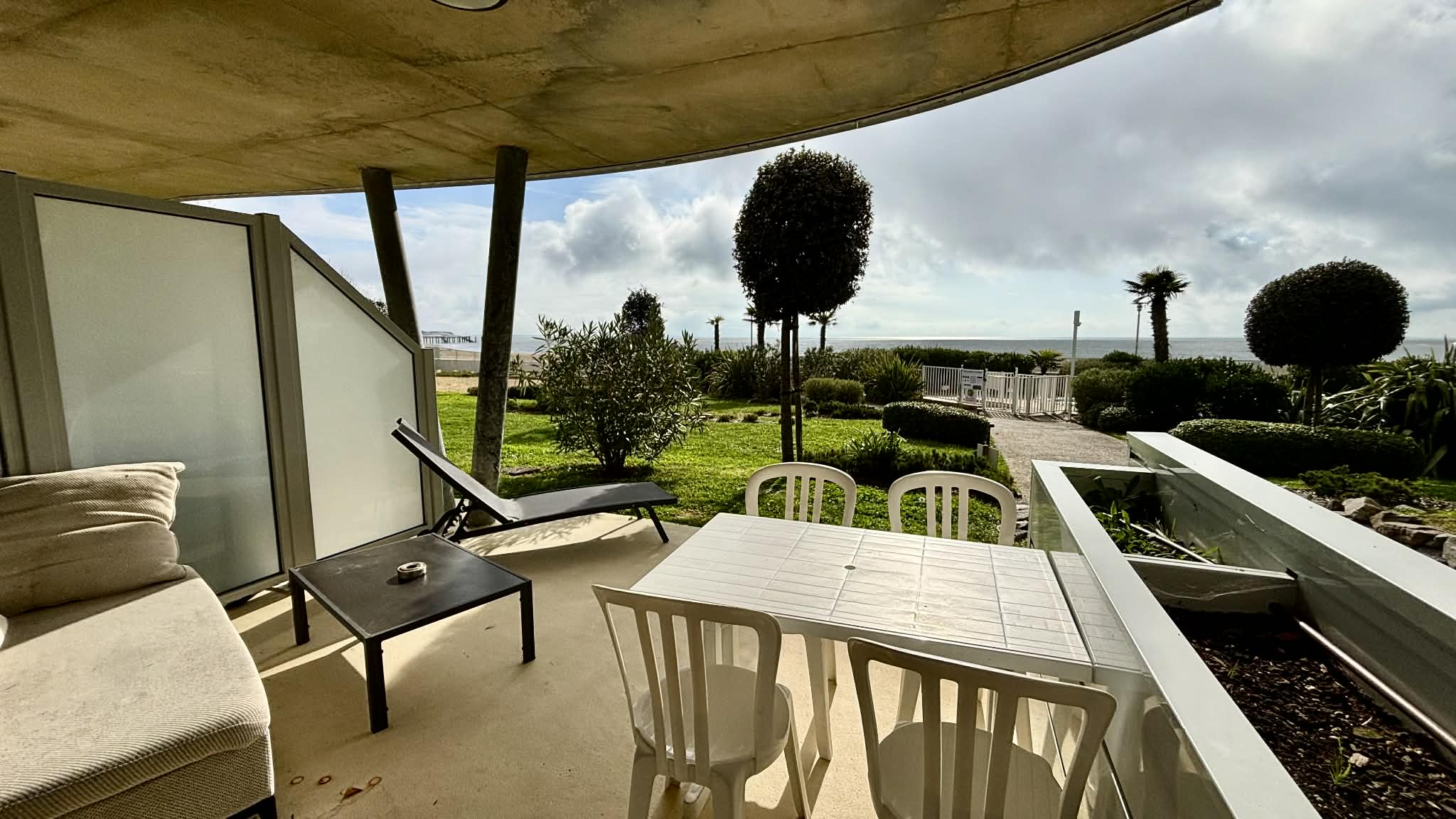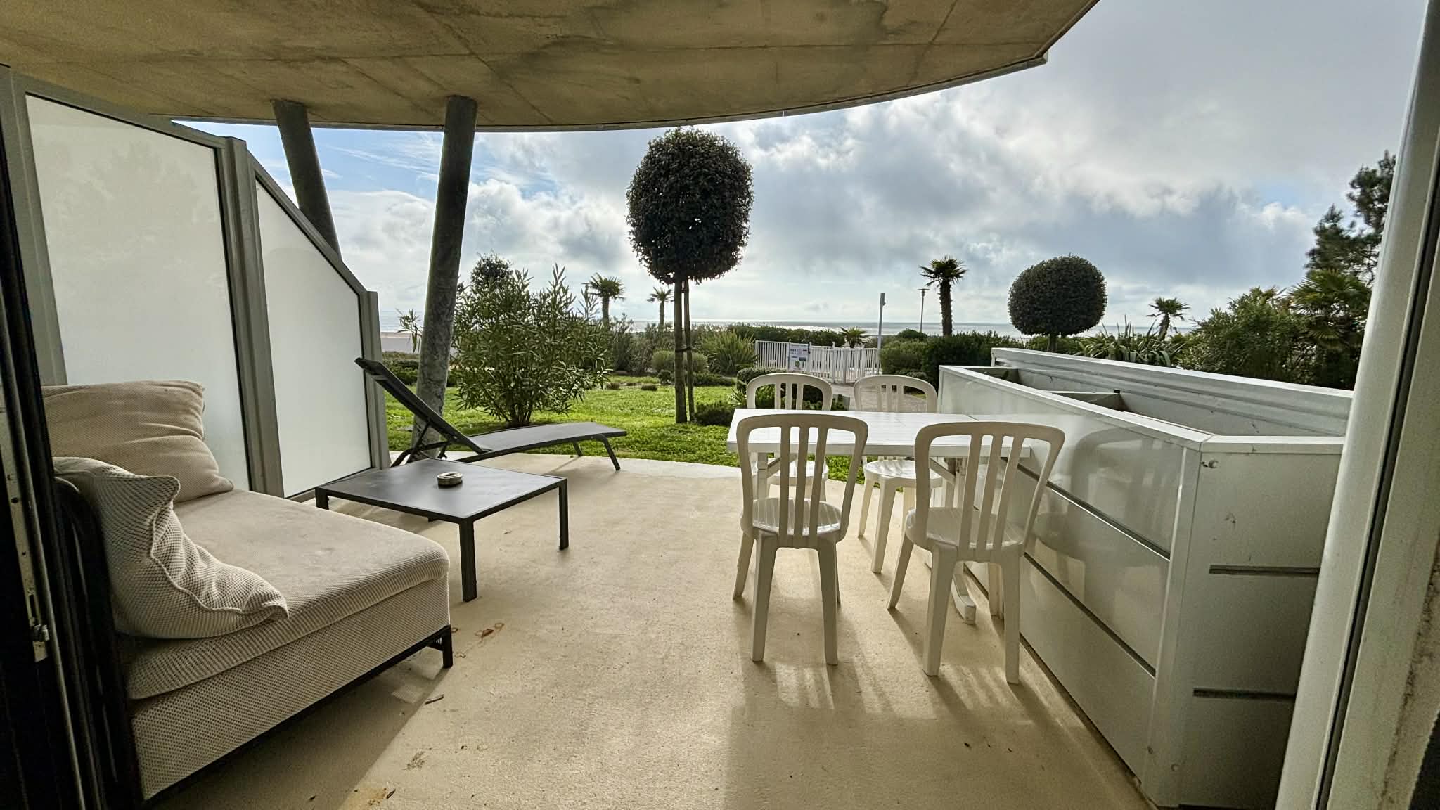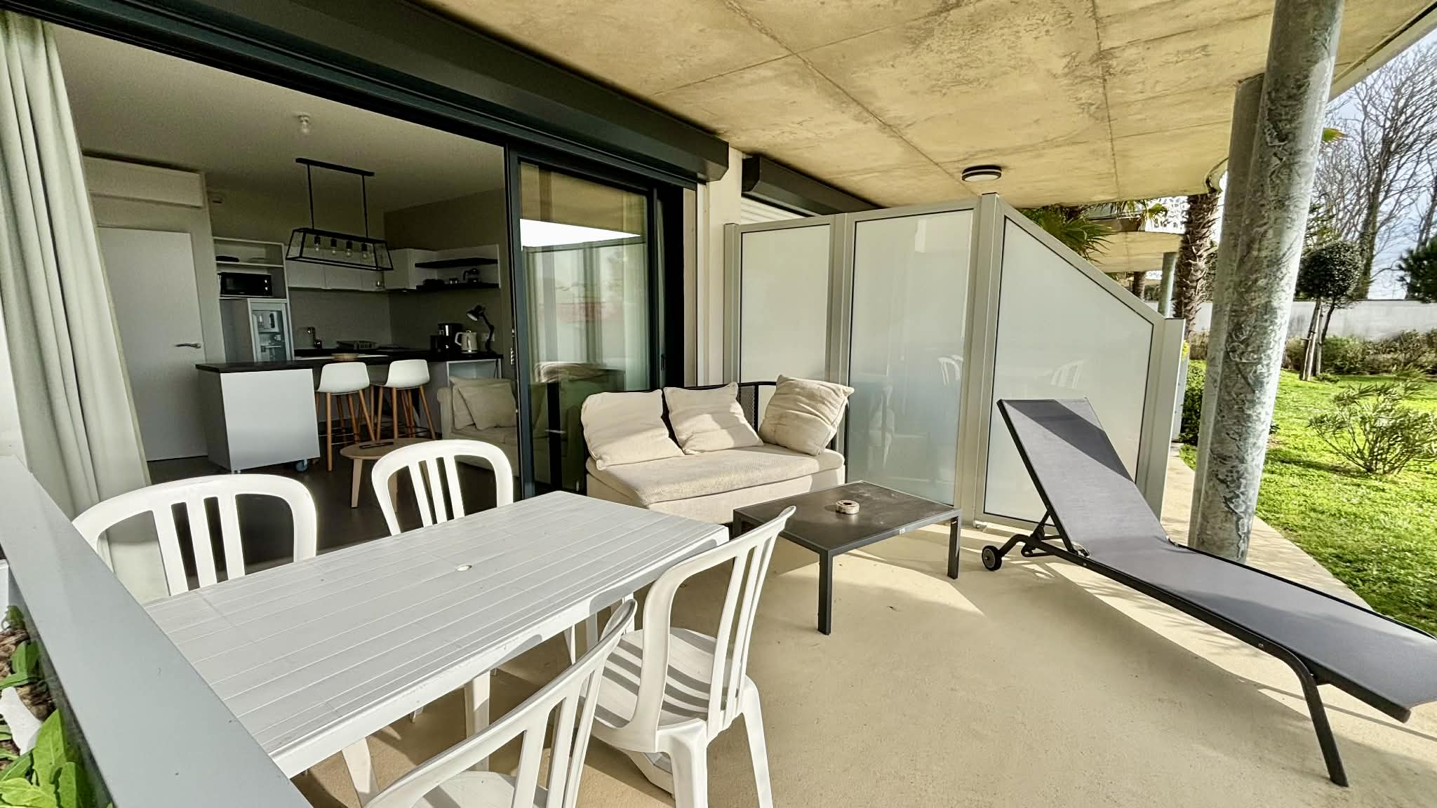 Terrasse en rez de jardin avec canapé, bain de soleil, table et chaises pour les repas.
