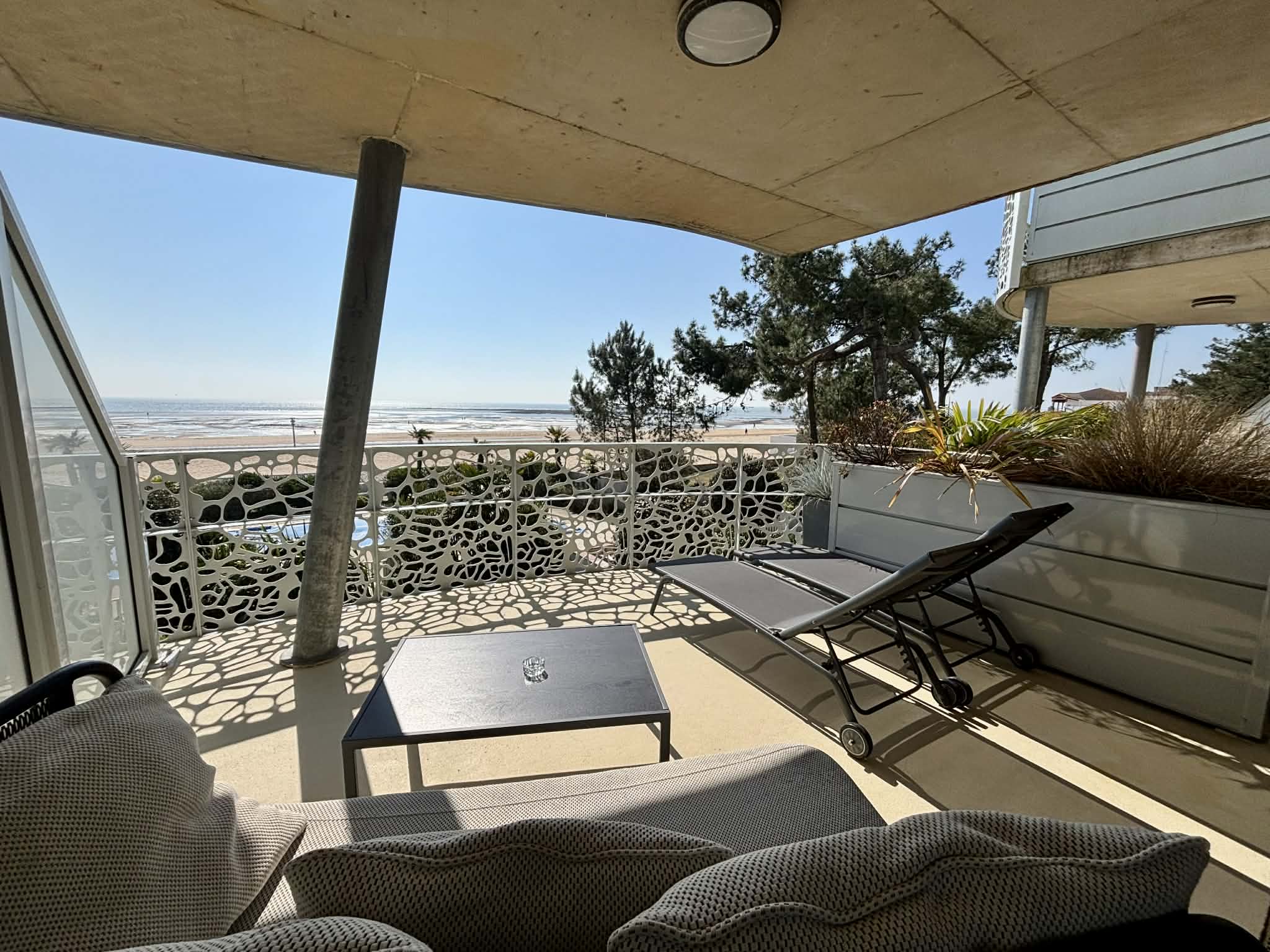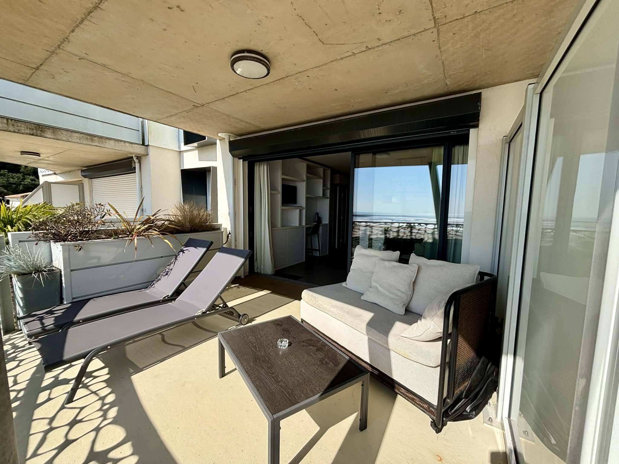 Terrasse en rez de jardin avec canapé, bain de soleil, table et chaises pour les repas.