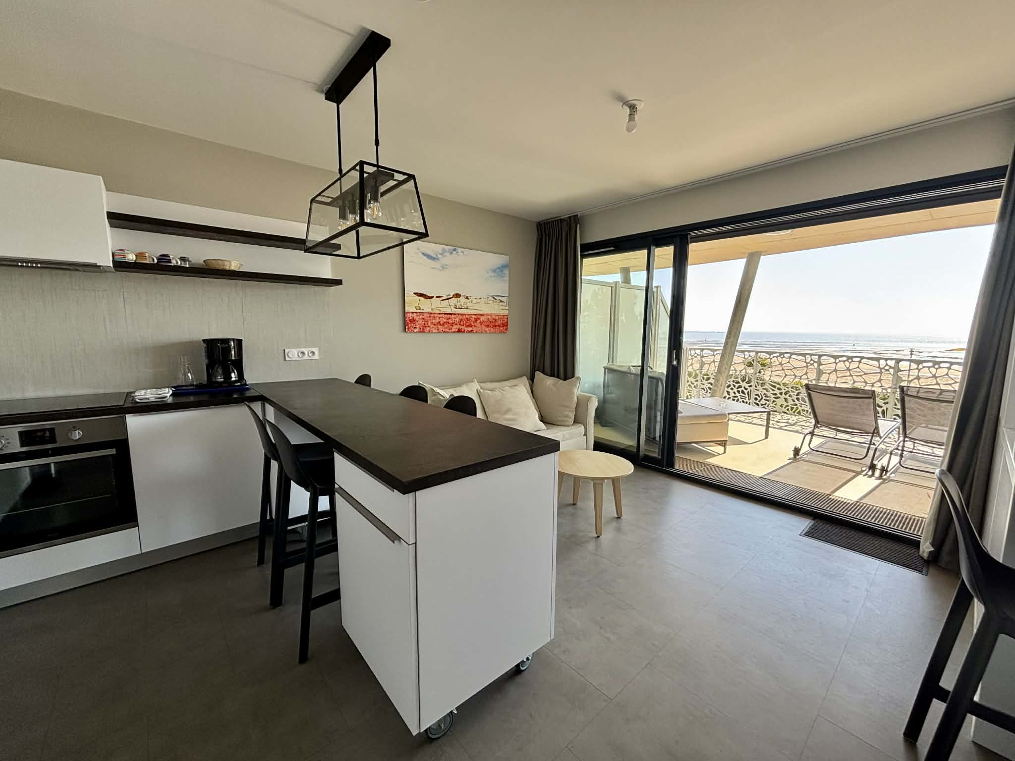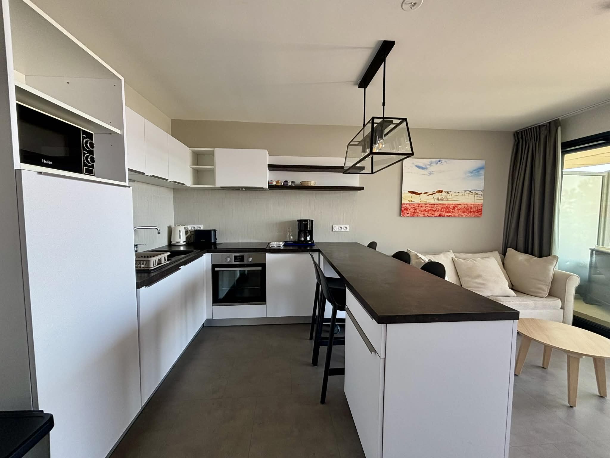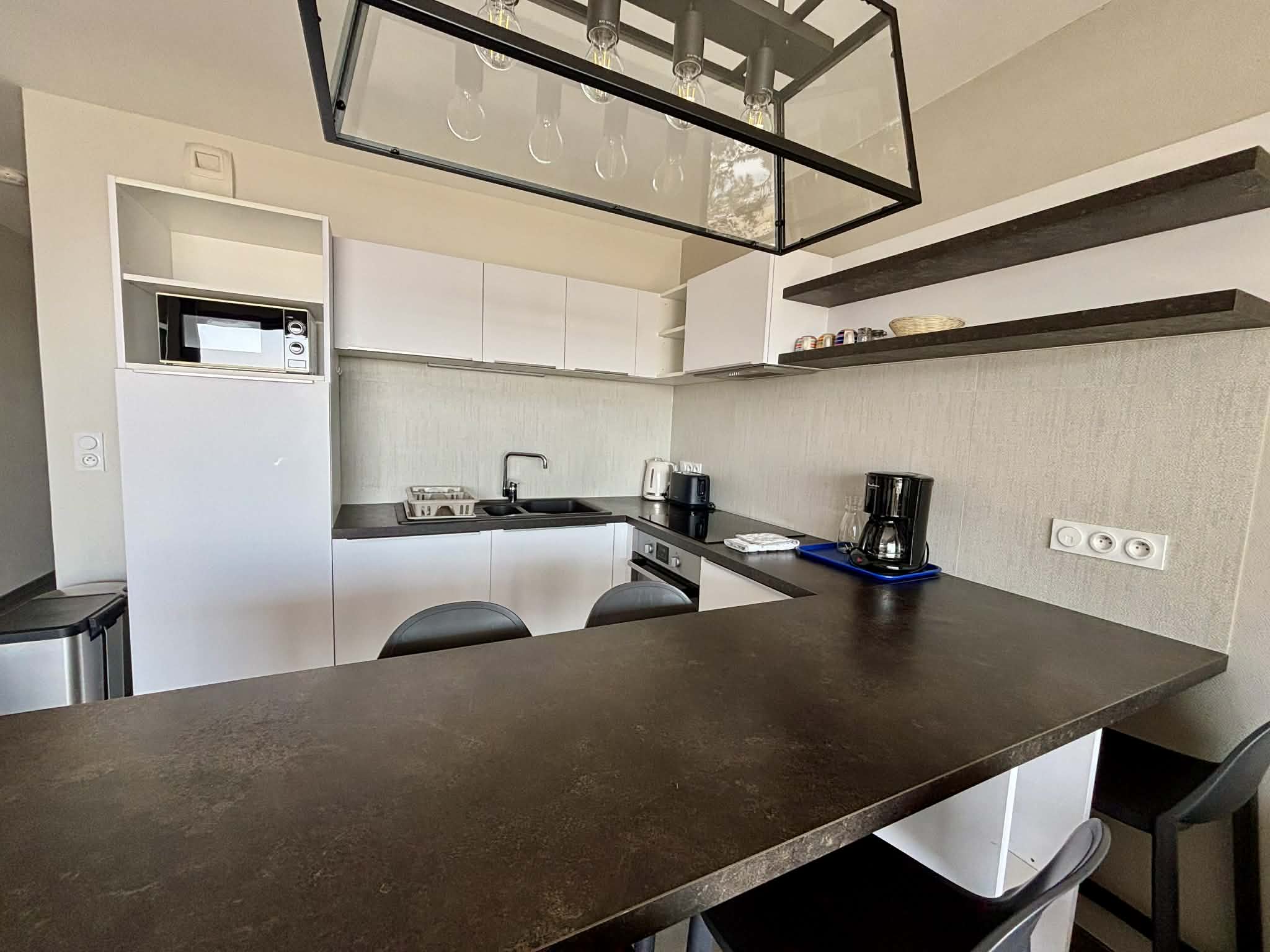 Cuisine équipée et aménagée ouverte (micro-ondes multifonctions, réfrigérateur/freezer, plaque induction, cafetière à filtre, grille-pain, bouilloire),