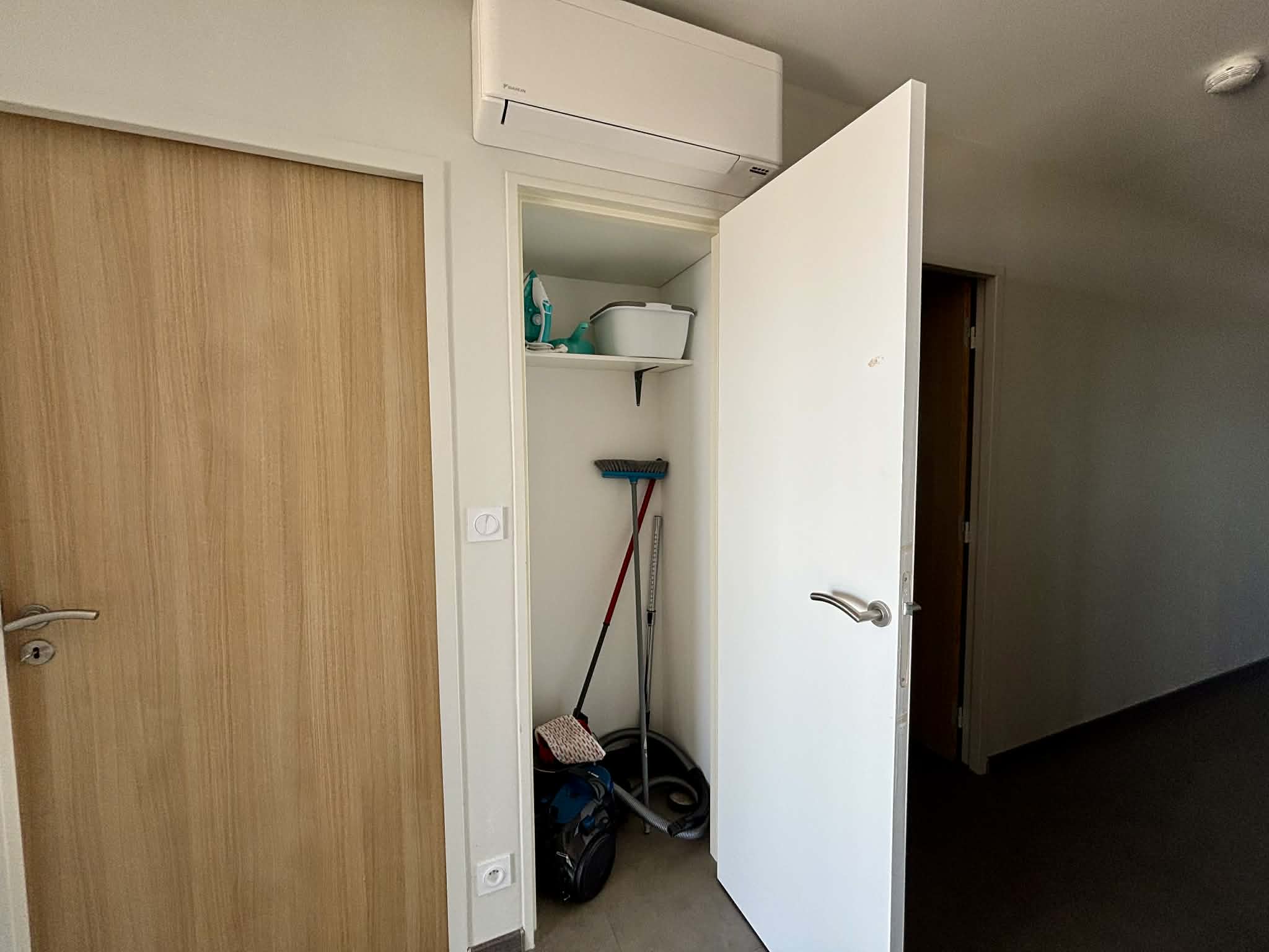 Placard de rangement avec nécessaire pour le nettoyage (aspirateur, serpillère, balais),