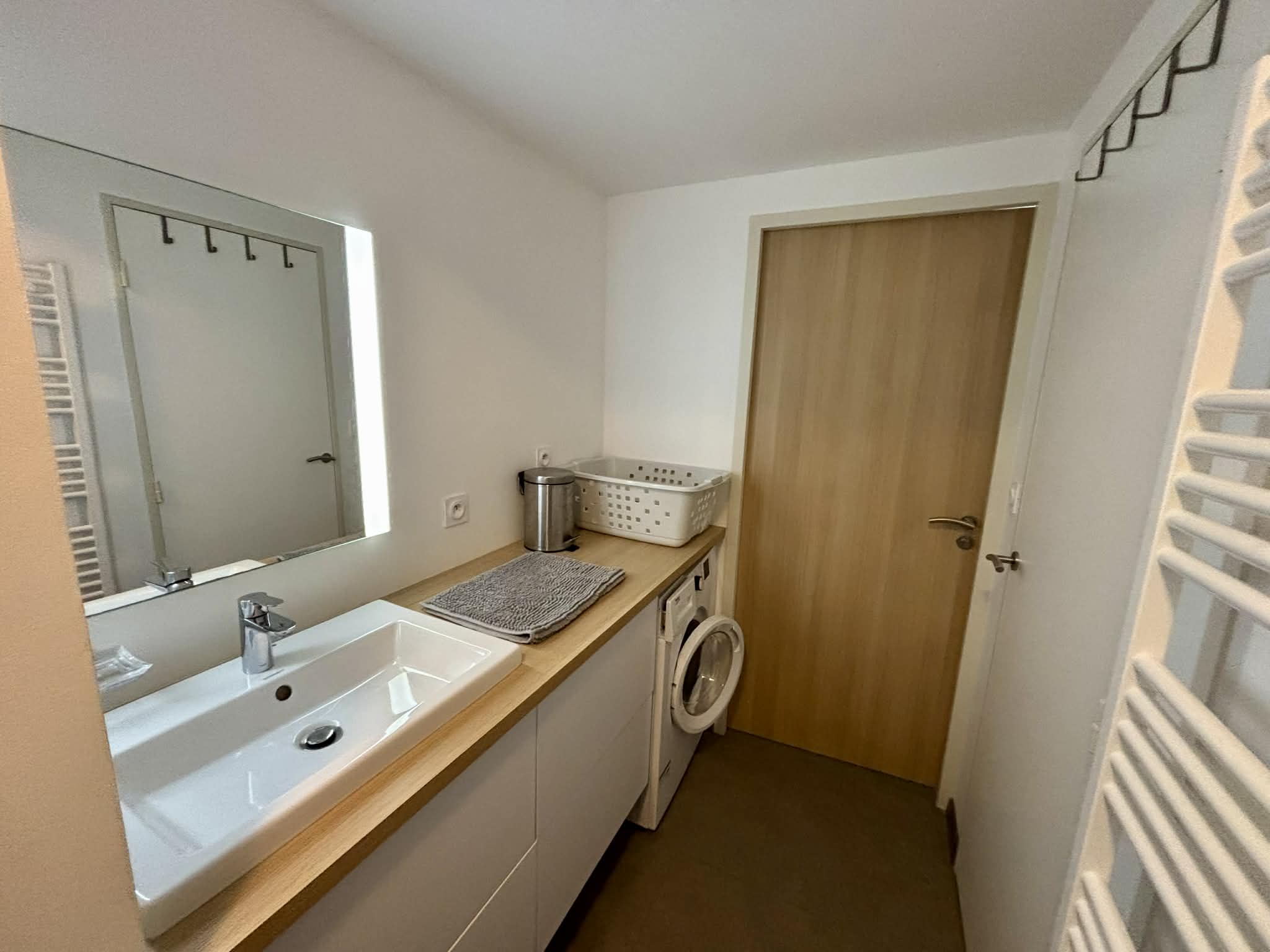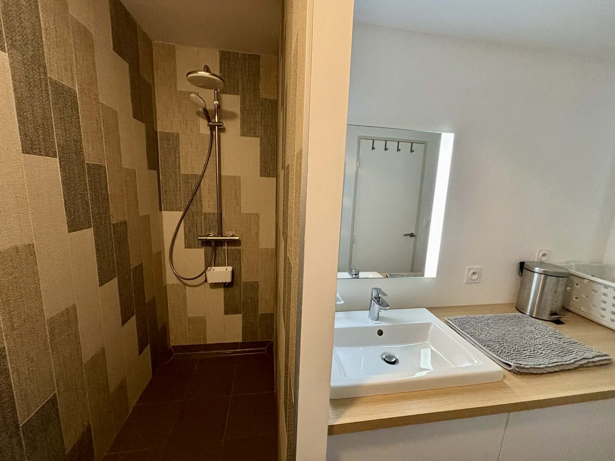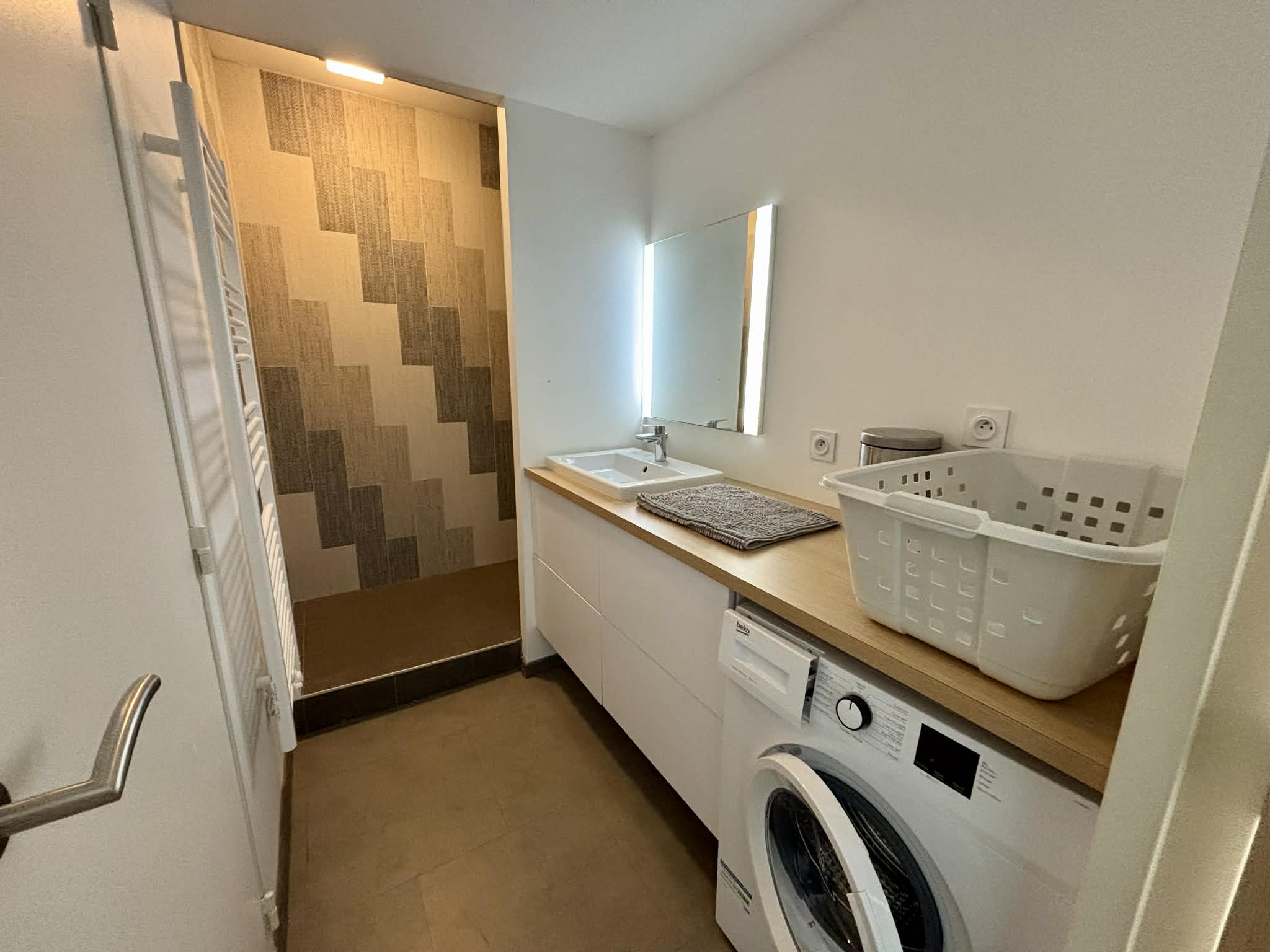 Salle d'eau avec douche à l'italienne, meuble vasque, sèche-serviette,