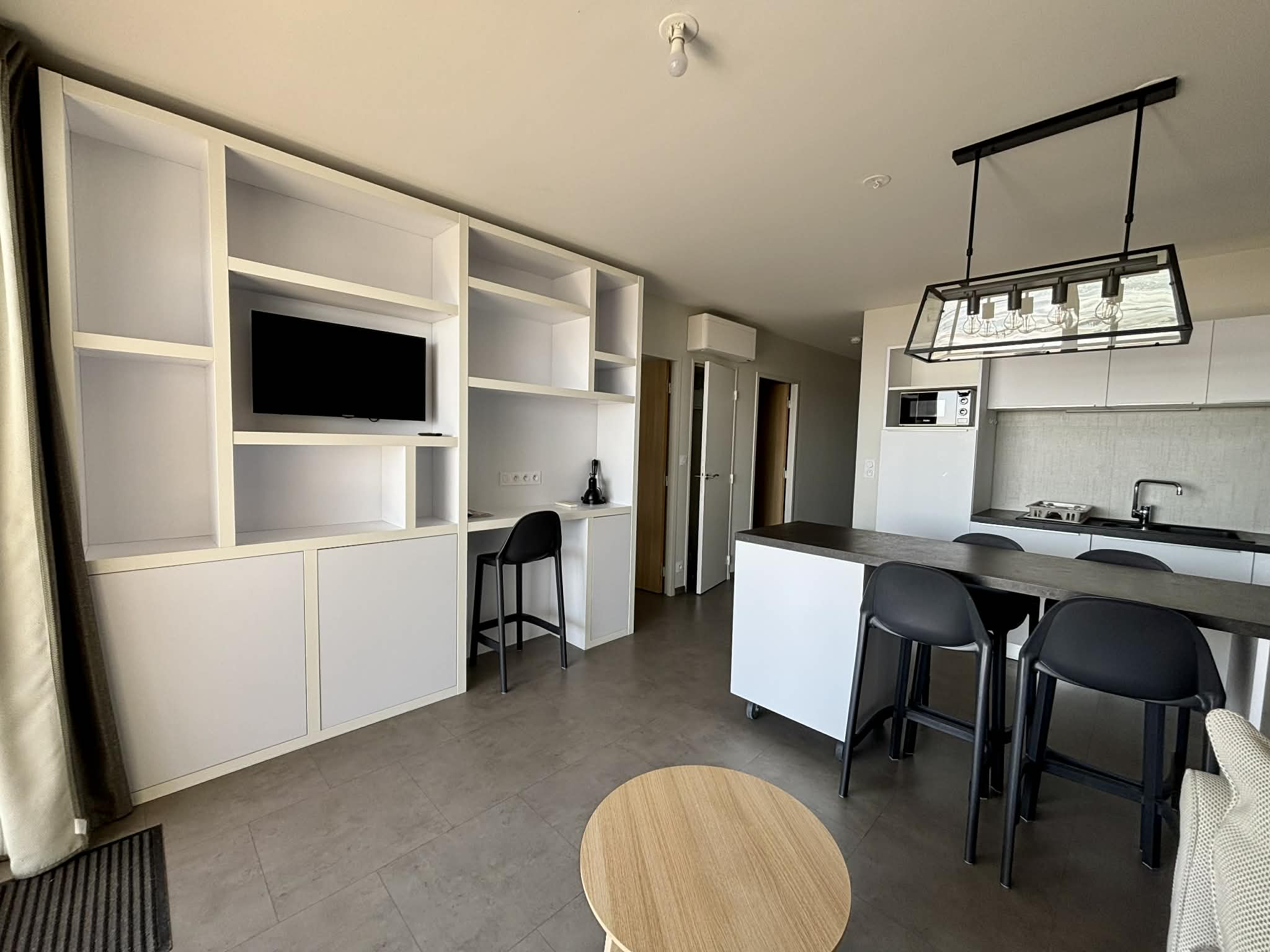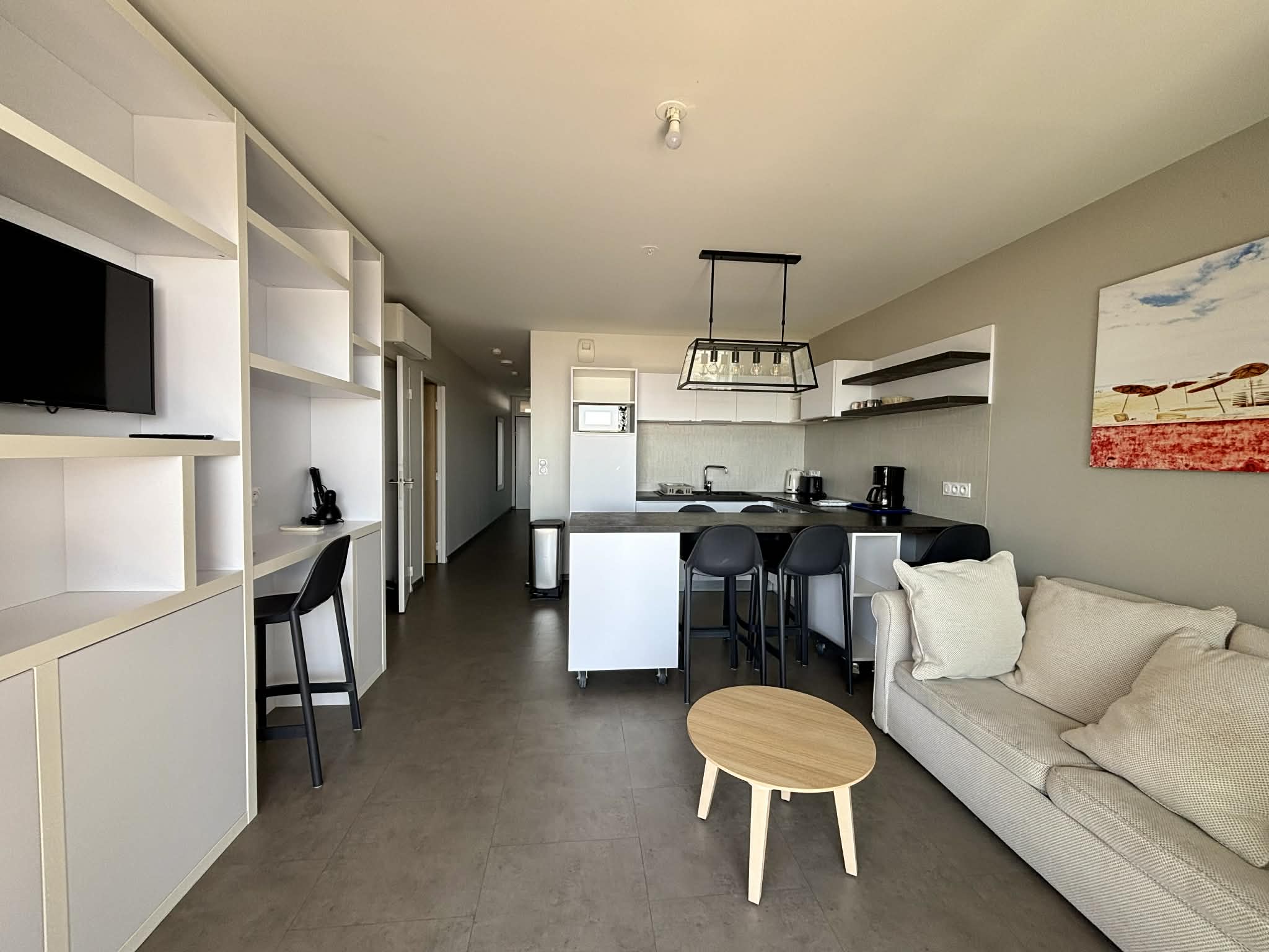 Salon/séjour avec îlot central, canapé convertible en 140, télévision écran plat,
