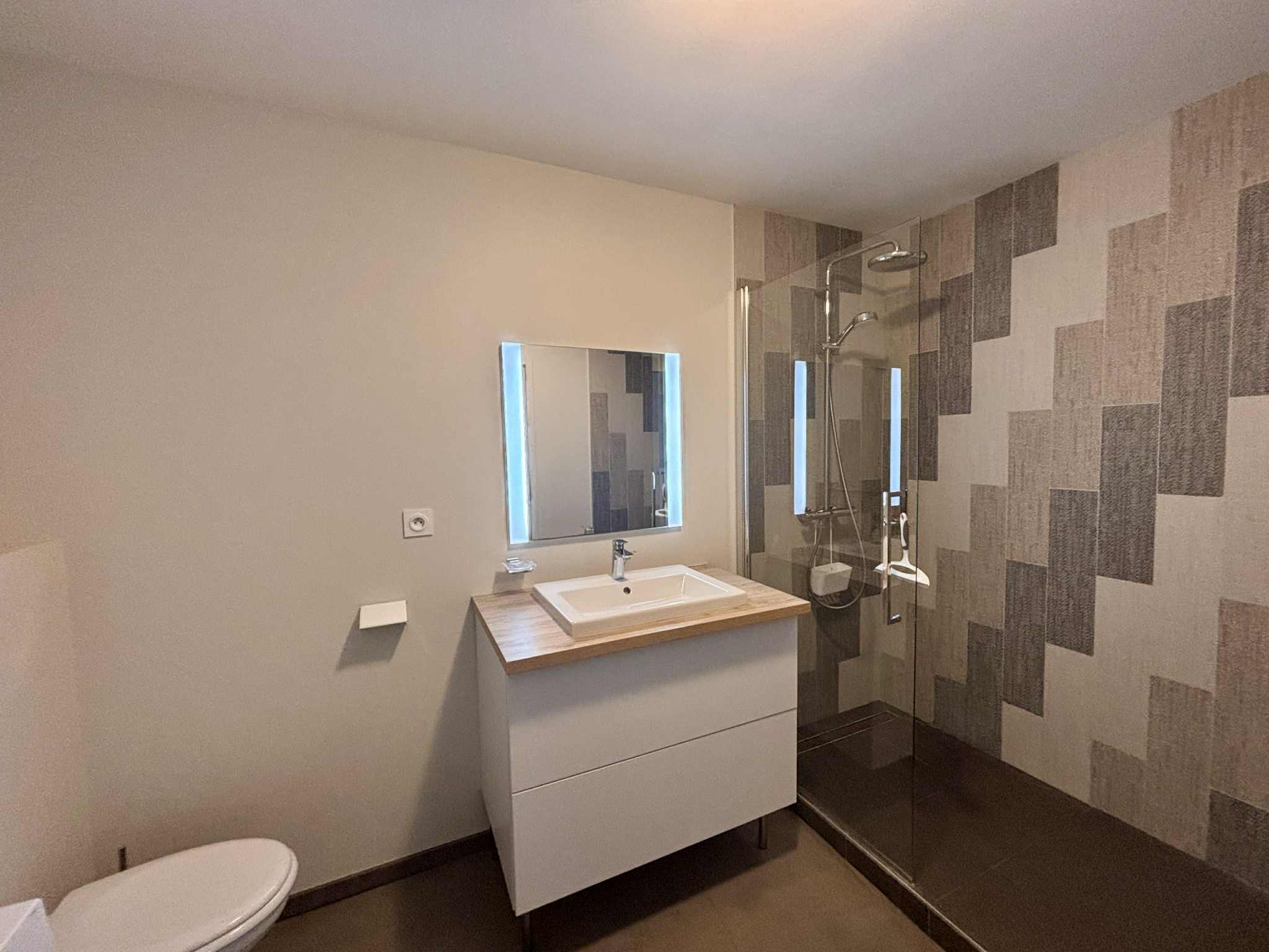 Salle d'eau avec douche à l'italienne, meuble vasque, sèche-serviette et WC,