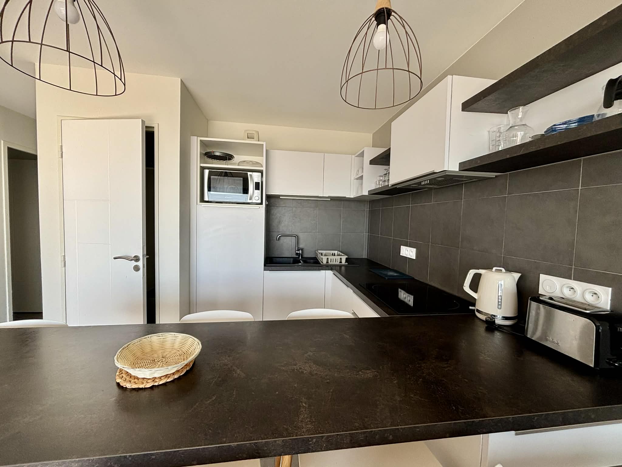 Cuisine équipée et aménagée ouverte (micro-ondes multifonctions, réfrigérateur/freezer, plaque induction, cafetière à filtre, grille-pain, bouilloire),