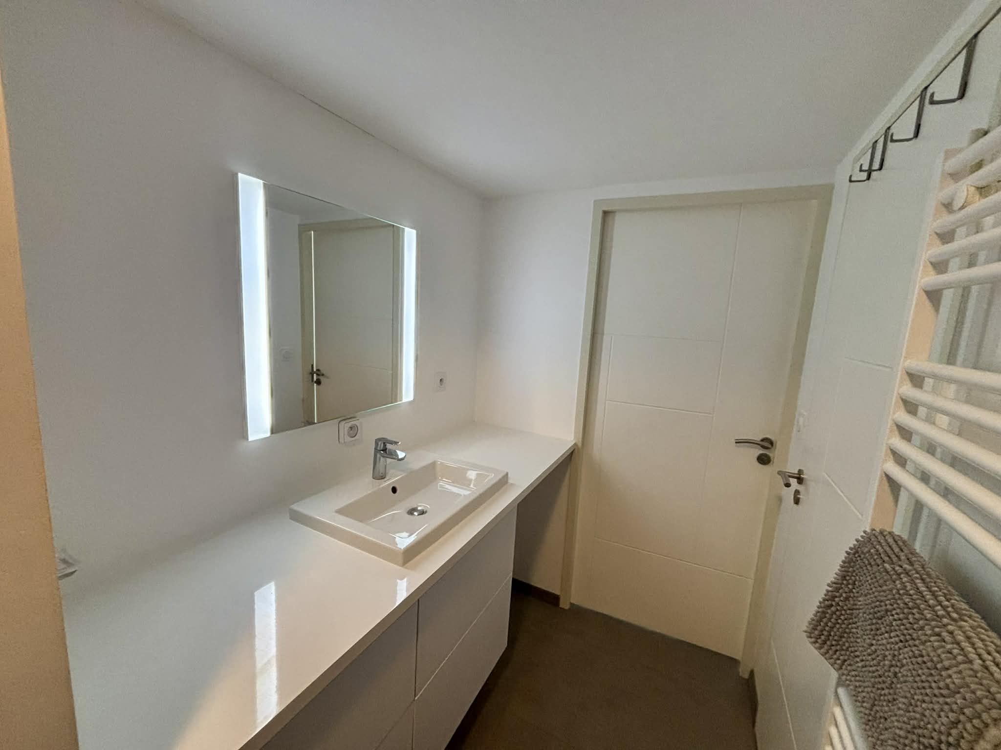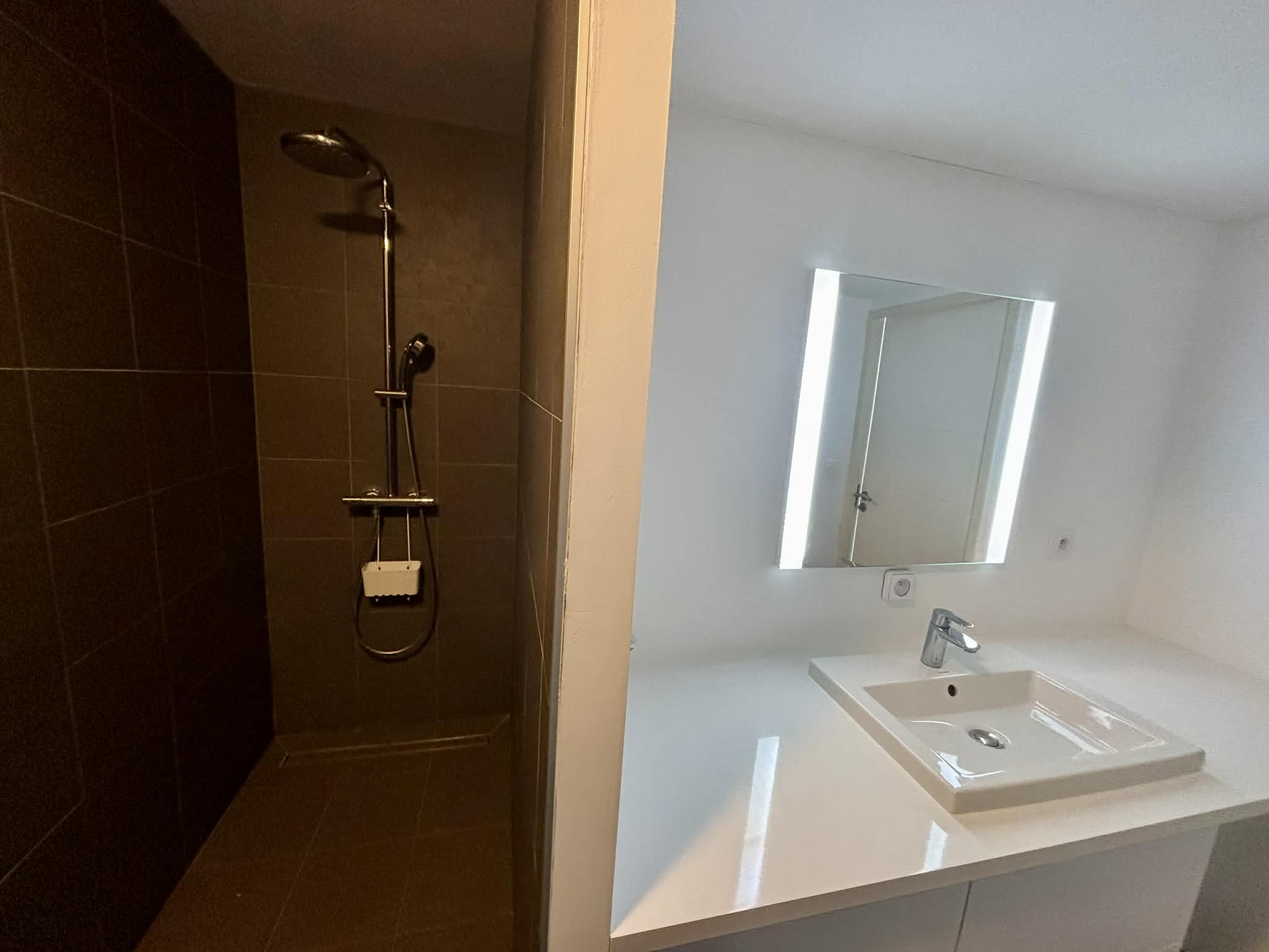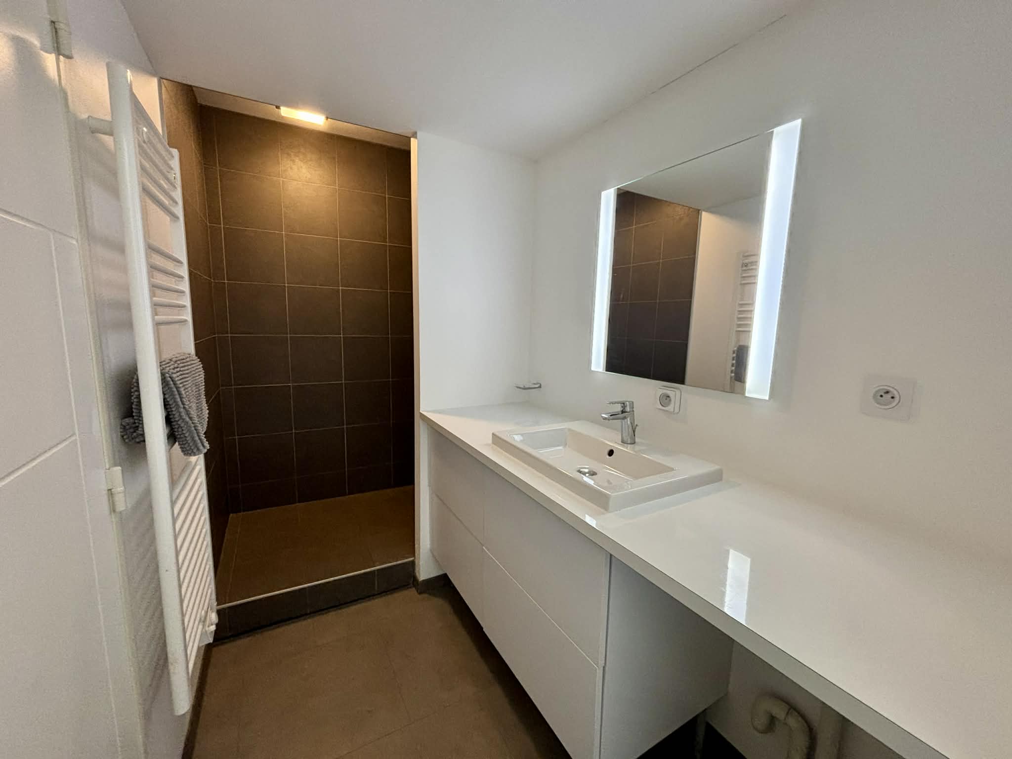 Salle d'eau avec douche à l'italienne, meuble vasque, sèche-serviette,