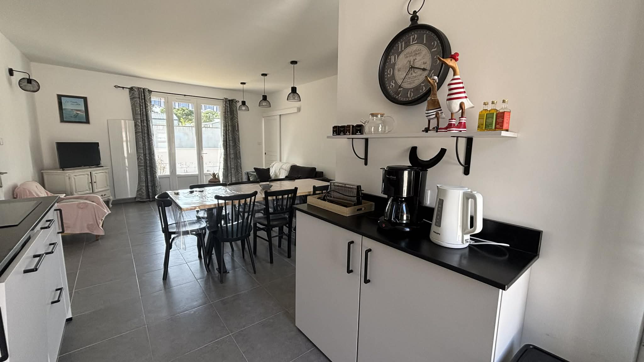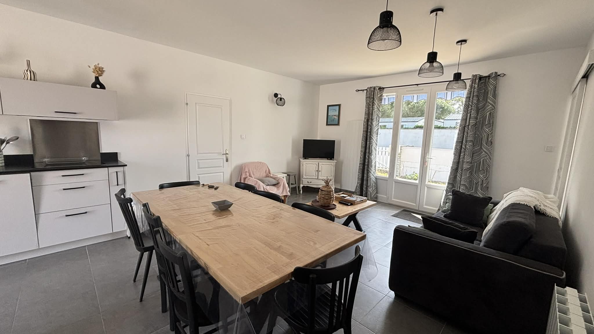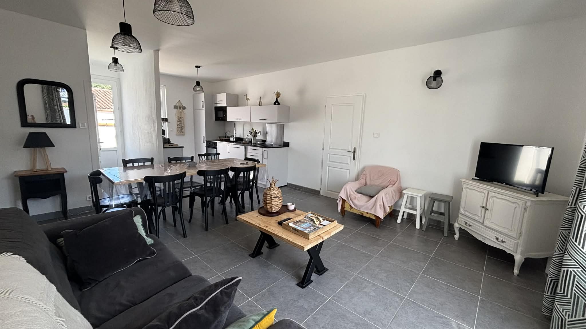 Une pièce de vie ouverte sur le coin cuisine (plaque induction, lave-vaisselle, micro-ondes, four...).