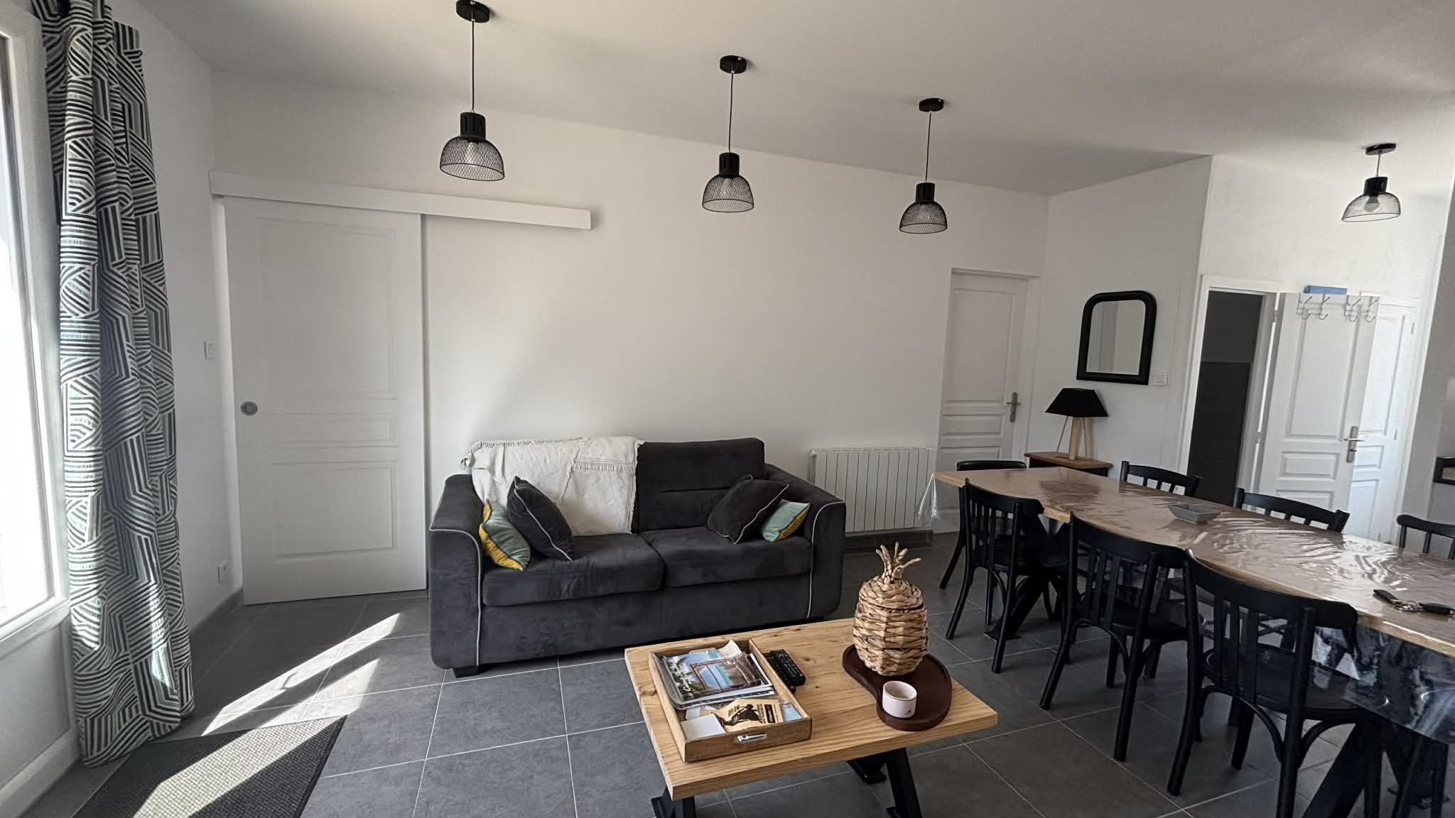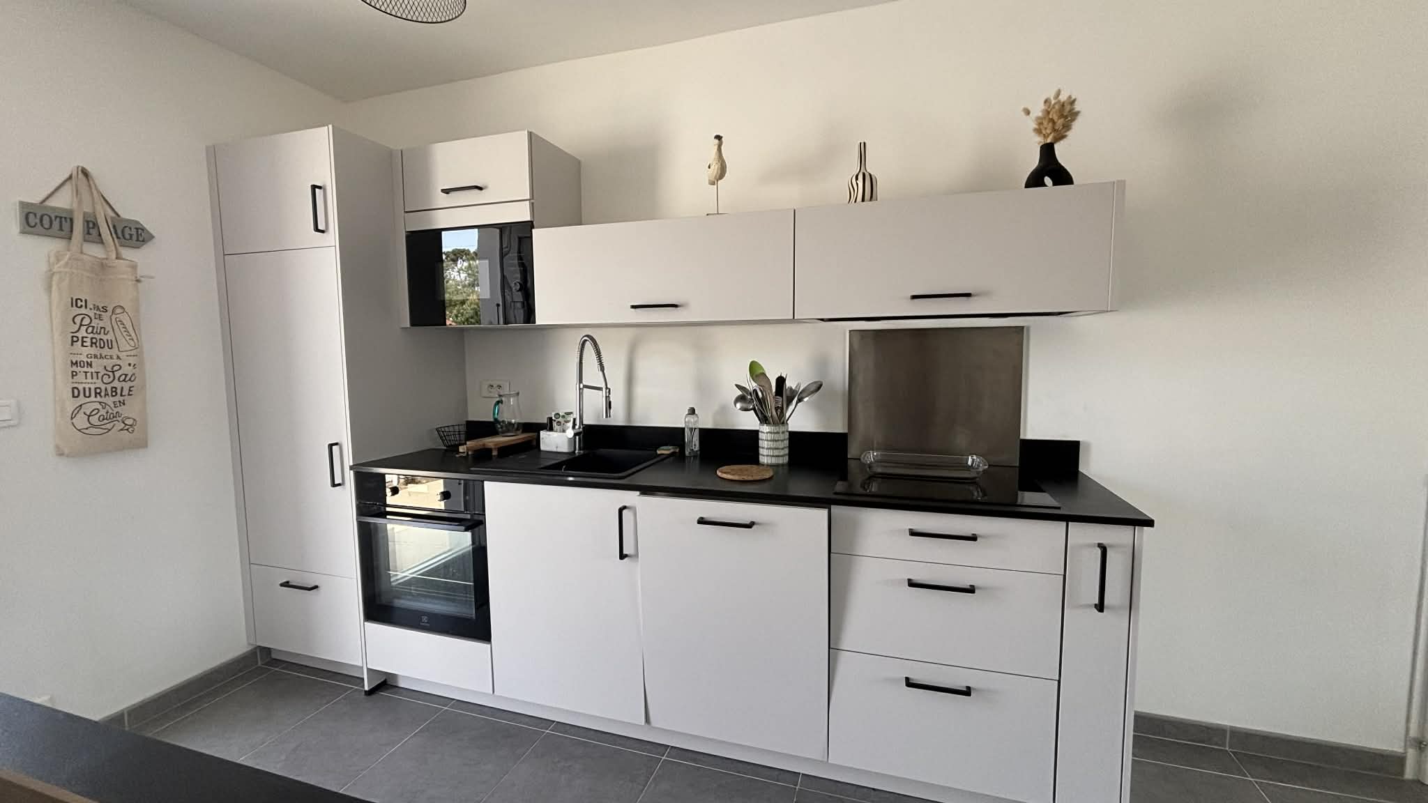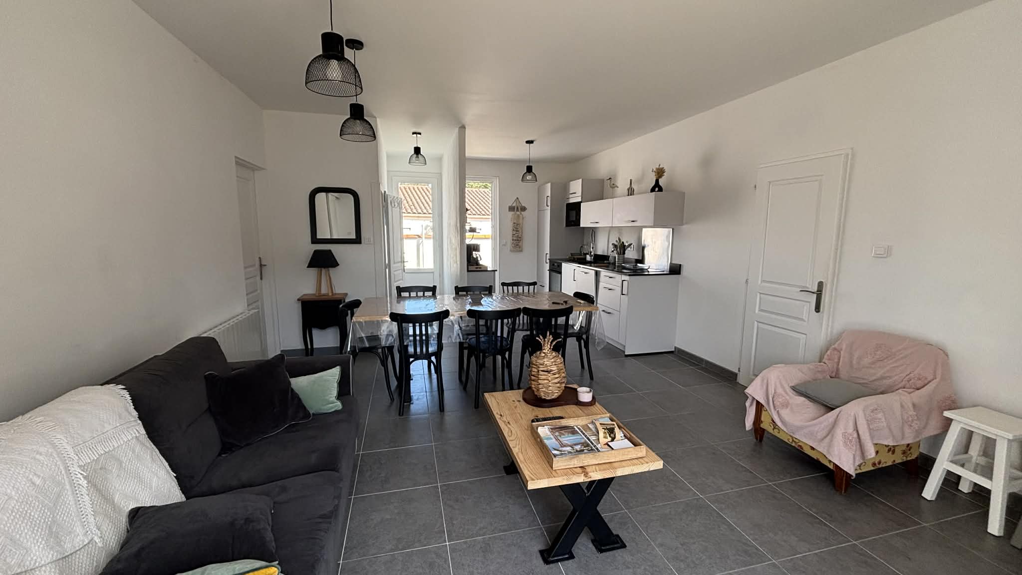 Une pièce de vie ouverte sur le coin cuisine (plaque induction, lave-vaisselle, micro-ondes, four...).