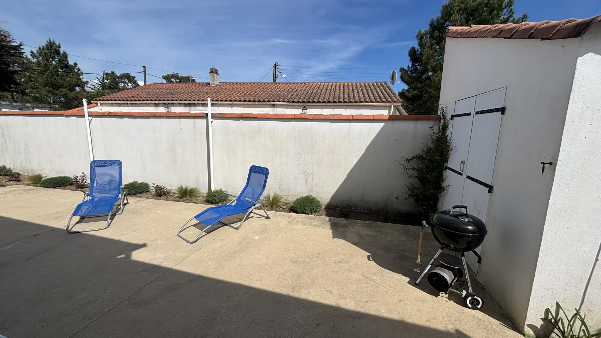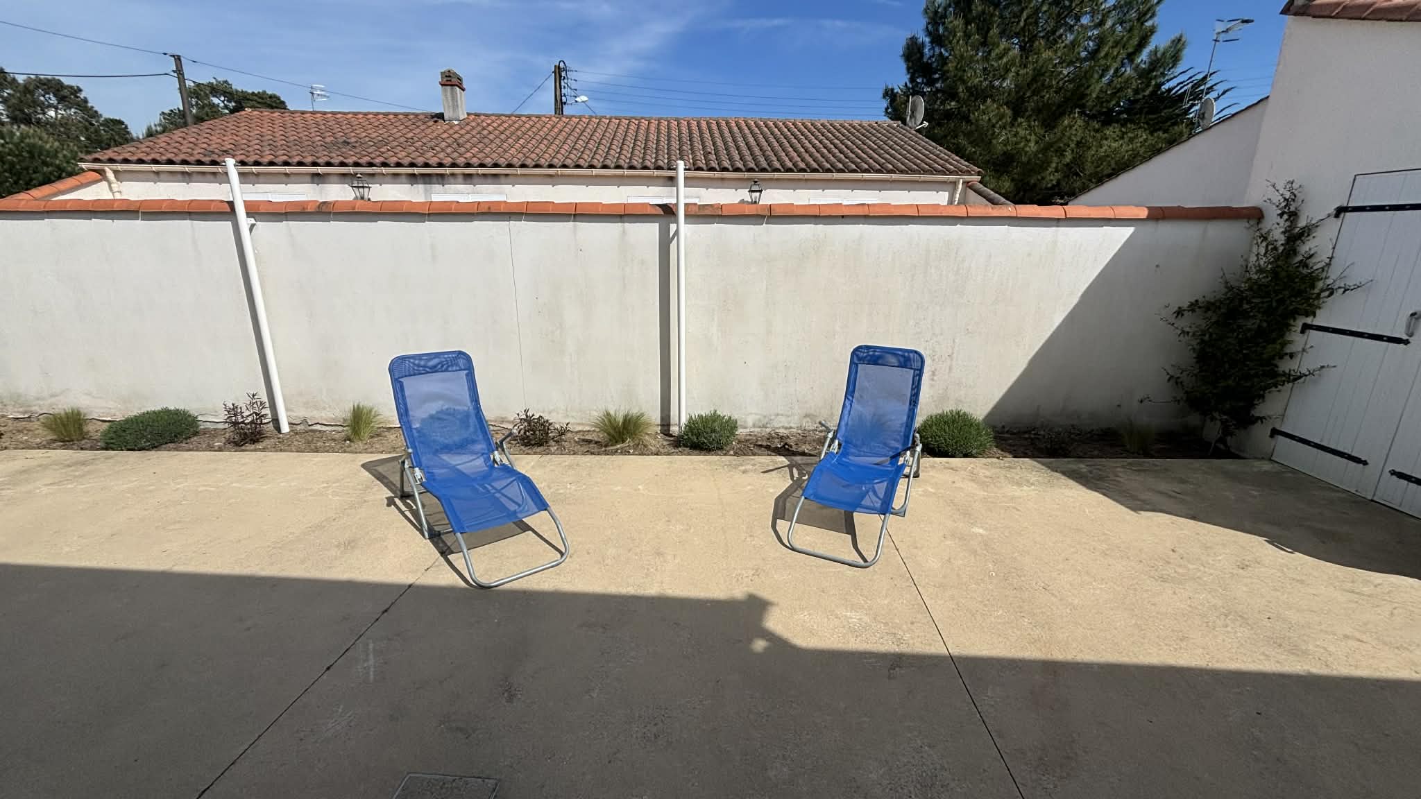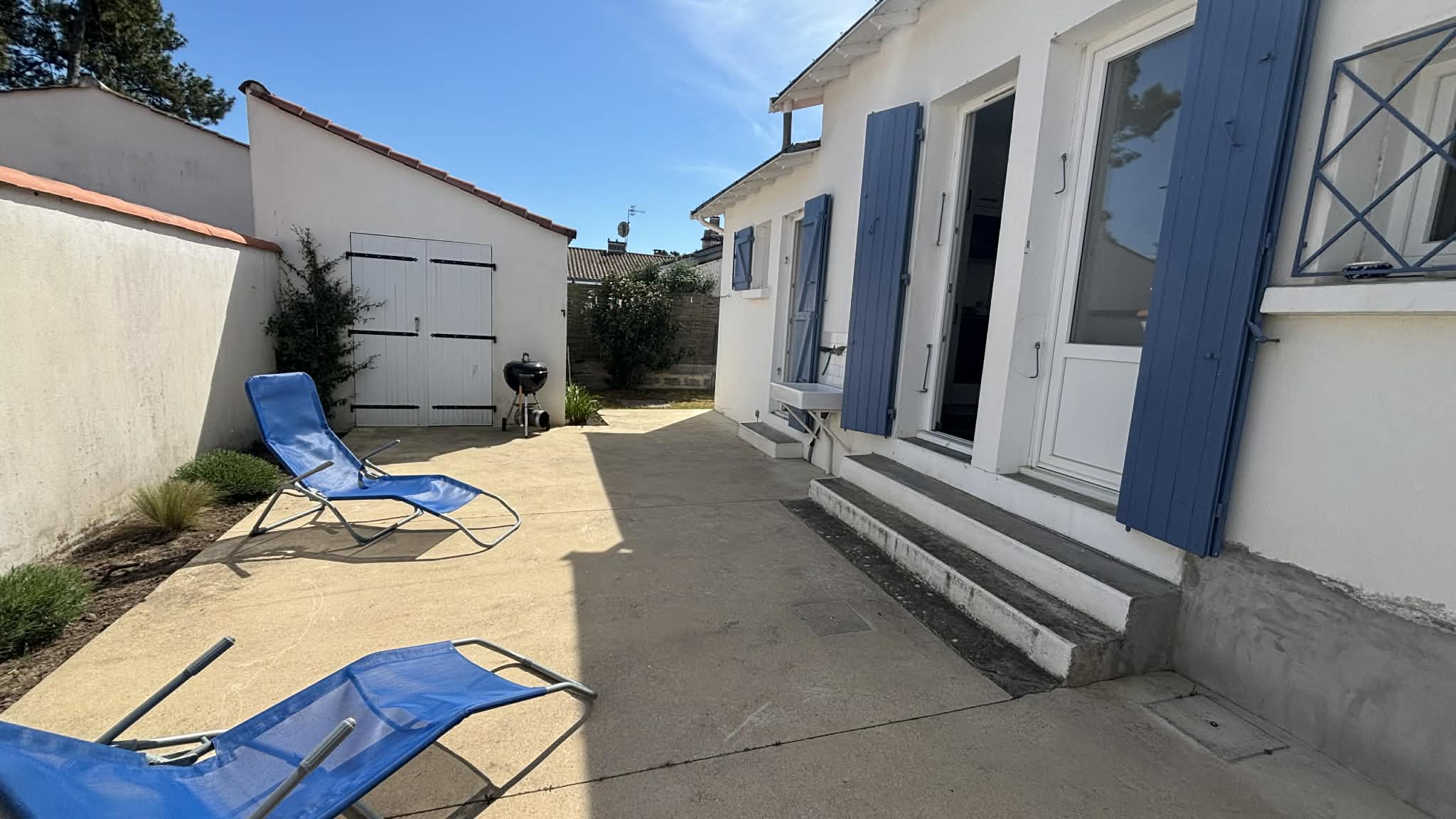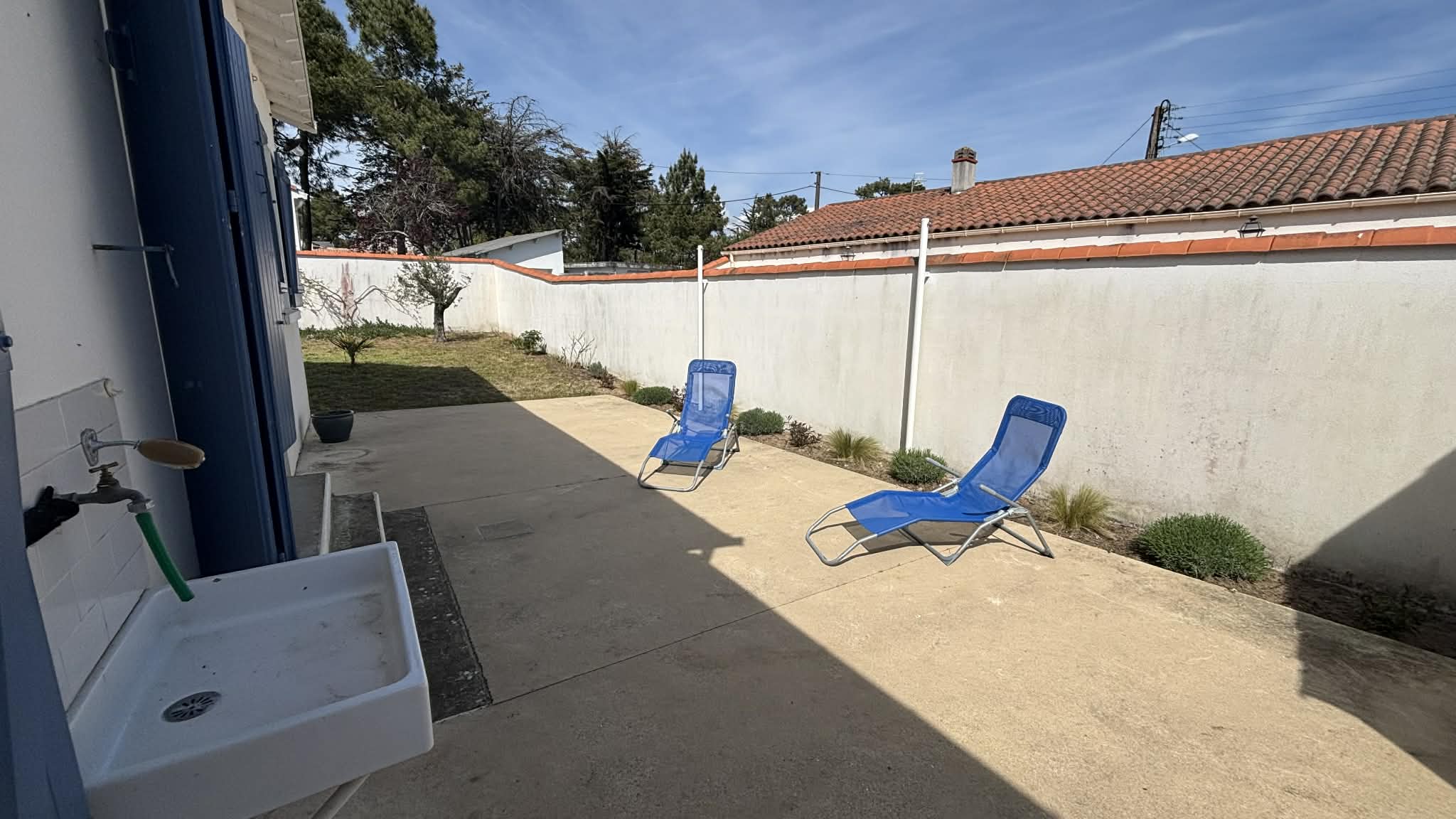 Terrasse avec le mobilier de jardin, bain de soleil.