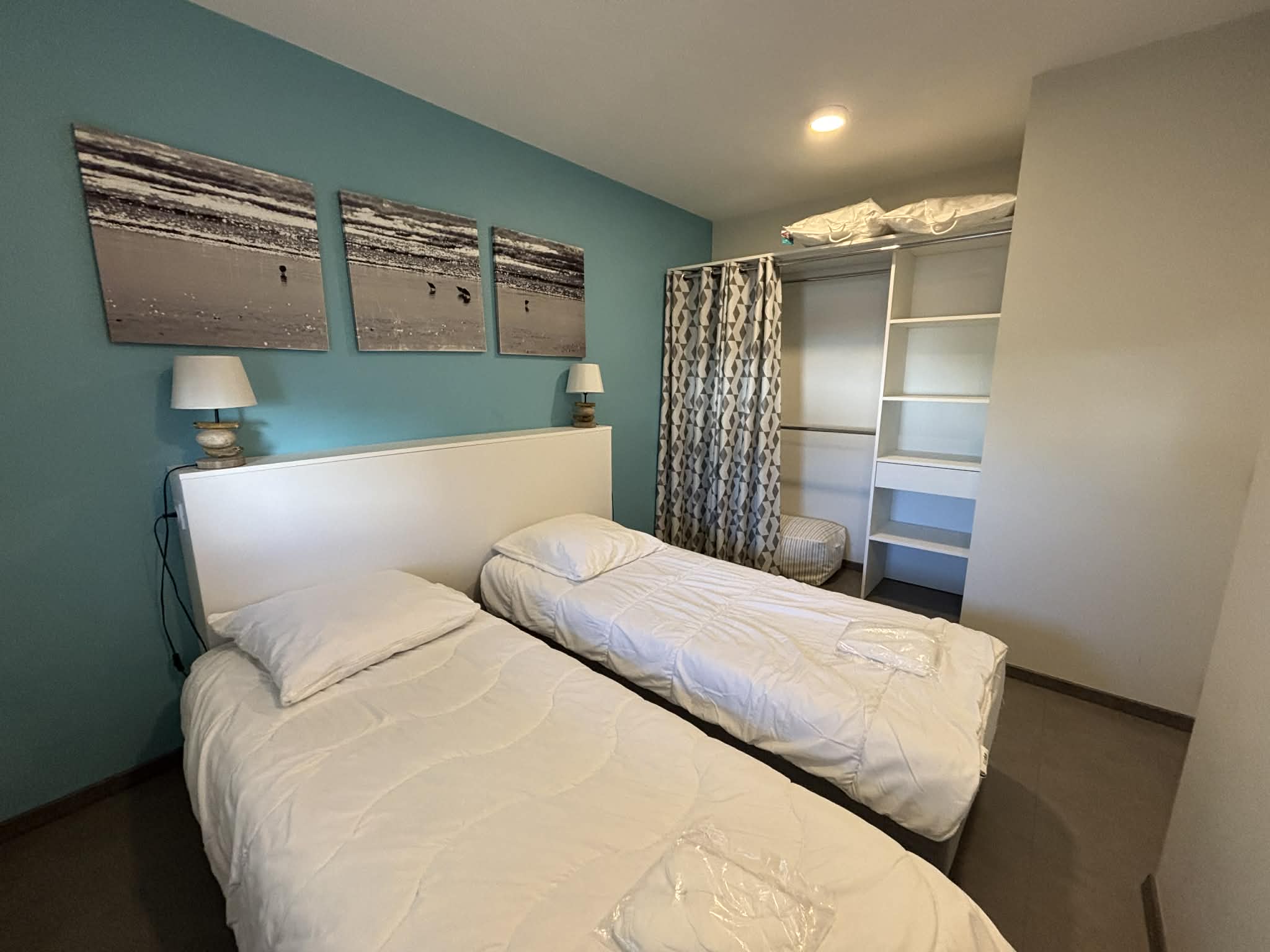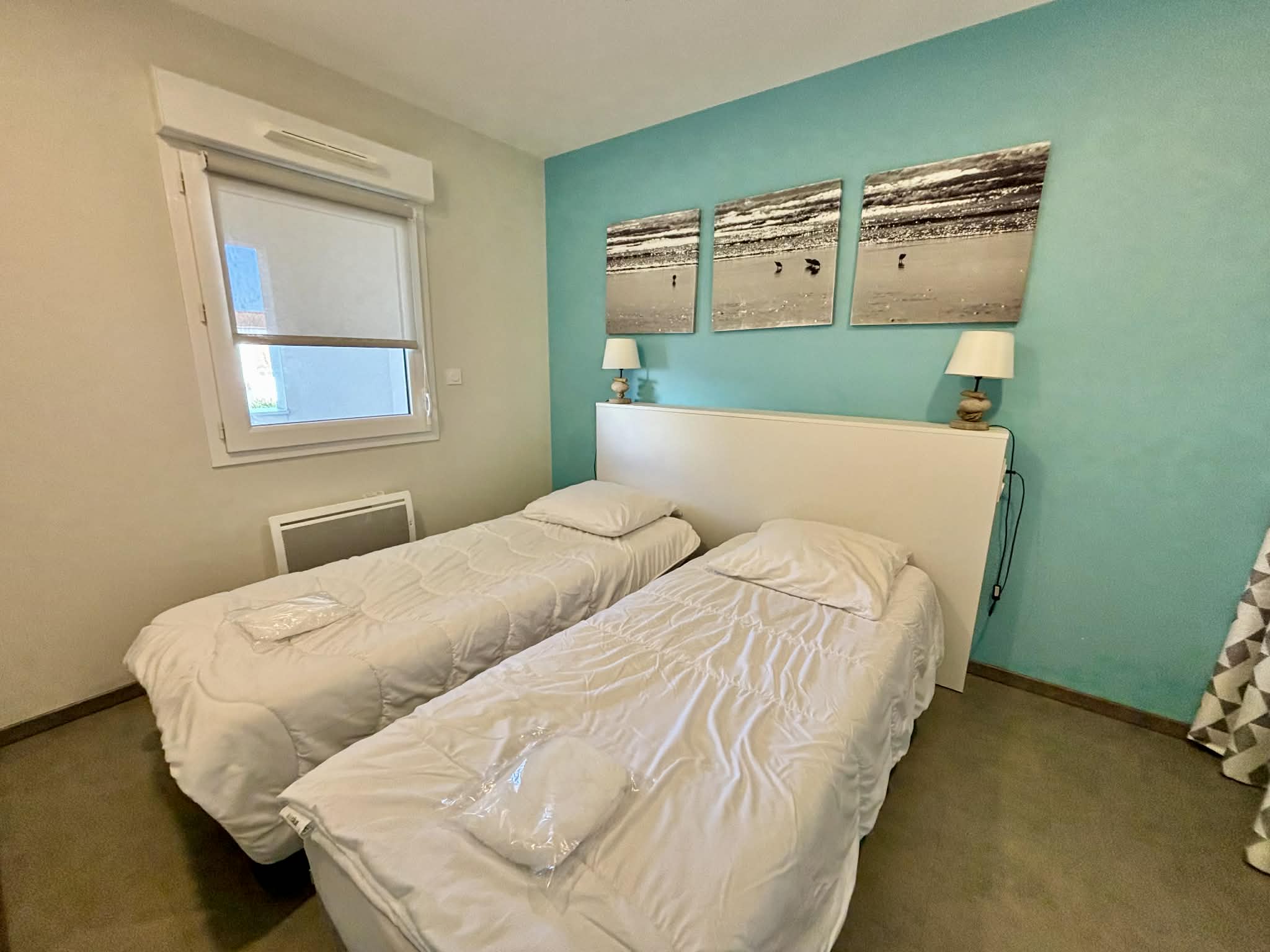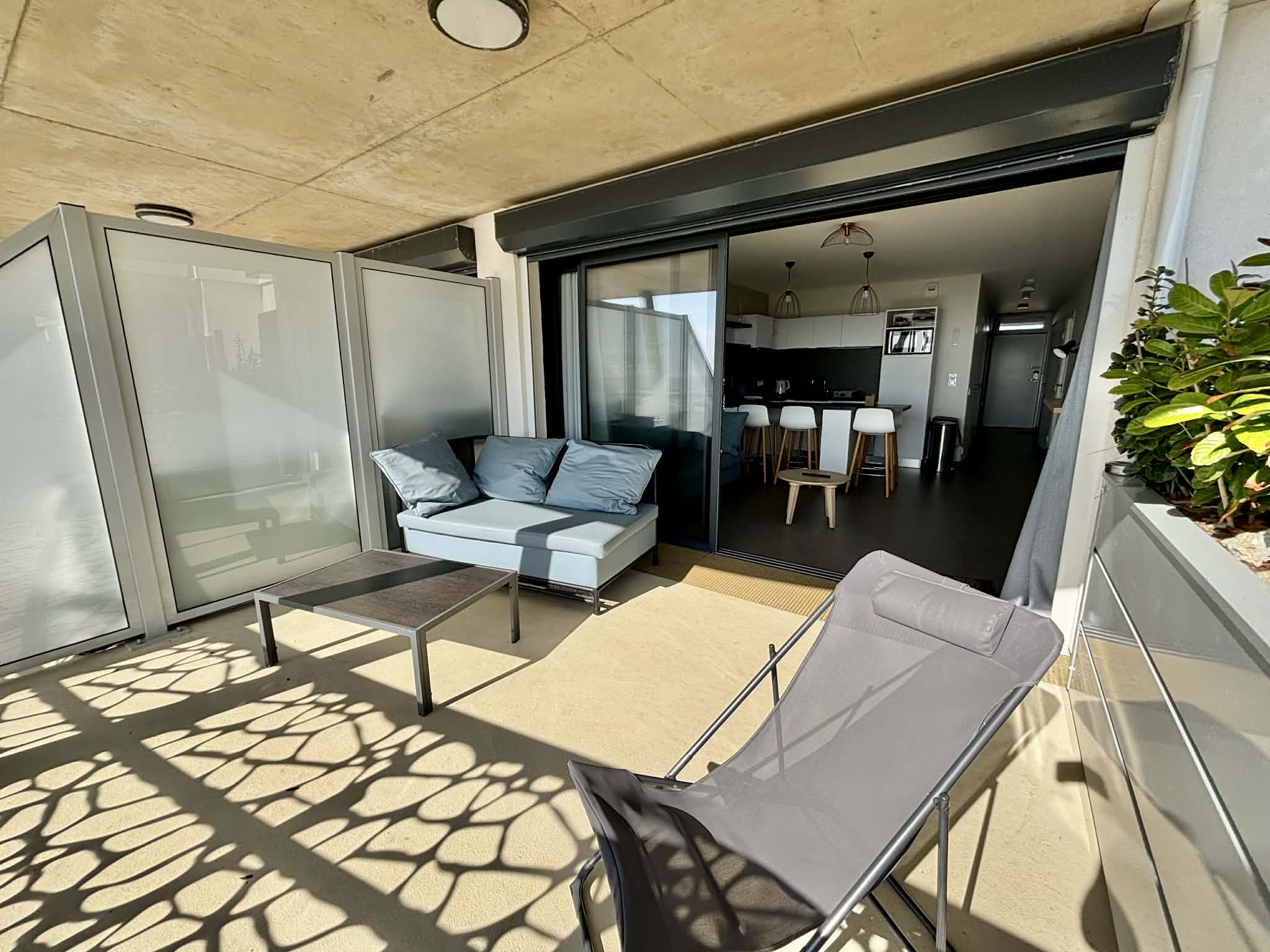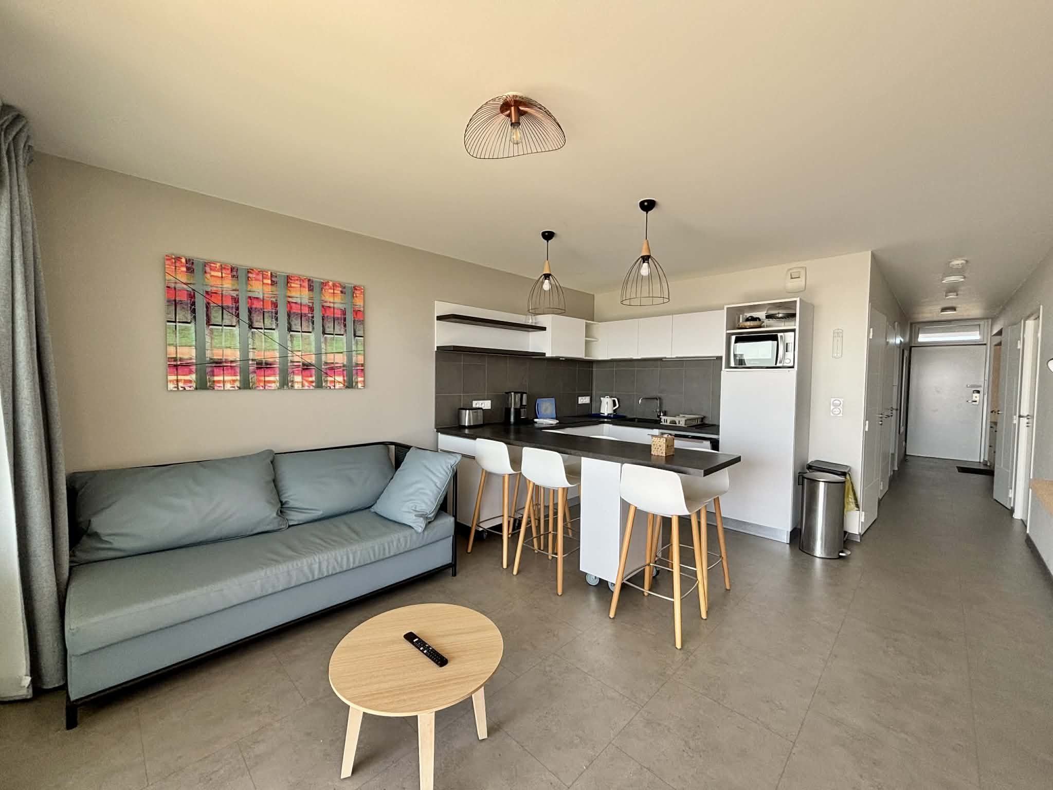 Il se compose d'une pièce de vie de 23m2 avec coin salon, canapé convertible en couchage 2 places, TV écran plat, d'une cuisine ouverte aménagée et équipée. D'une chambre avec 1 lit double en 160 et dressing, d'une seconde chambre avec 2 lits simples de 80 (pouvant se rapprocher) et dressing. D' une salle d'eau avec douche à l'italienne, d'un WC indépendant et d'un débarra. La pièce de vie bénéficie d'une large baie vitrée donnant sur un grand balcon de 15m2 avec canapé. Commerces et restaurants à 50m, plage devant la résidence.