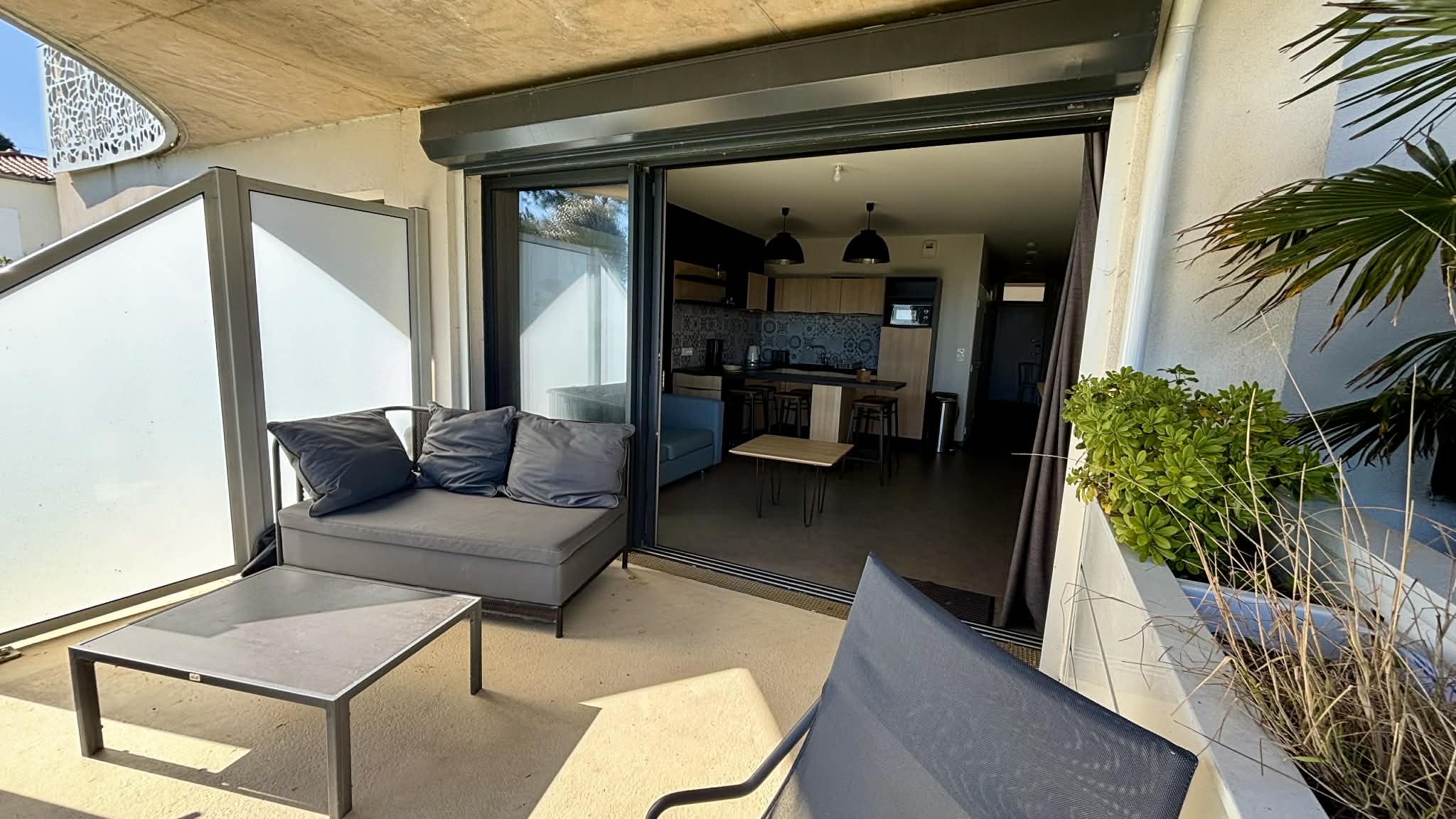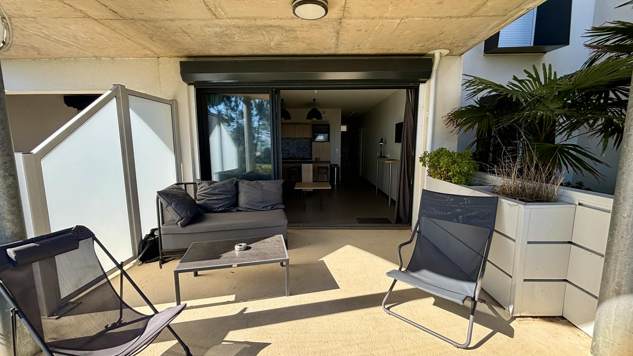Terrasse en rez de jardin avec canapé, chilienne, table et chaises pour les repas.