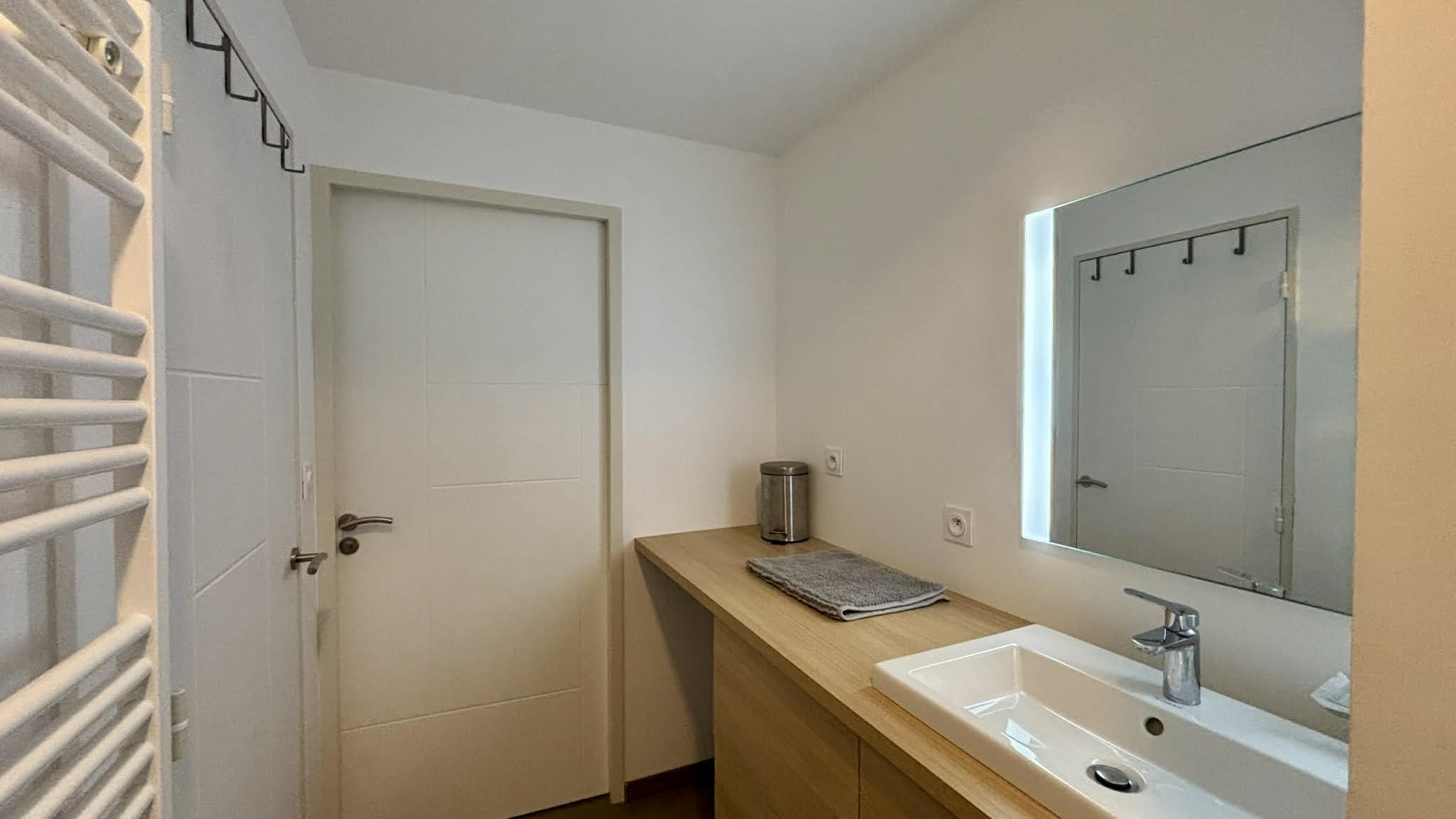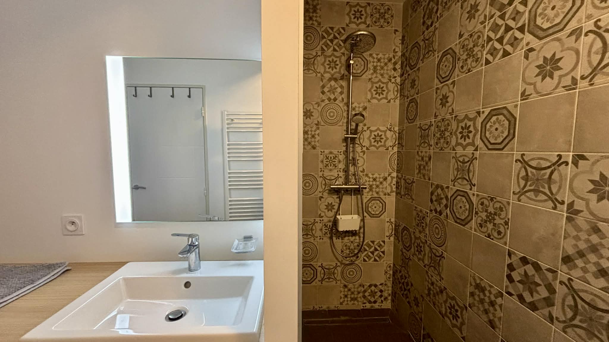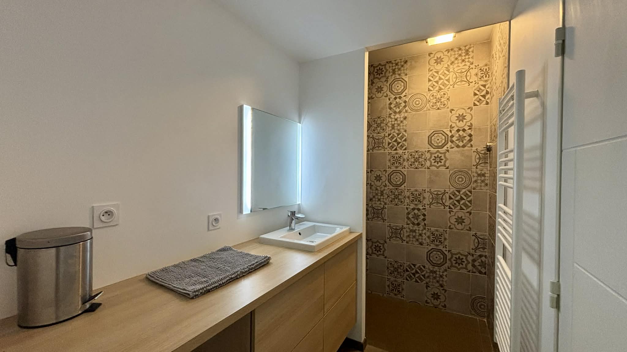 Salle d'eau avec douche à l'italienne, meuble vasque, sèche-serviette,