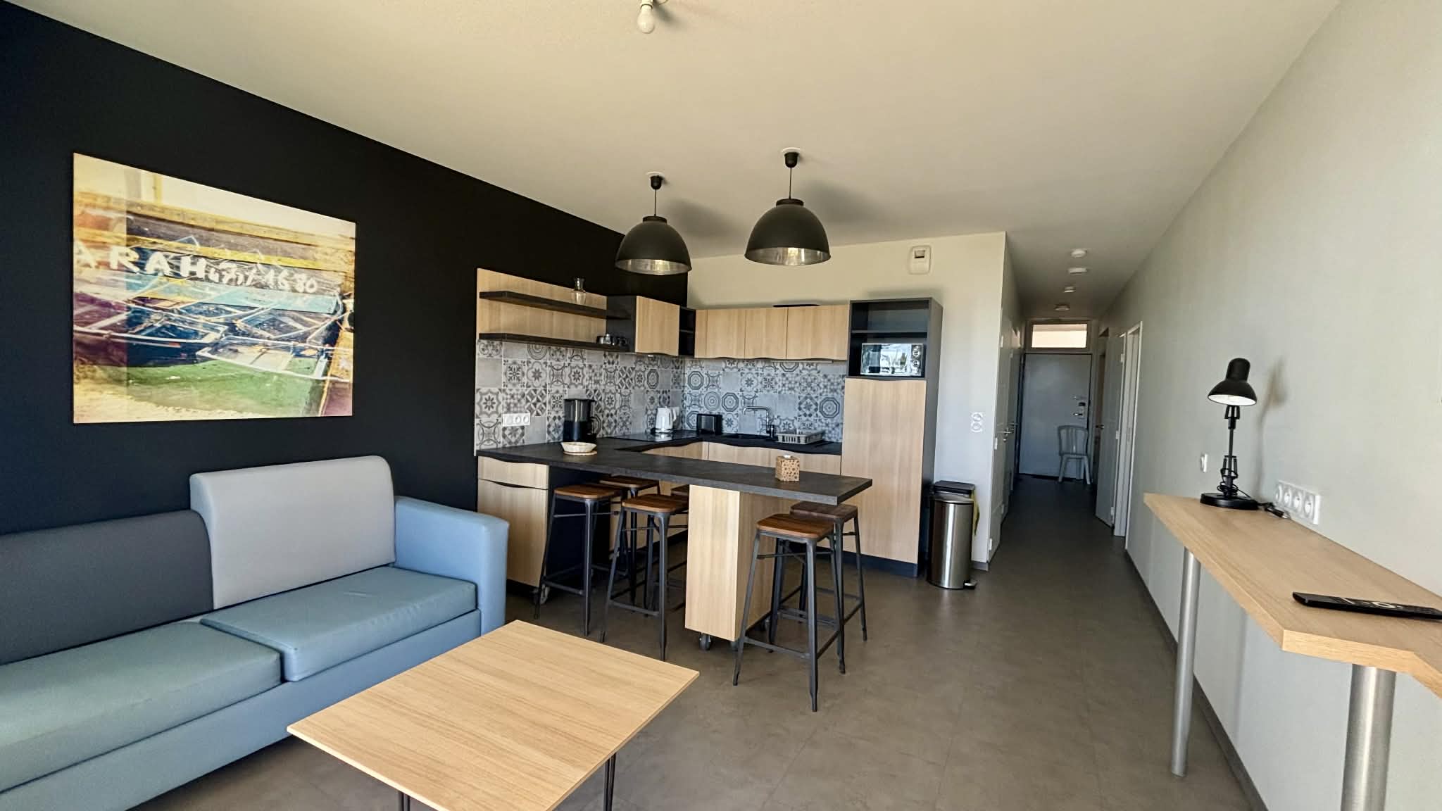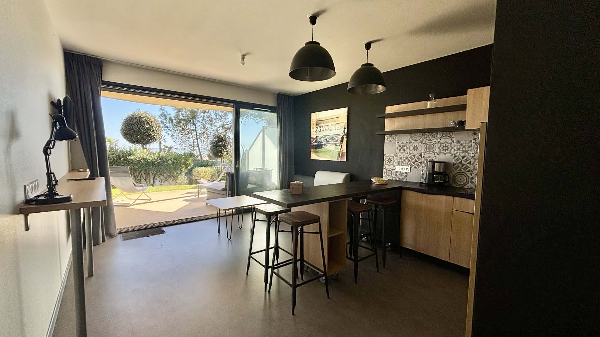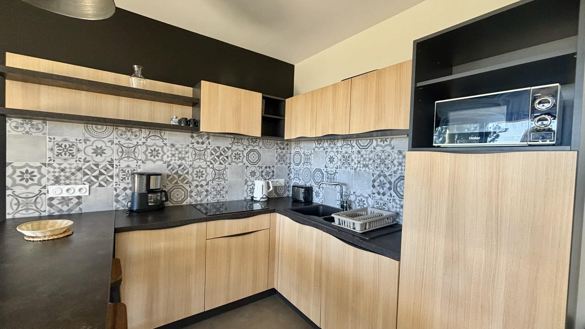 Cuisine équipée et aménagée ouverte (micro-ondes multifonctions, réfrigérateur/freezer, plaque induction, cafetière à filtre, grille-pain, bouilloire),
