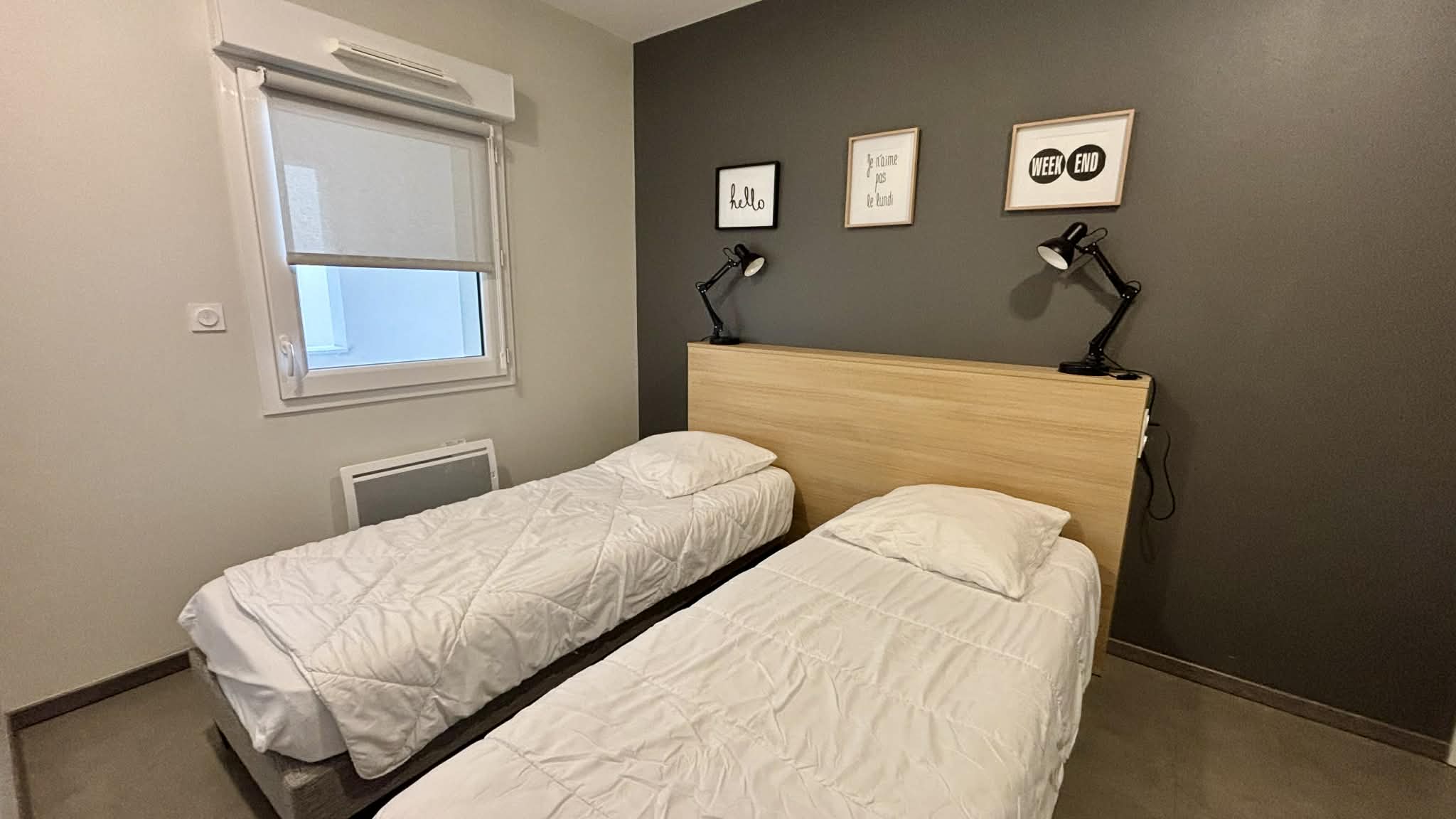 Une chambre avec deux lits de 80 pouvant se rapprocher pour faire un lit en 160 et dressing,