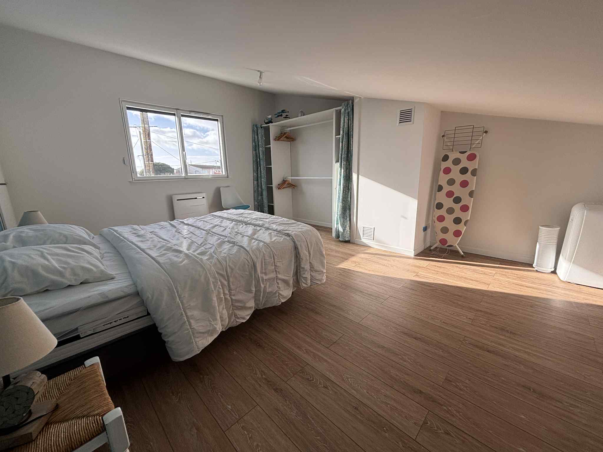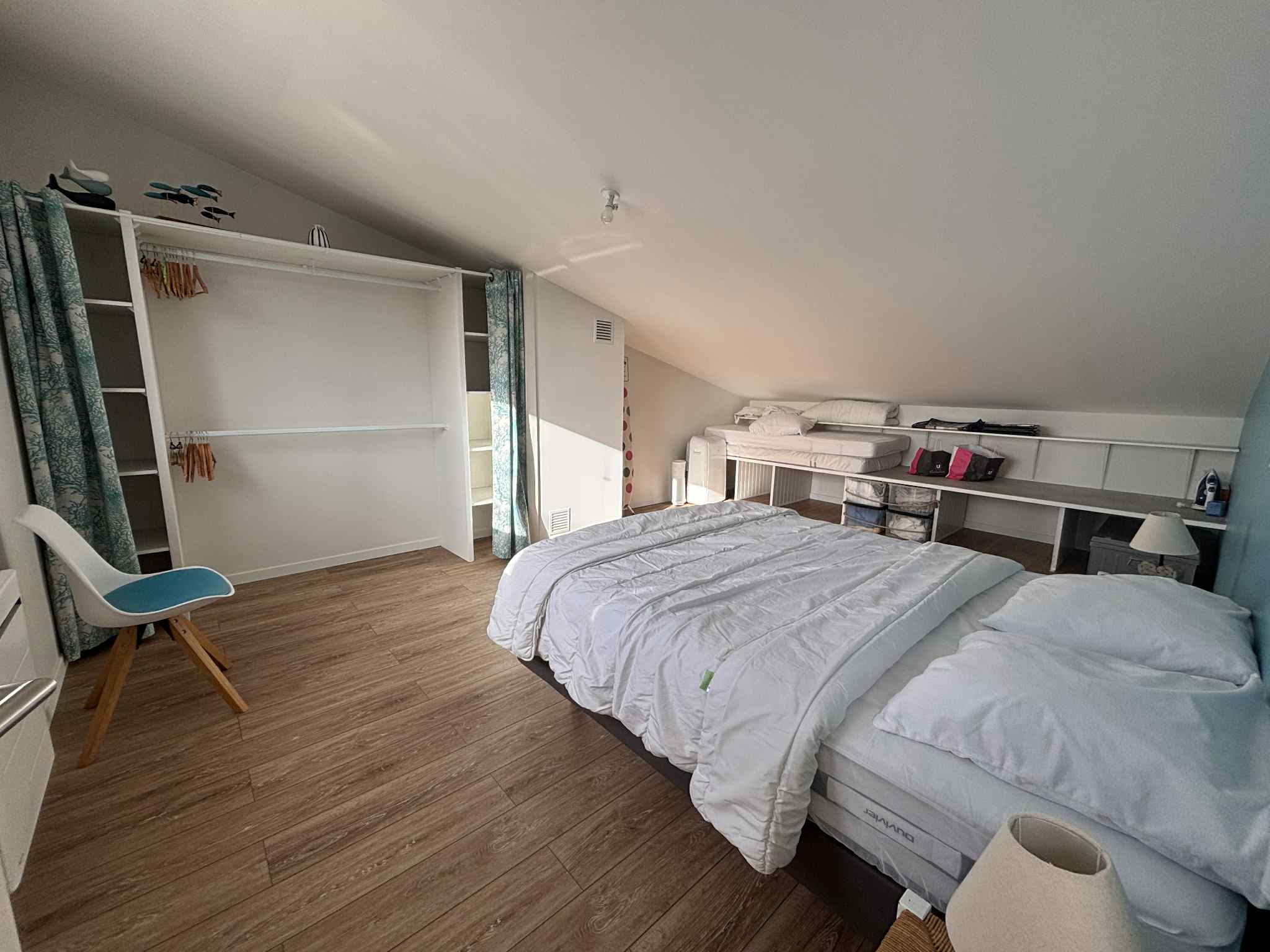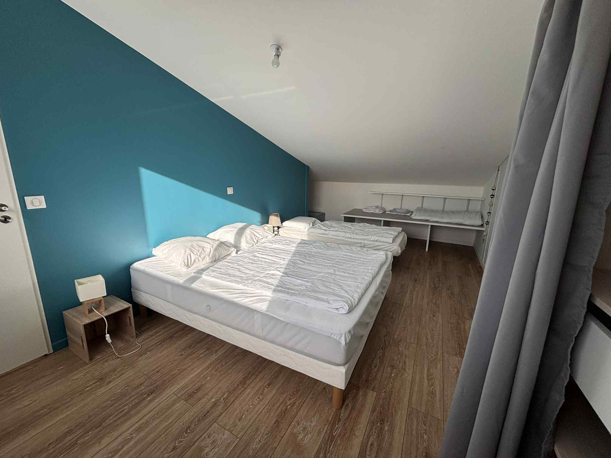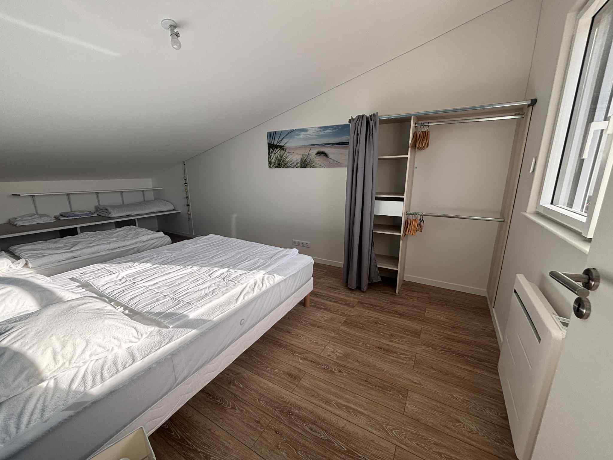 Une chambre avec un lit de 160, un lit de 90 et rangement,