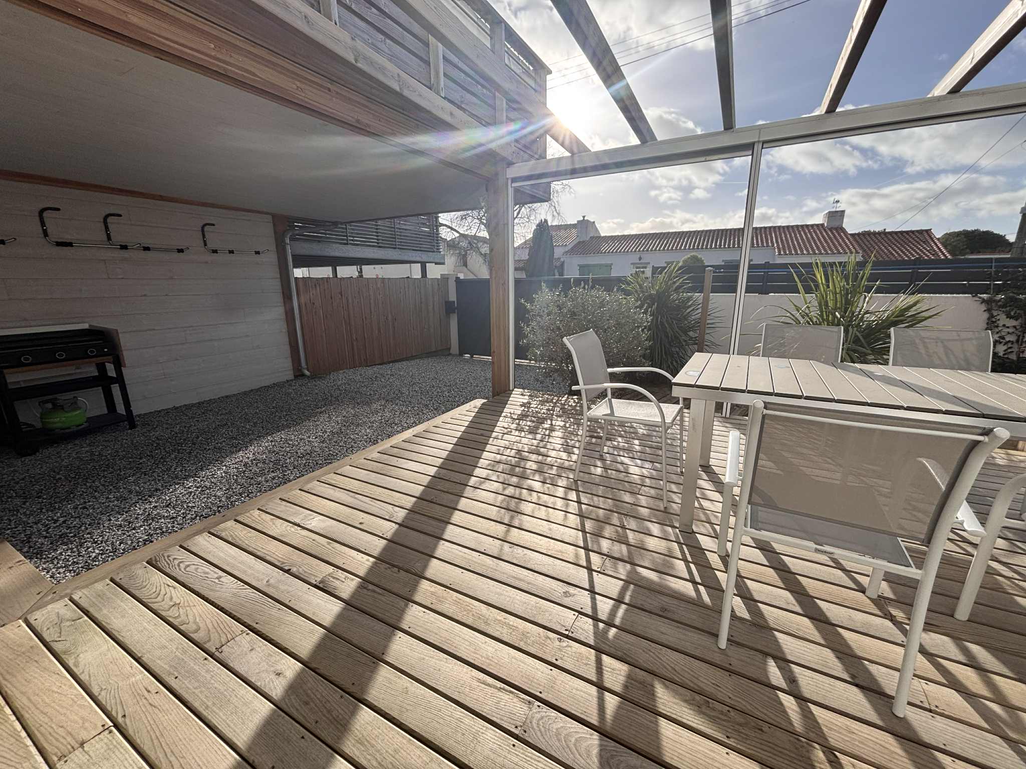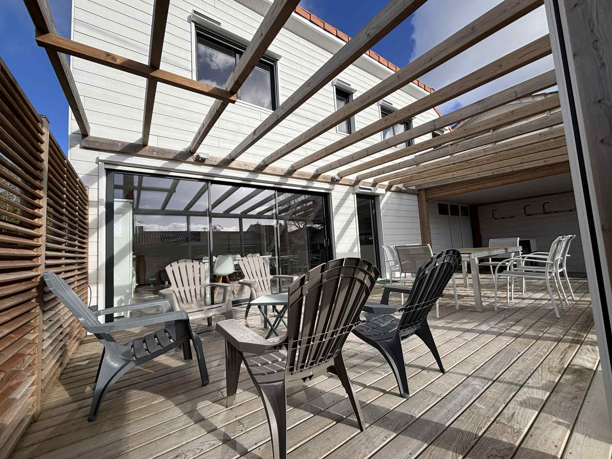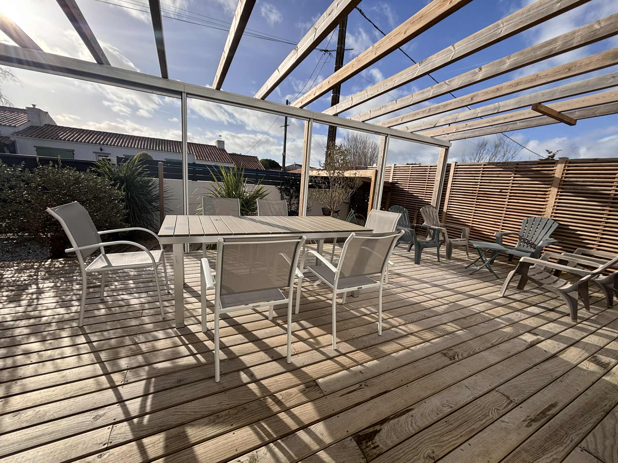 Terrasse en bois avec salon de jardin, bain de soleil et plancha,