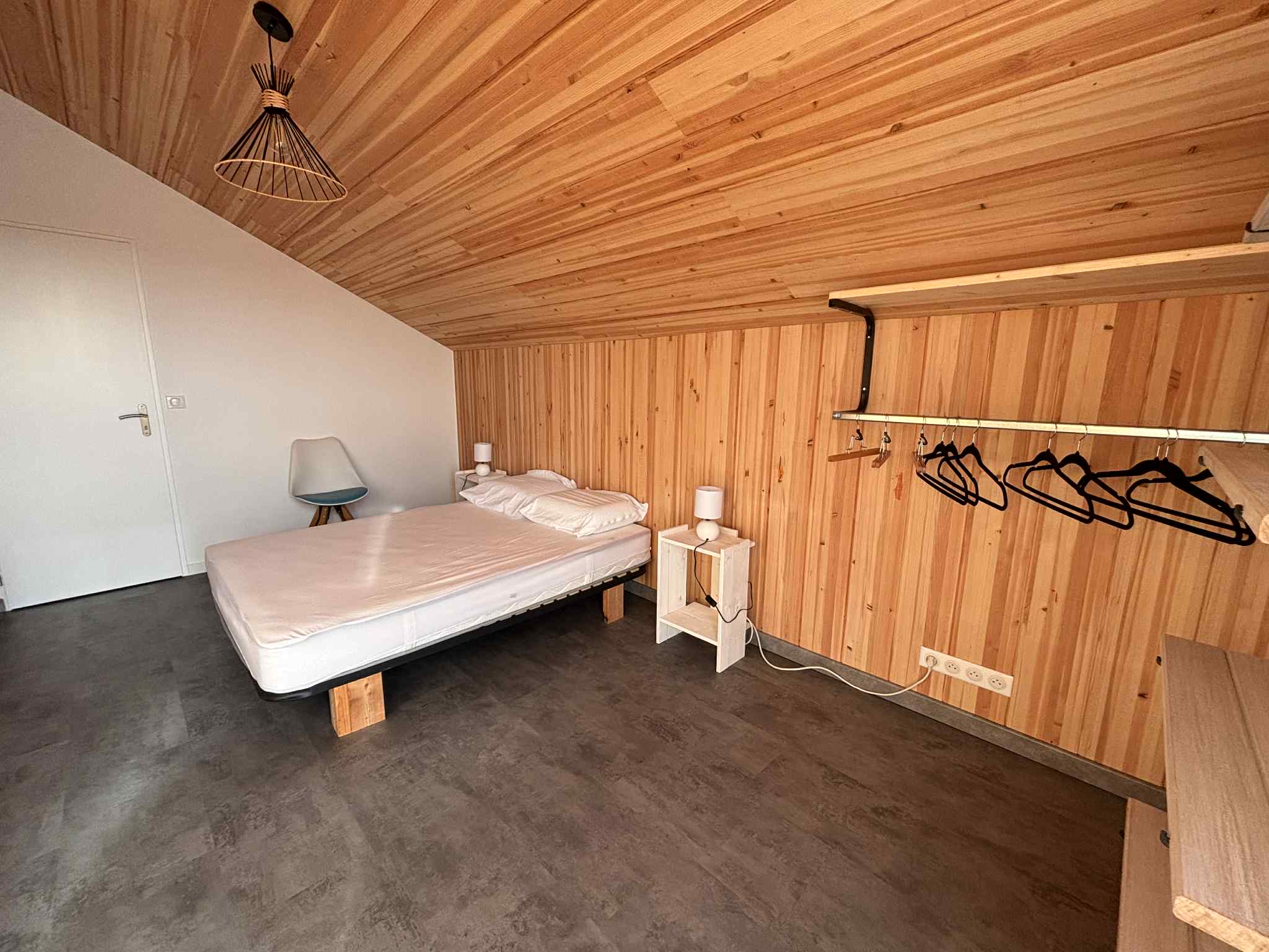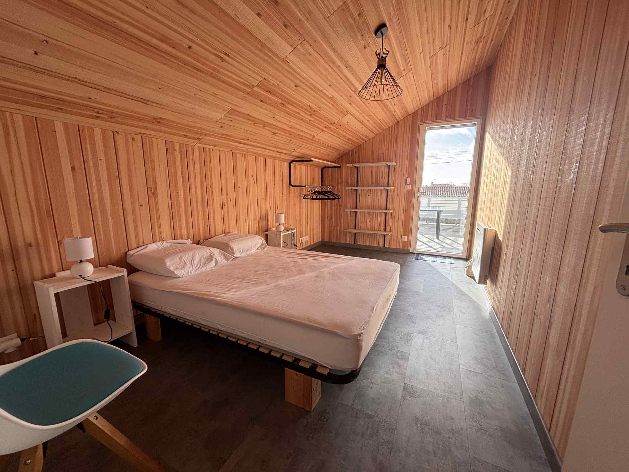 Une chambre avec un lit en 140 et accès à une terrasse,