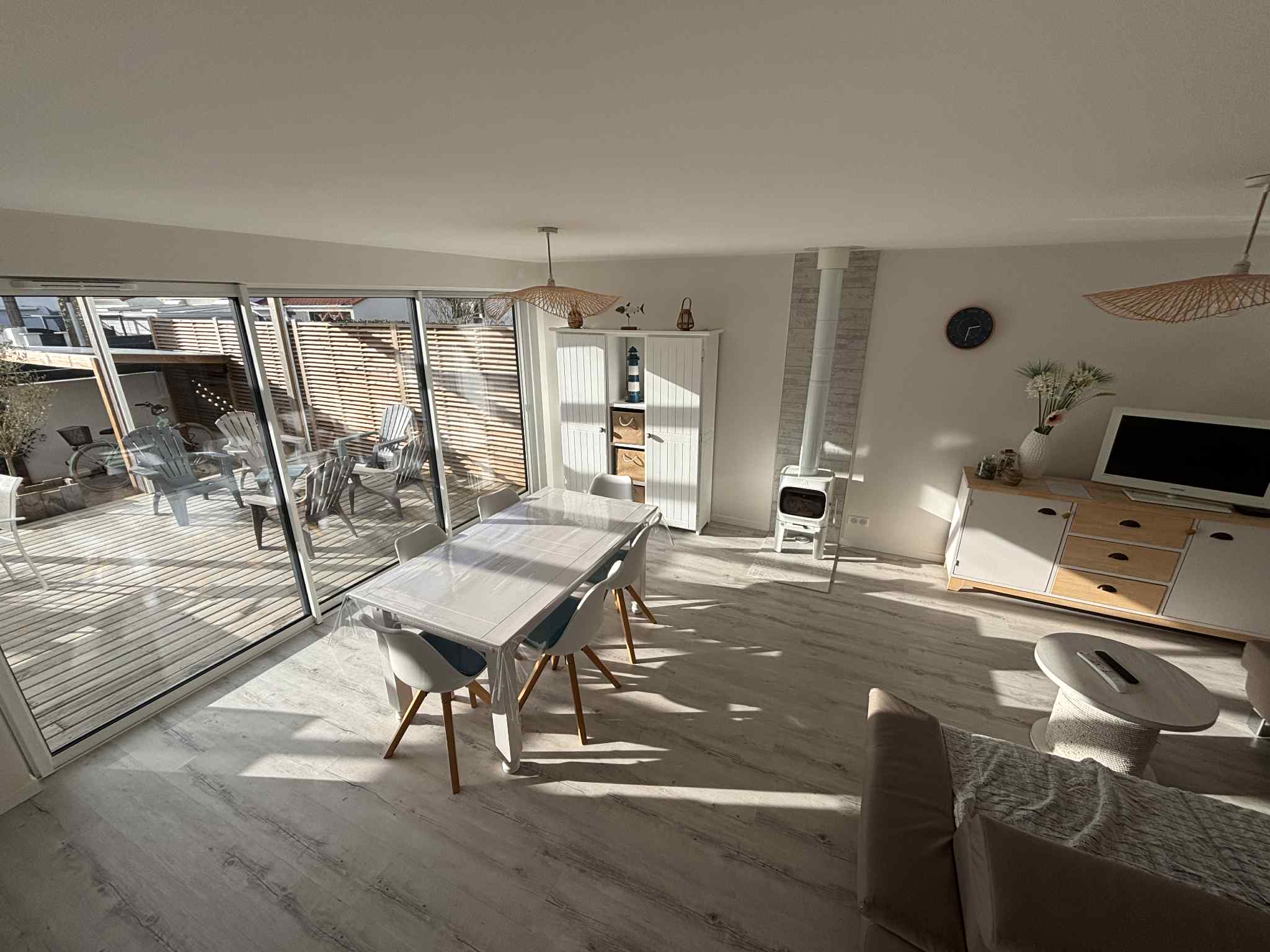 Séjour avec table pour les repas, coin salon avec canapé et télévision écran plat, accès Wifi,