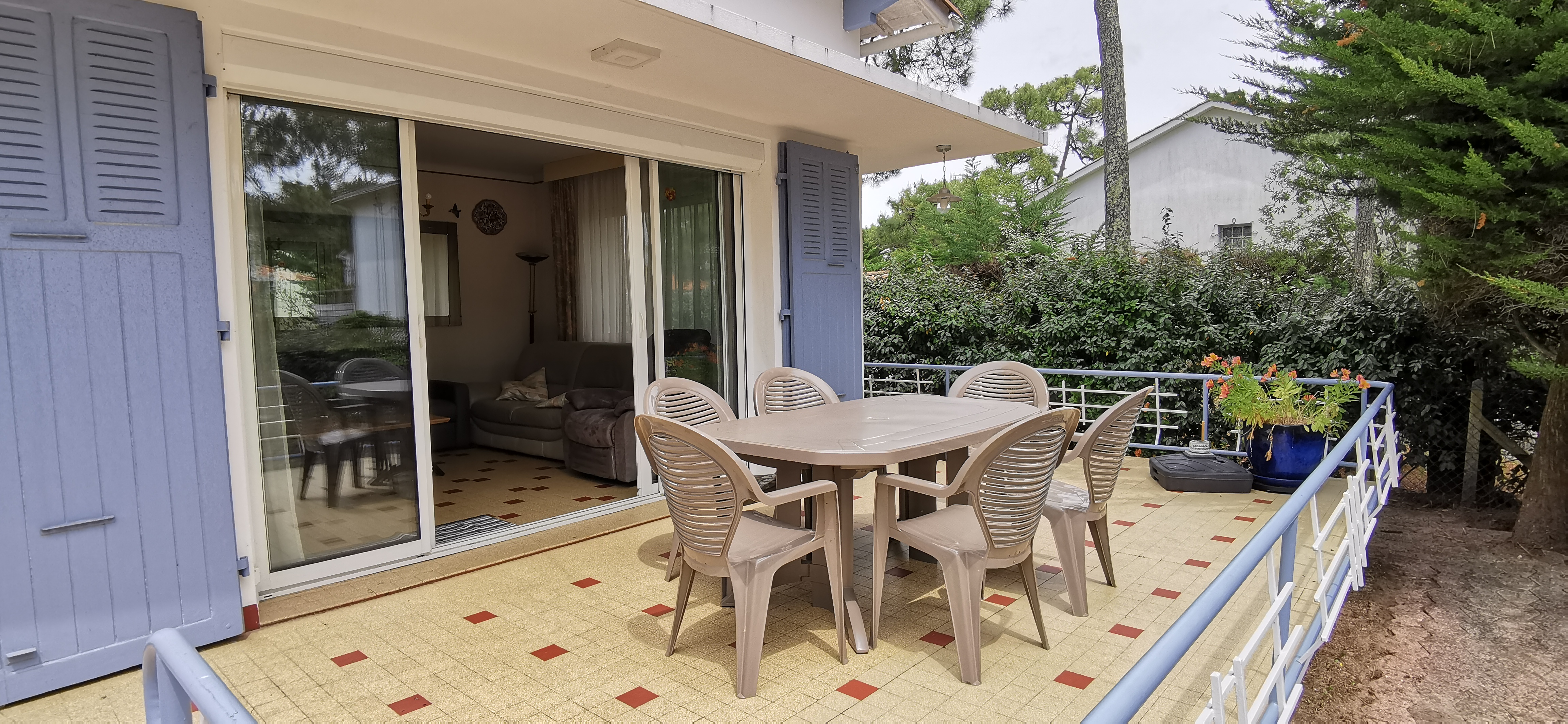 Terrasse avec salon de jardin. Terrain clos boisé de pins.