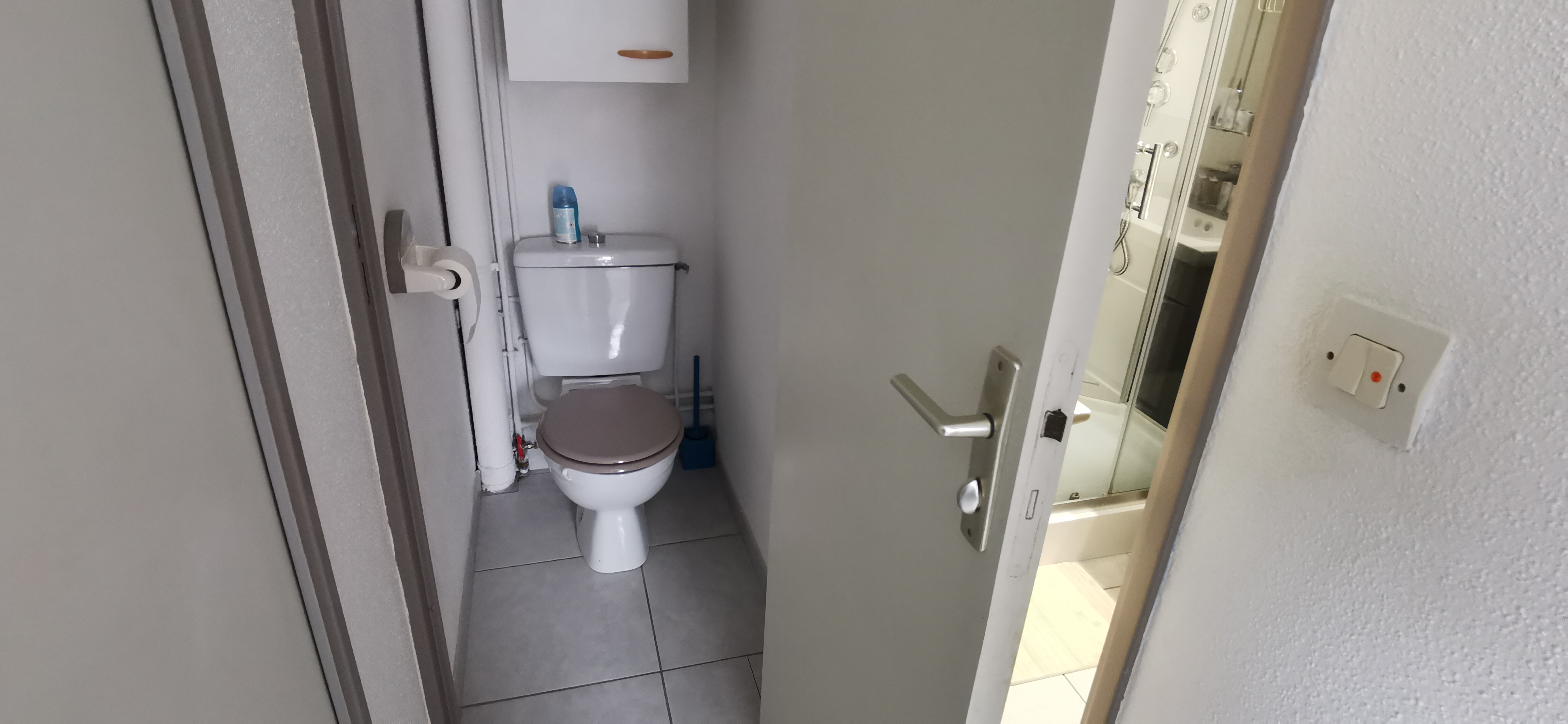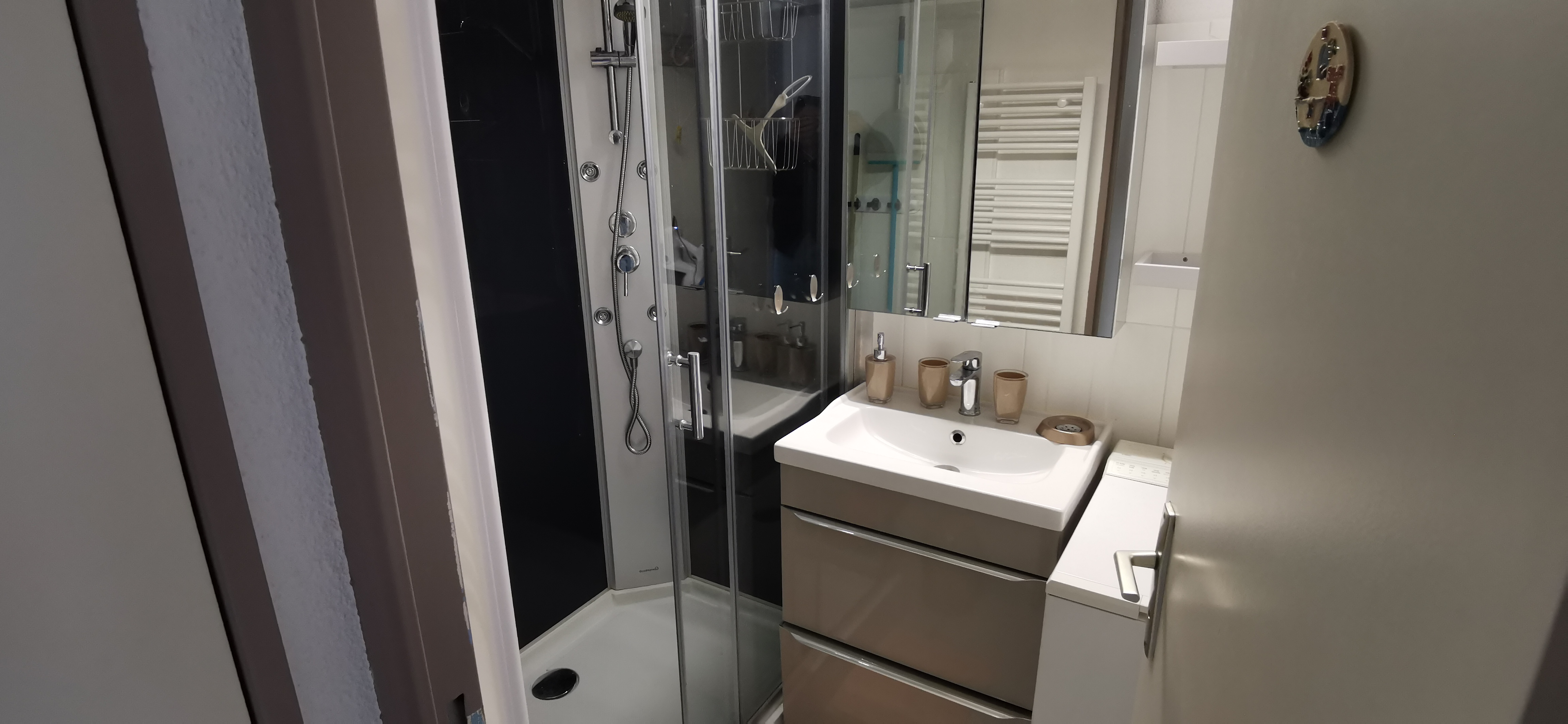 Une salle d'eau avec la machine à laver. WC séparé.
