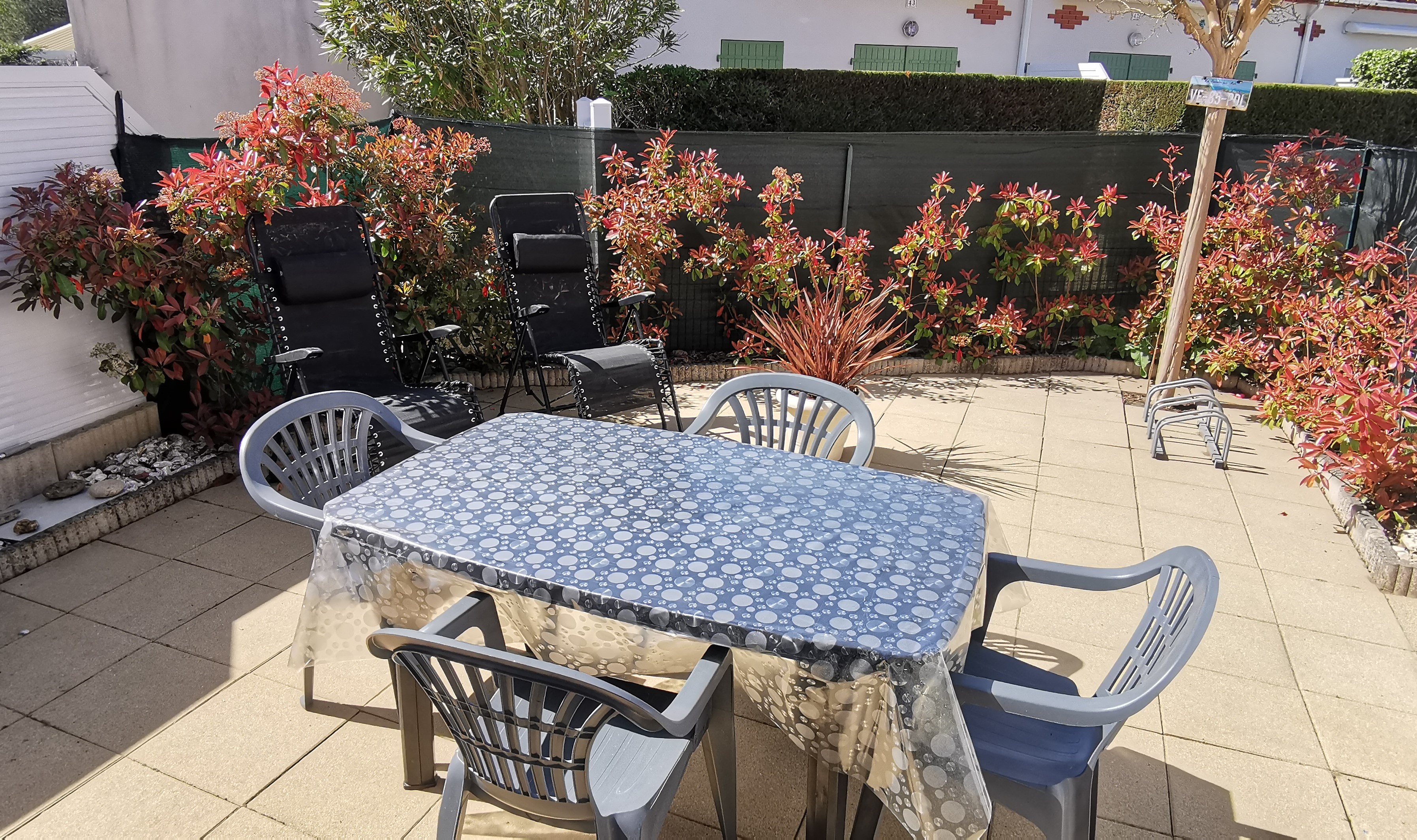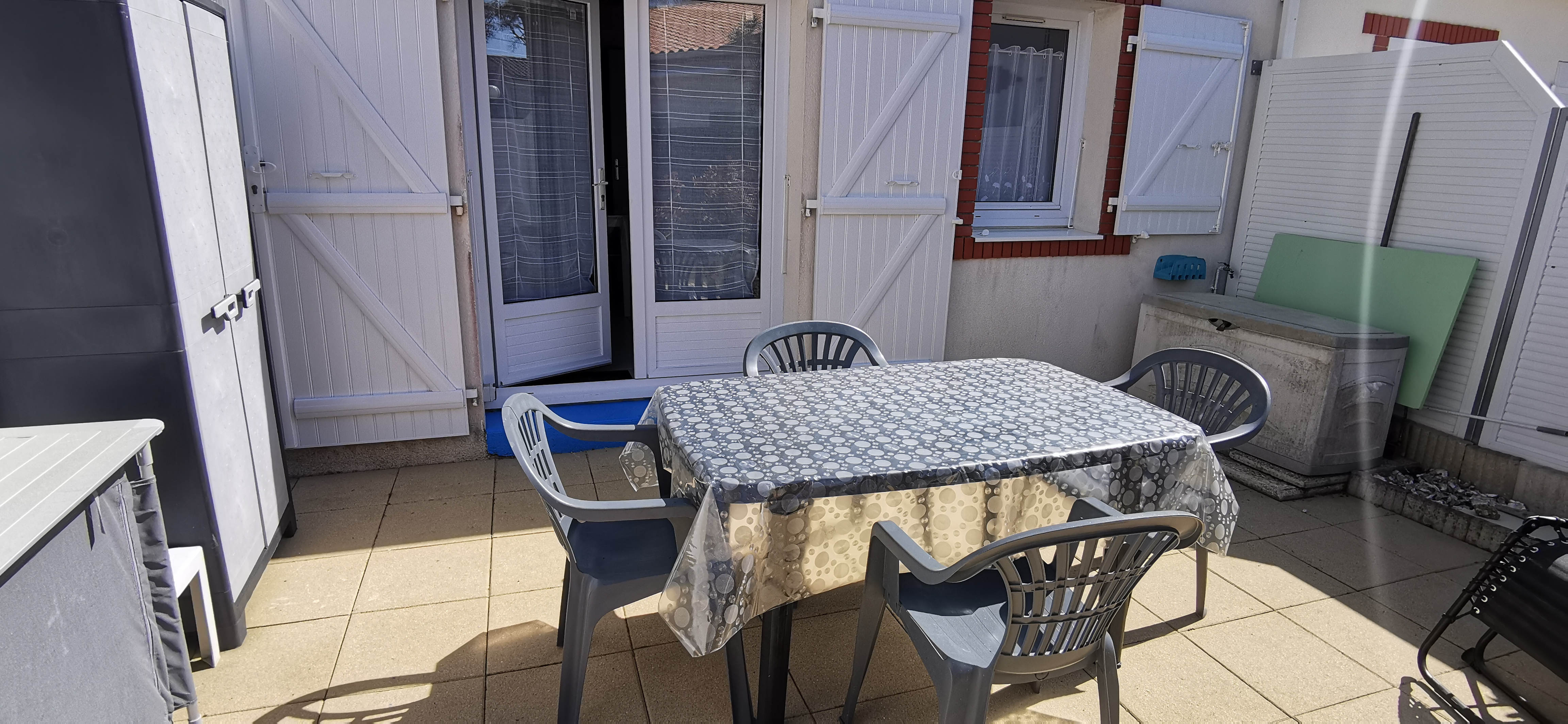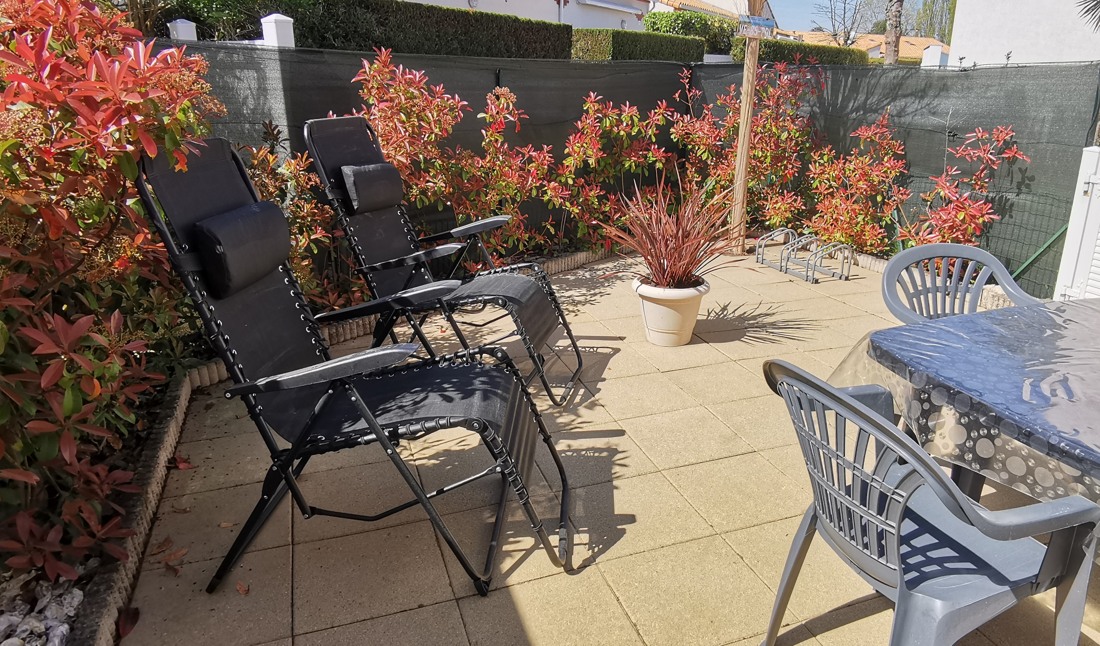 Petit extérieur avec une terrasse avec son mobilier de jardin, un store banne manuel.